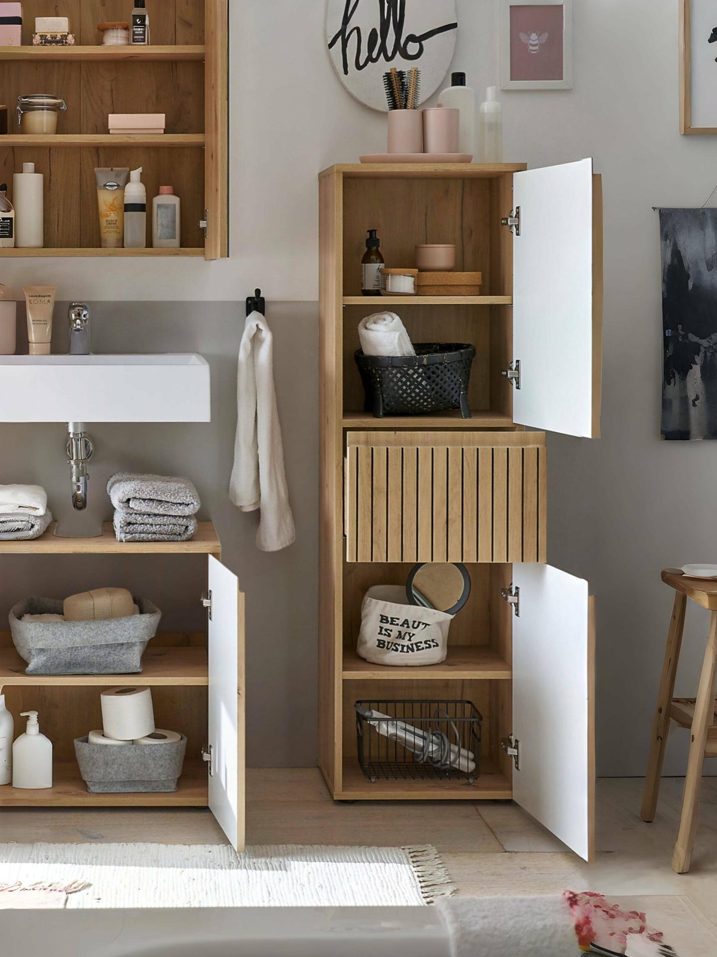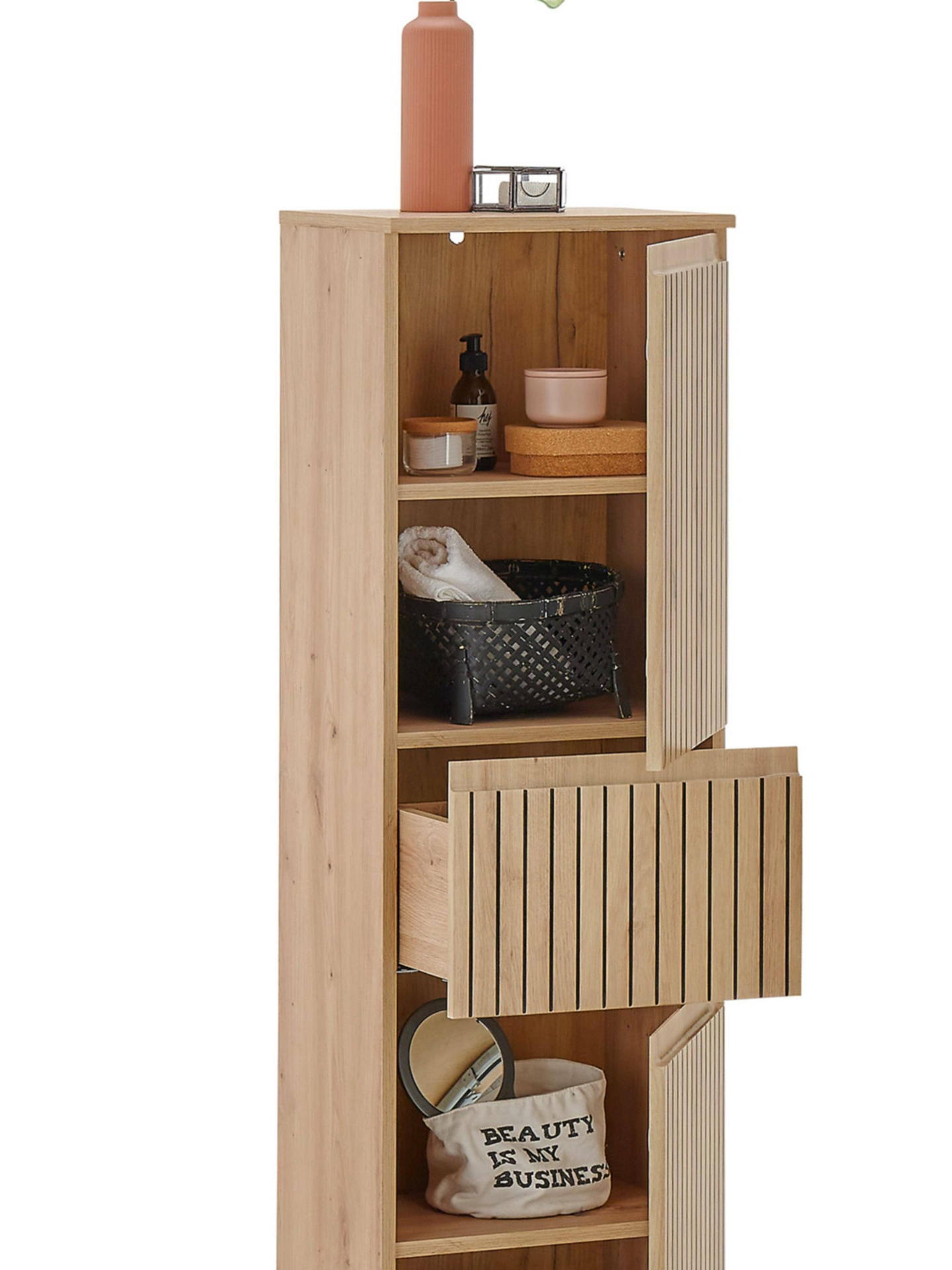 With its sleek design and ample storage space, the Austin 2 Door & 1 Drawer Narrow Cabinet is an essential addition to any bathroom looking for both style and substance. Its clean lines and natural wood finish make it a standout piece, while the generous interior provides a haven for all your bathroom necessities. Featuring two spacious cupboards with four shelves, this highboard offers versatile storage for everything from beauty products to bath linens. A beautiful pull-out drawer, complete with discrete handles, adds an elegant touch and makes accessing smaller items effortless. This thoughtful design brings a seamless blend of functionality and contemporary charm to your bathroom space.