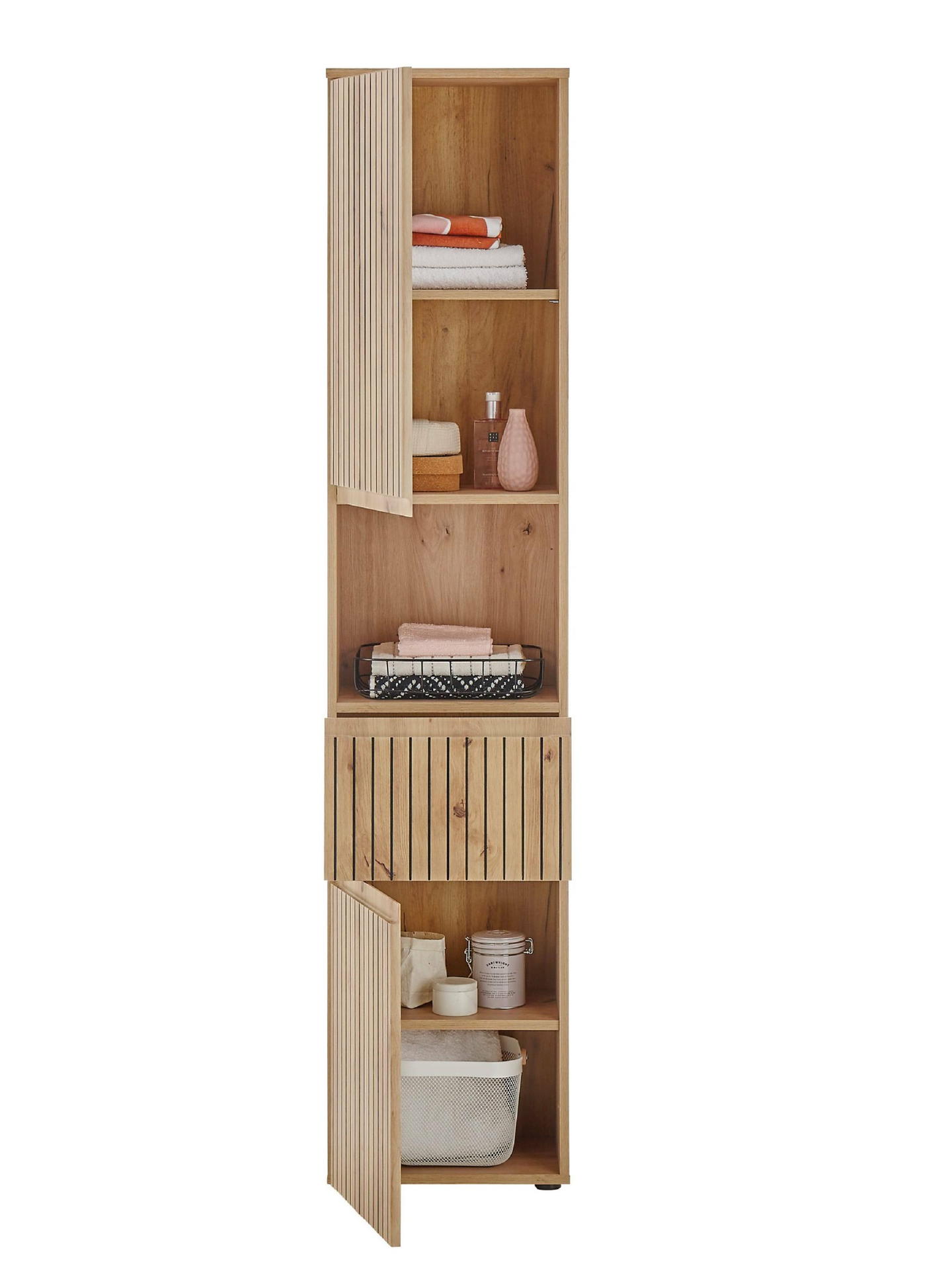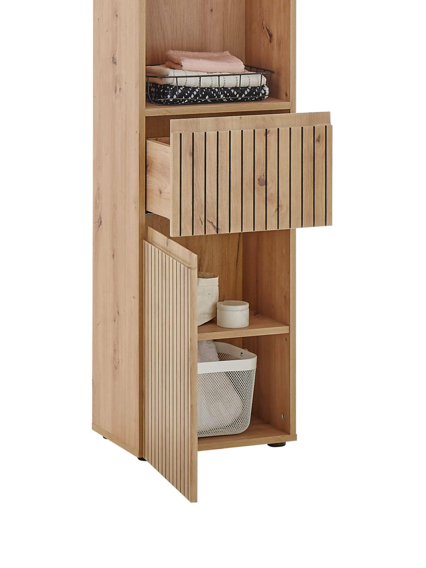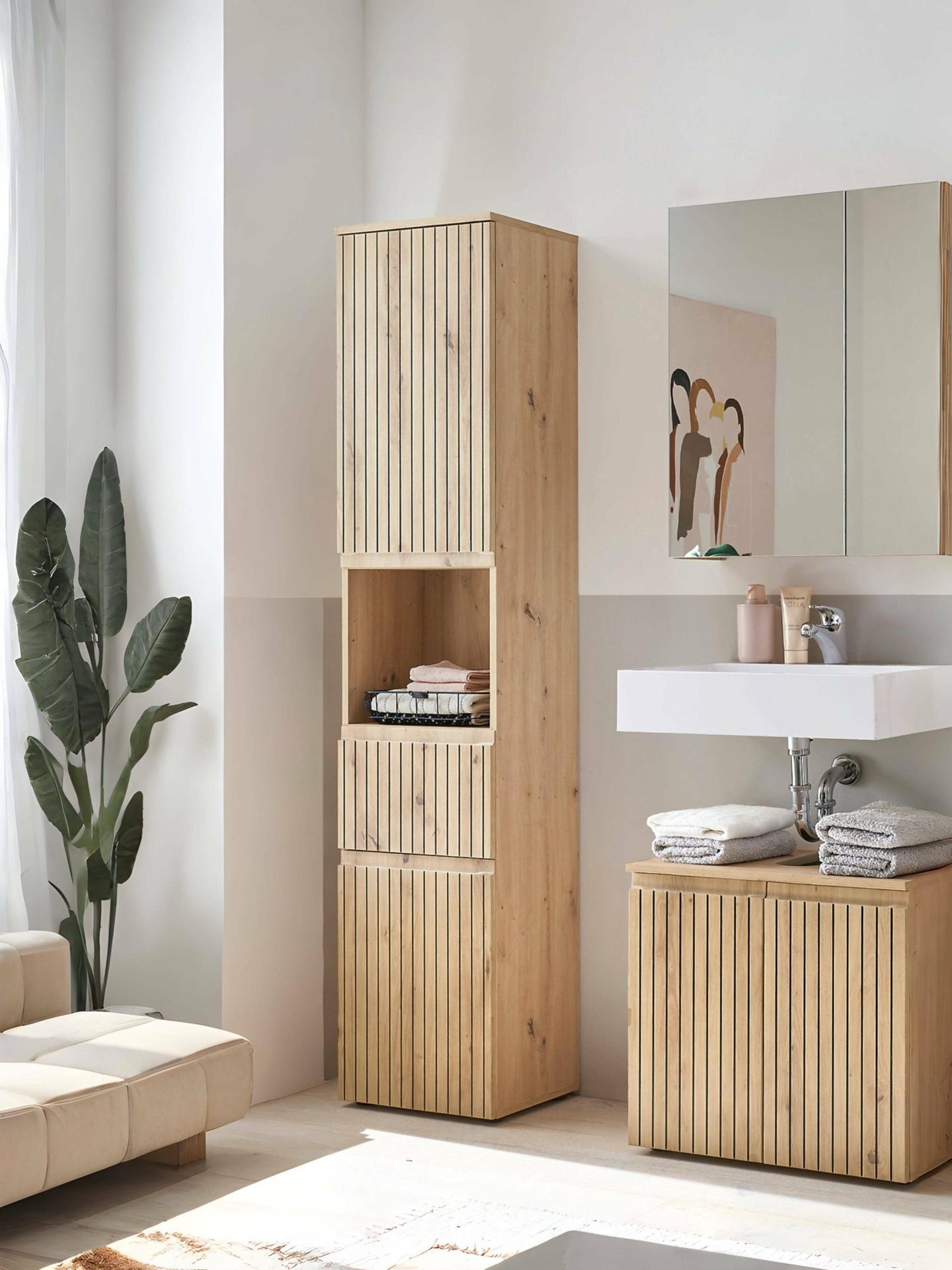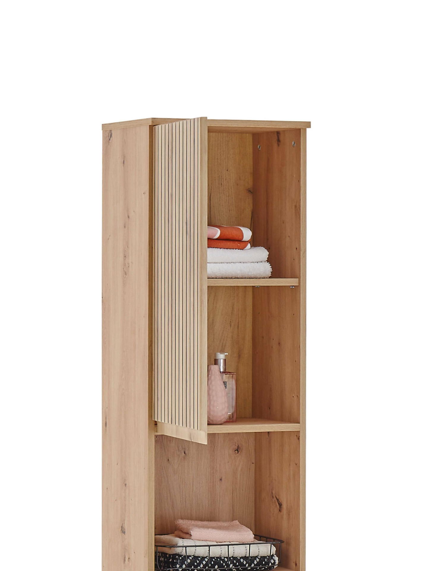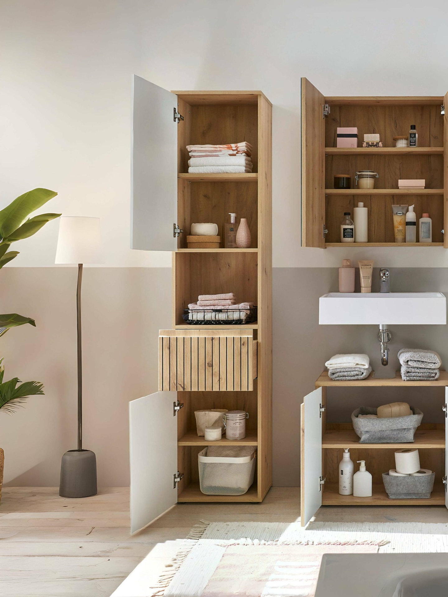 Elevate your bathroom with the Austin Tall Cabinet, a perfect blend of rustic charm and modern design. Its natural wood tones and sleek, slatted detailing create a warm, inviting atmosphere. With two spacious cupboards and four ample shelves, you can neatly organise towels, toiletries, and other essentials. The elegant pull drawer, complete with a discrete handle, provides a sophisticated touch and makes accessing smaller items effortless. While the open middle compartment is perfect for showcasing folded towels or decorative baskets. Perfect for those who appreciate both elegance and practicality, this cabinet brings a timeless, stylish upgrade to your bathroom décor.
