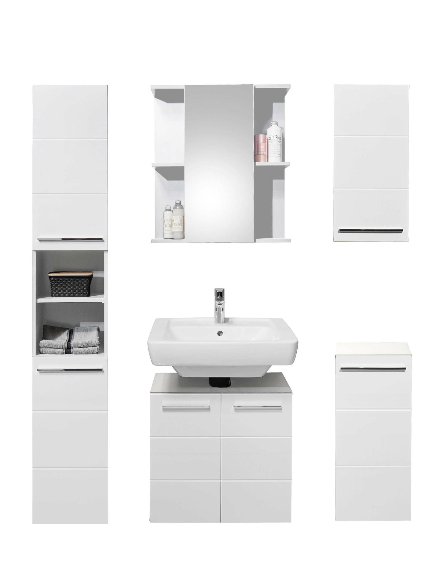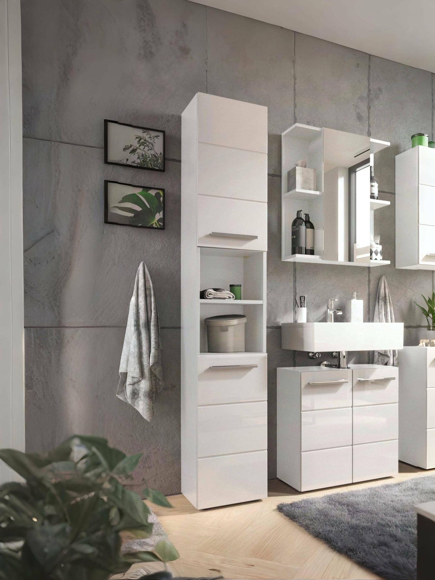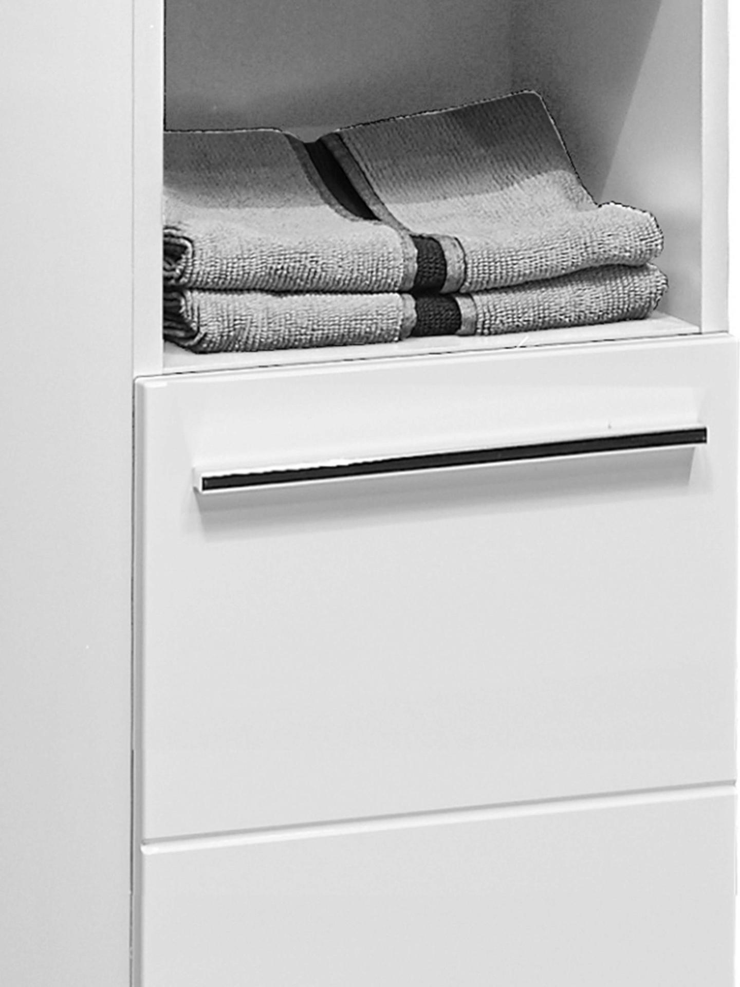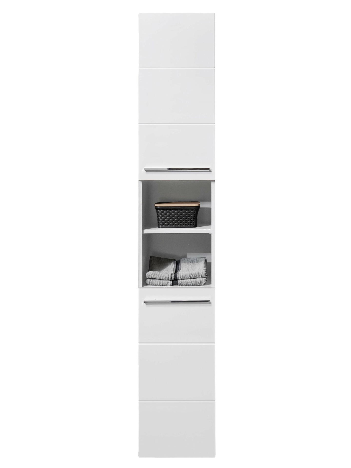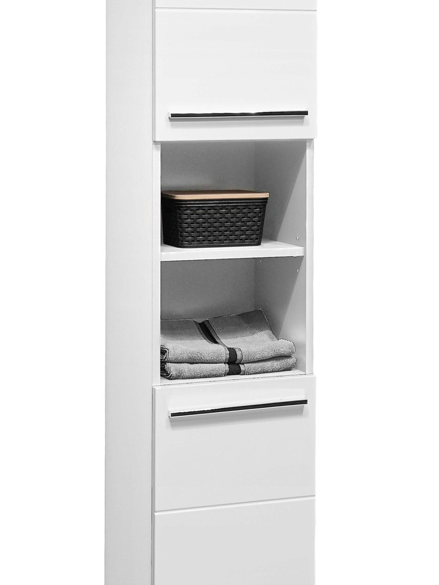 Enhance your bathroom organisation with the Mandy Tall Unit in a sleek white gloss finish. This elegantly designed cabinet features a horizontal notches design that adds a touch of sophistication to your space. With two spacious cupboards and four shelves, you’ll have ample room to store everything from toiletries to linens, keeping your essentials neatly tucked away. The two middle compartments are perfect for showcasing your favorite decorative items or neatly folded towels, creating a beautiful focal point in your bathroom. Enhanced by sleek long silver handles, this unit combines style and functionality effortlessly.