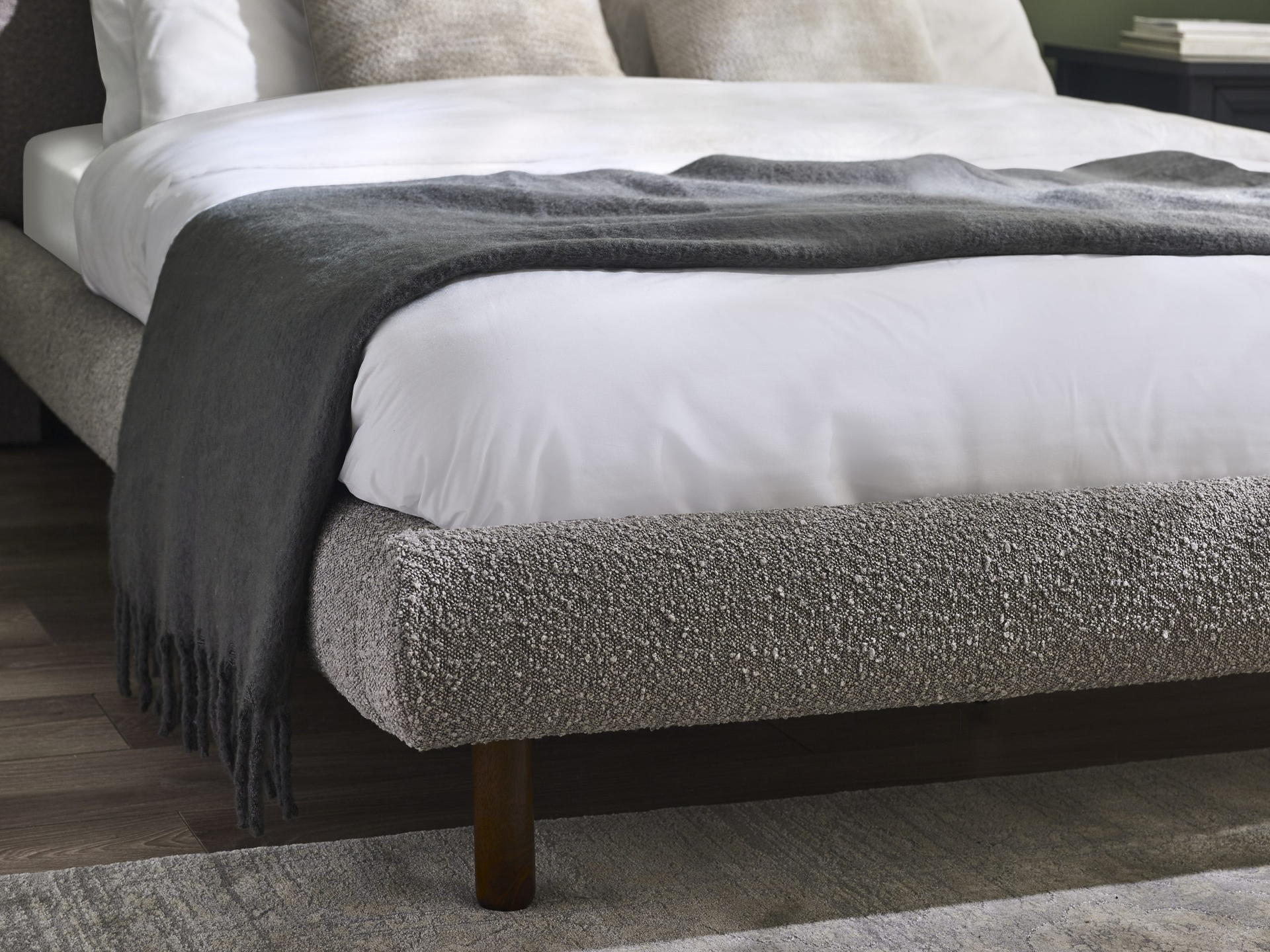 Experience opulence and comfort with the premium grey bouclé upholstery, creating a soft and inviting texture.