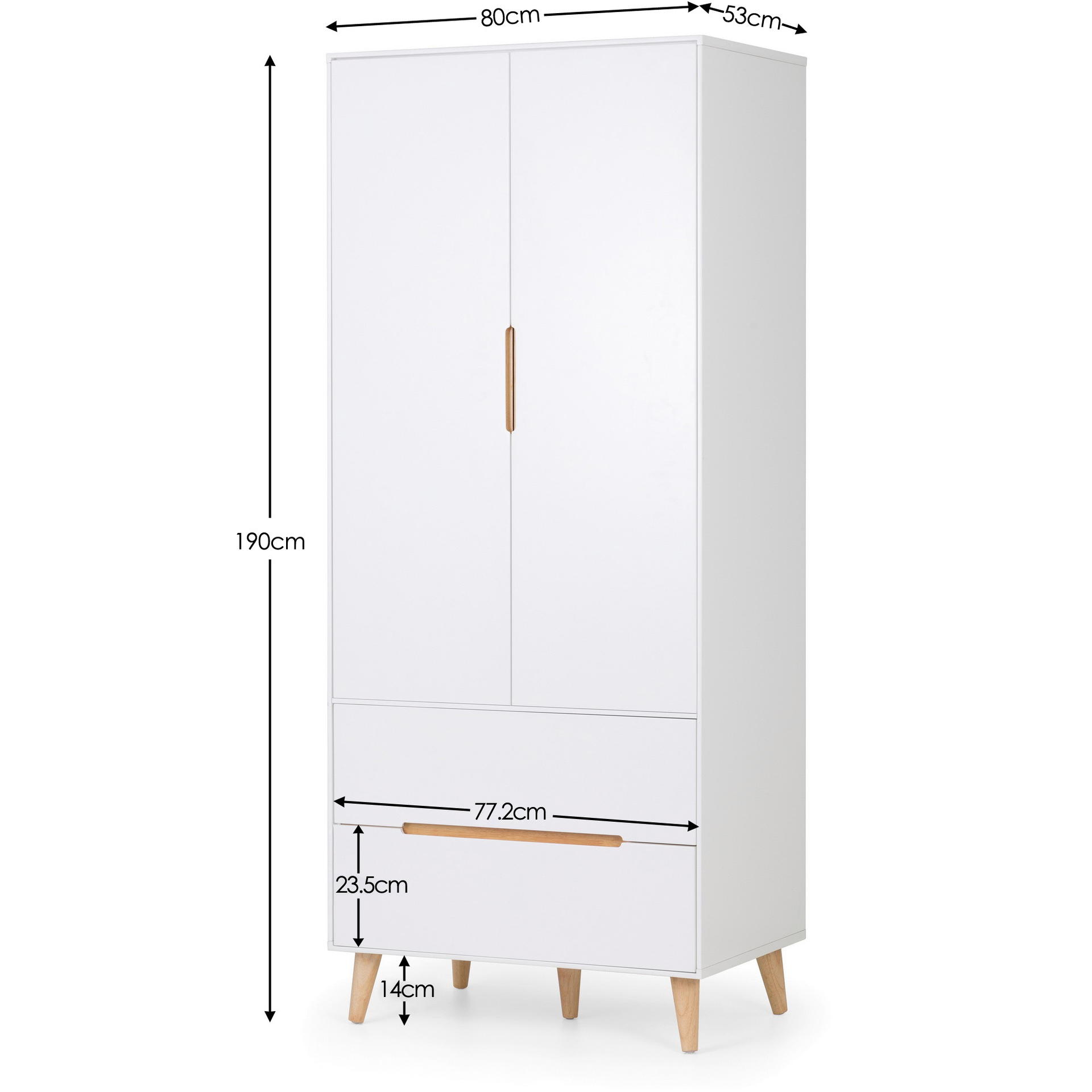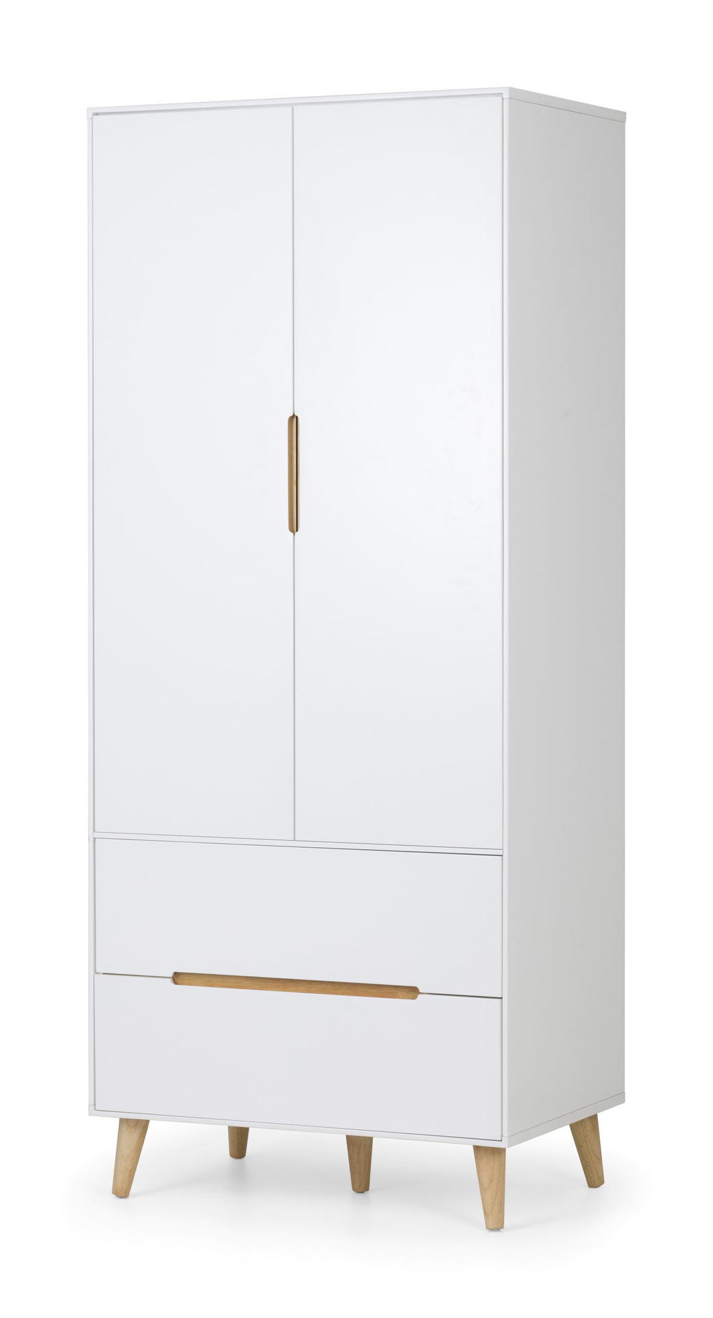A stylish, retro-inspired combination wardrobe with two drawers in an immaculate matt white lacquered finish, with complementary tapered oak finish legs and recessed handles to provide easy opening. The sleek Scandinavian feel fits beautifully with any décor.
