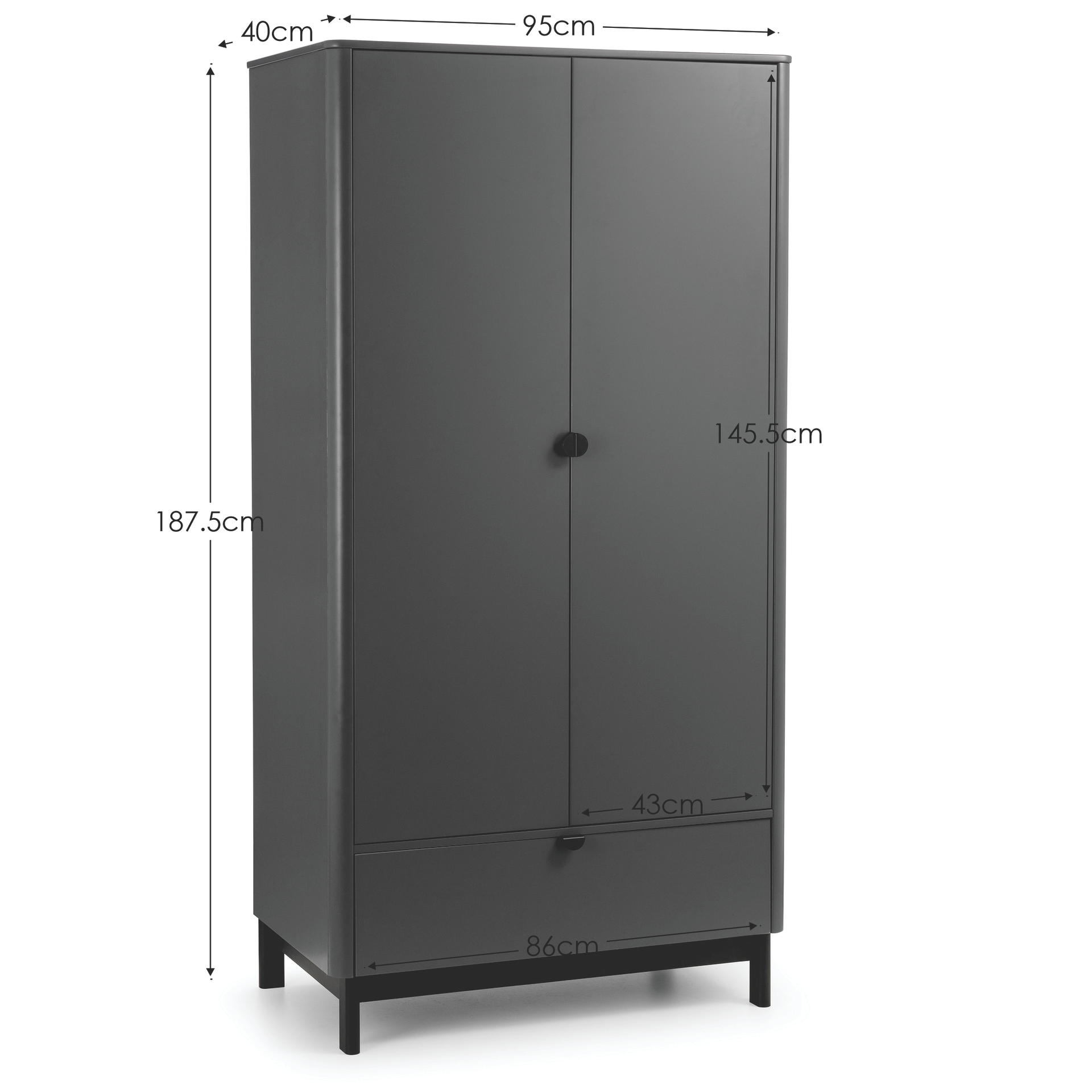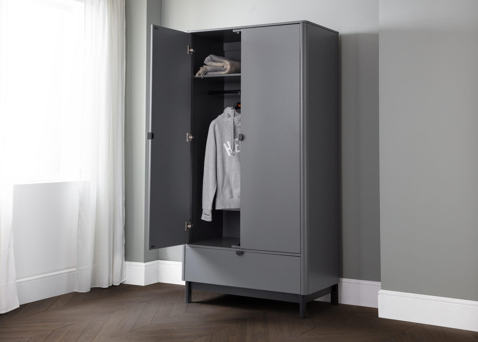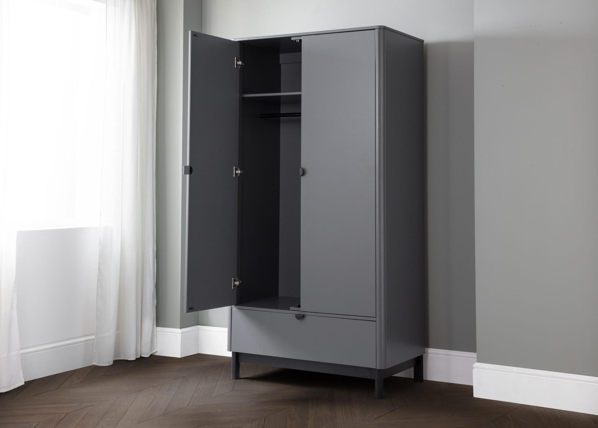 The Chloe Bedroom collection has a modern, retro style finished in a storm grey lacquer with satin black wooden legs and handles. The corners are rounded for a softer look, creating perfect balance between style and functionality. This wardrobe features a large hanging area behind 2 doors, along with a drawer for additional storage.