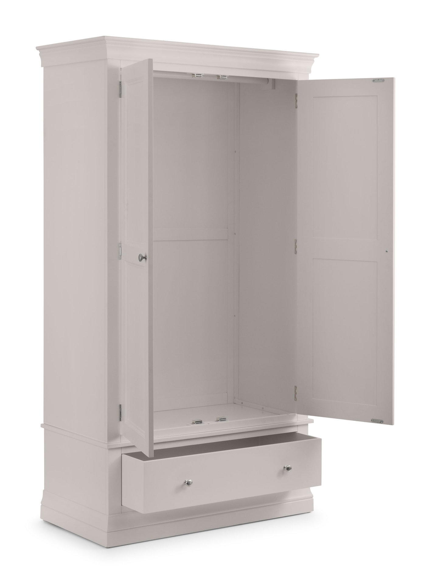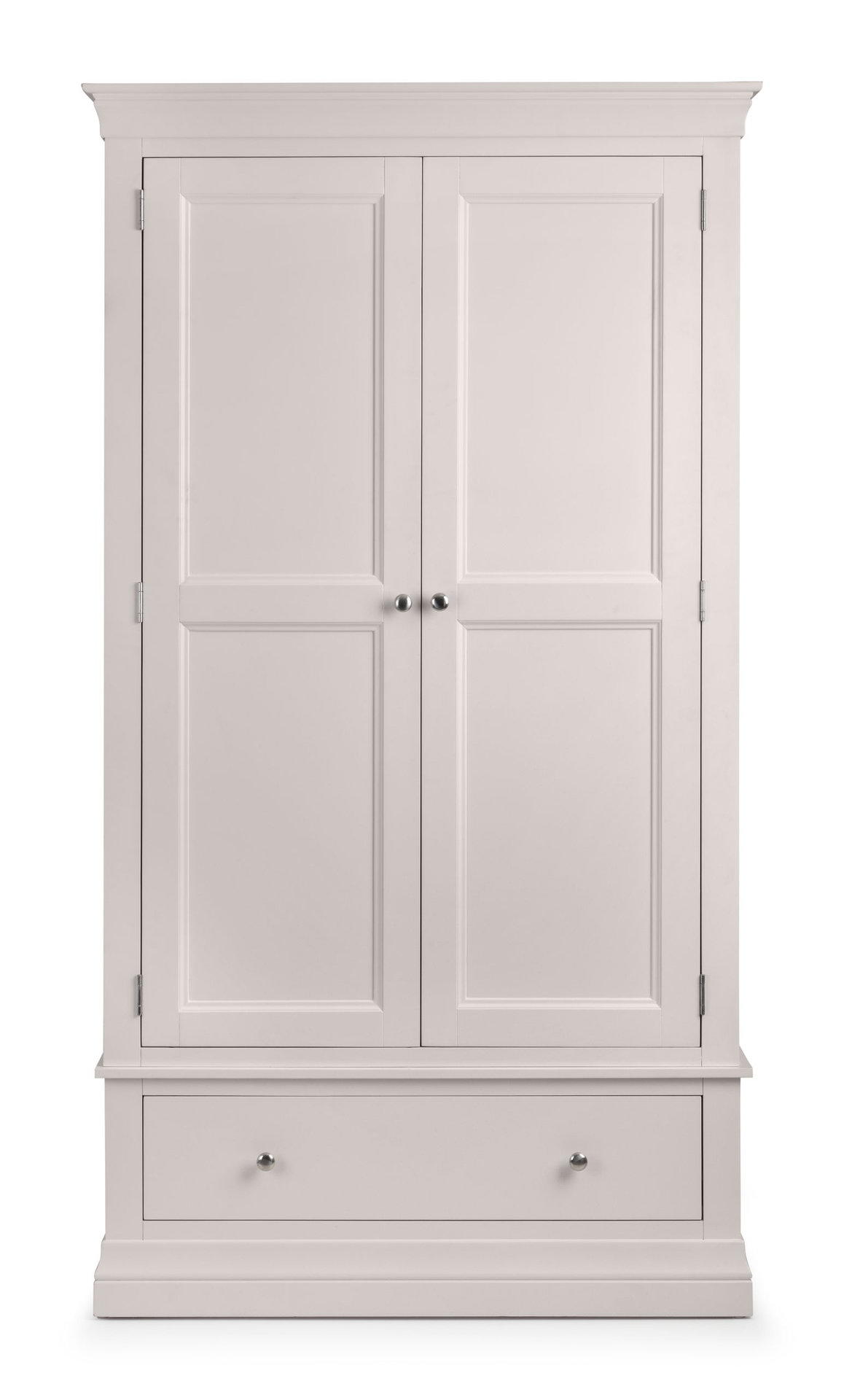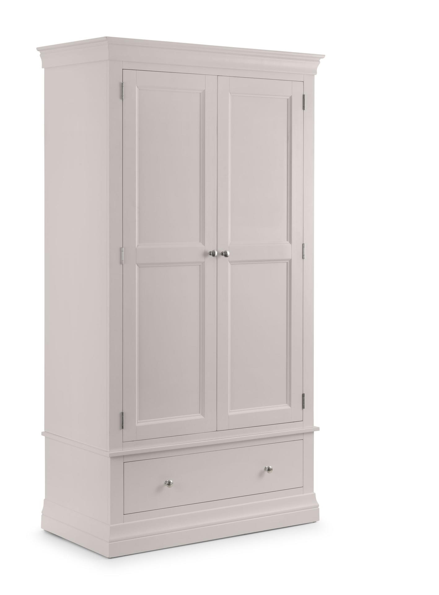 The Clermont Bedroom Collection is finished in a striking light grey lacquered finish, with simple clear lines that add a feeling of light and space. Crafted from Pine and MDF, featuring brushed steel handles, this elegant French inspired design is suitable for both contemporary and traditional settings. The Clermont 2 Door 1 Drawer Wardrobe offers a generous hanging space, along with a full width drawer for bulkier knitwear.