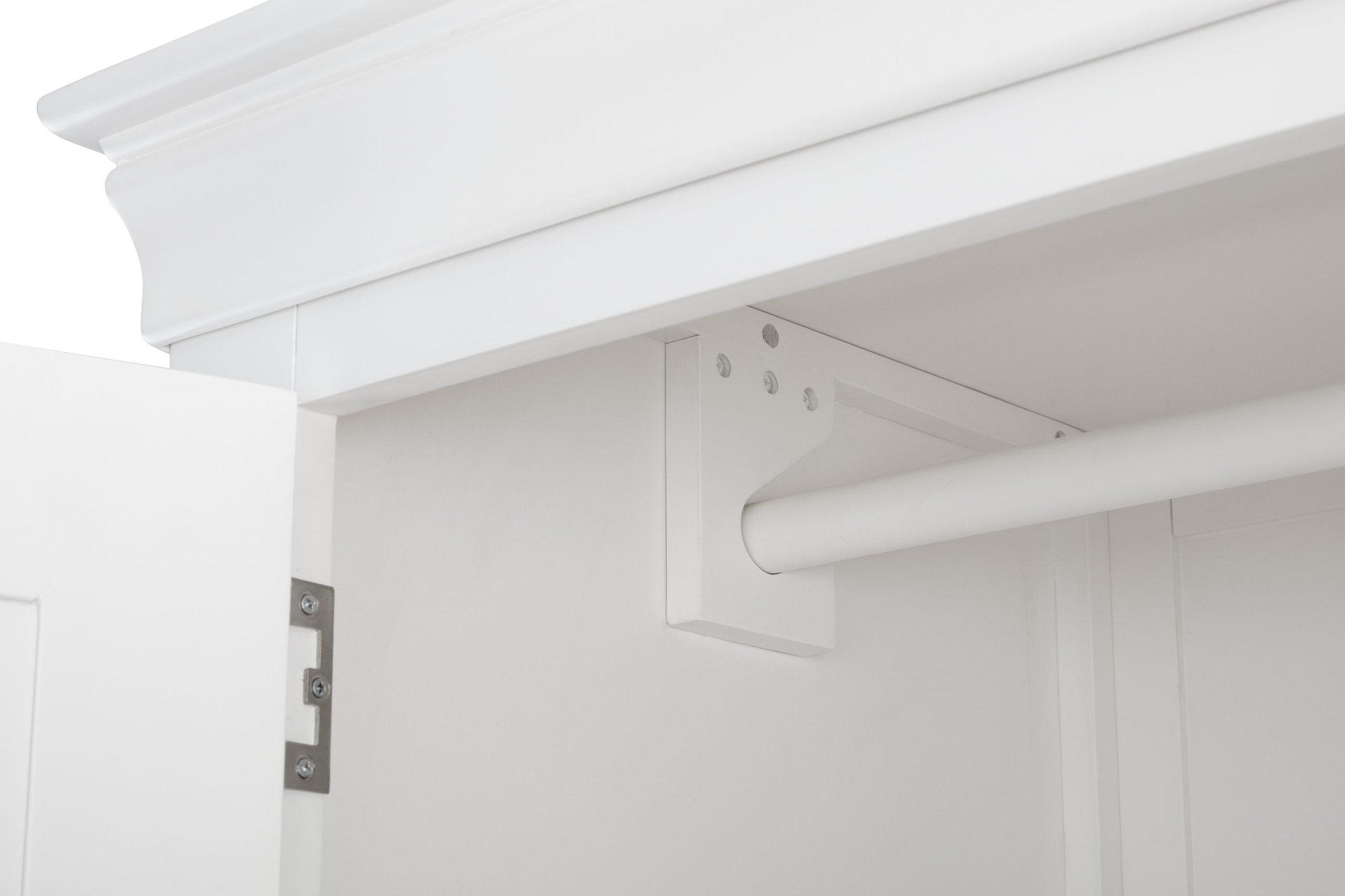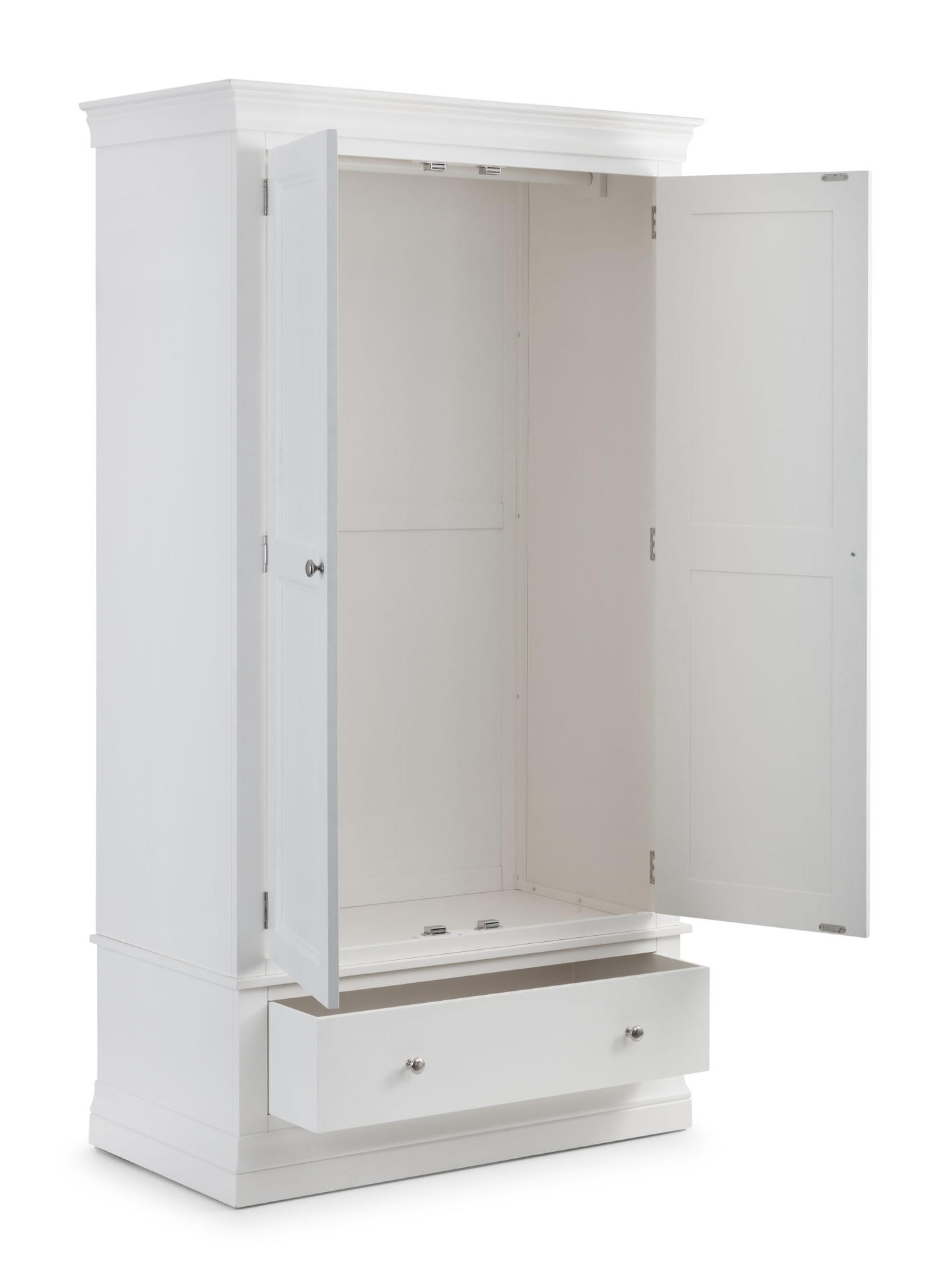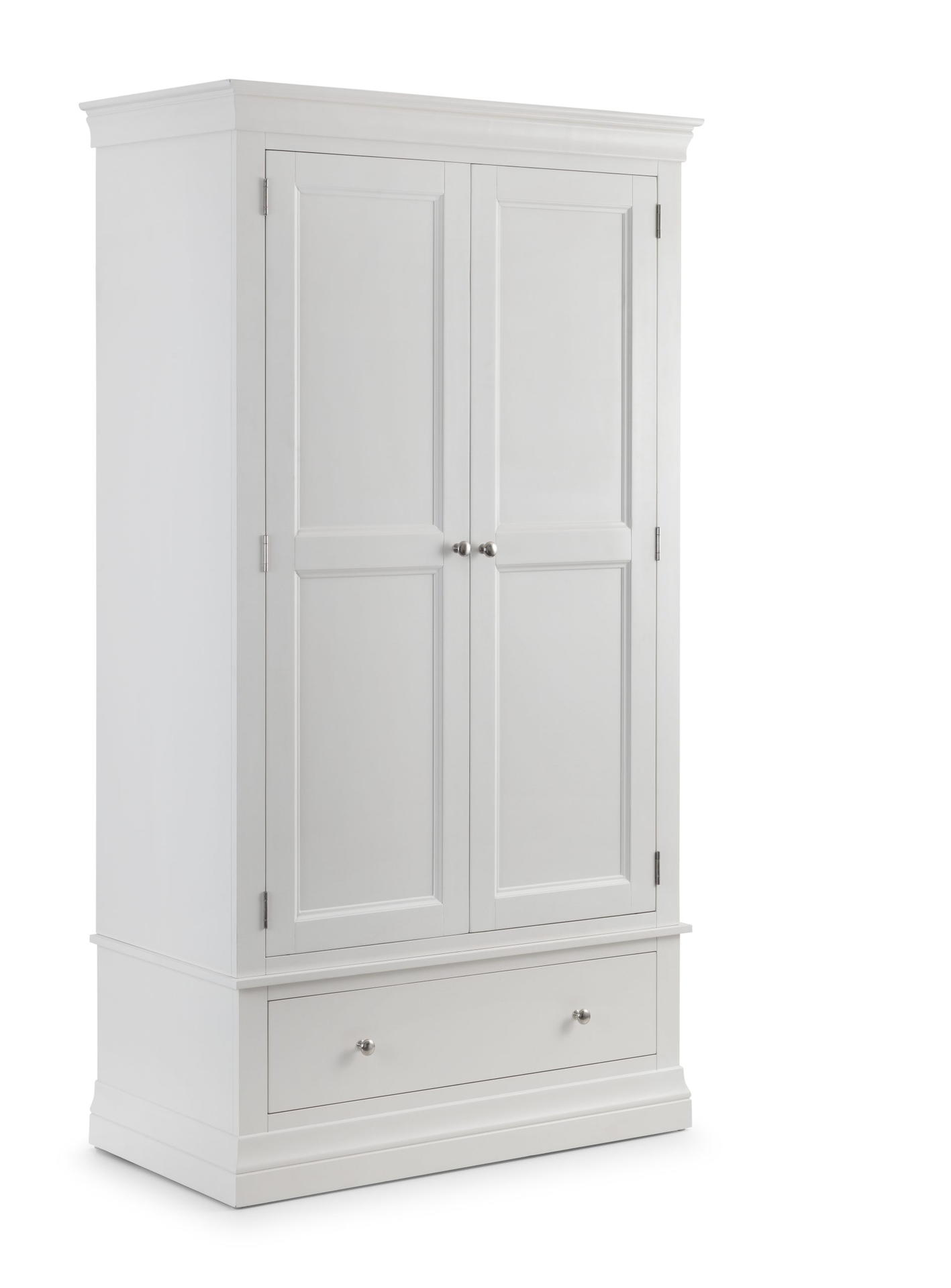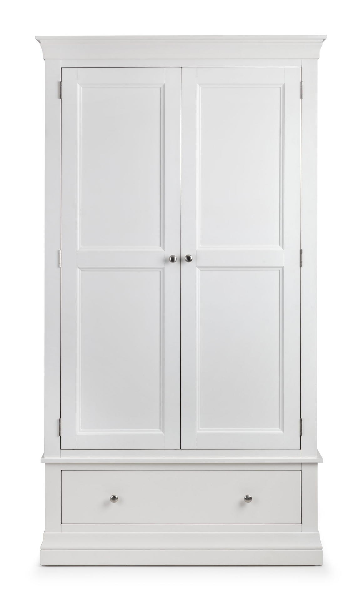 The Clermont Bedroom Collection is finished in a striking white lacquered finish, with simple clear lines that add a feeling of light and space. Crafted from Pine and MDF, featuring brushed steel handles, this elegant French inspired design is suitable for both contemporary and traditional settings. The Clermont 2 Door 1 Drawer Wardrobe offers a generous hanging space, along with a full width drawer for bulkier knitwear.