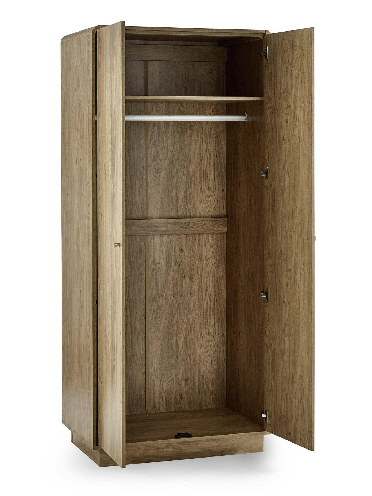 Keep your wardrobe stylishly organised with the Ingrid 2 Door Wardrobe. Its sleek wood-effect finish creates a natural and inviting look, while the curved edges lend a softer feel. Gold-tone handles add a refined elegance, making it a standout piece in any bedroom. Inside, a spacious hanging rail and shelving offer practical storage for clothes, shoes, and accessories. Designed for a quick and hassle-free setup.