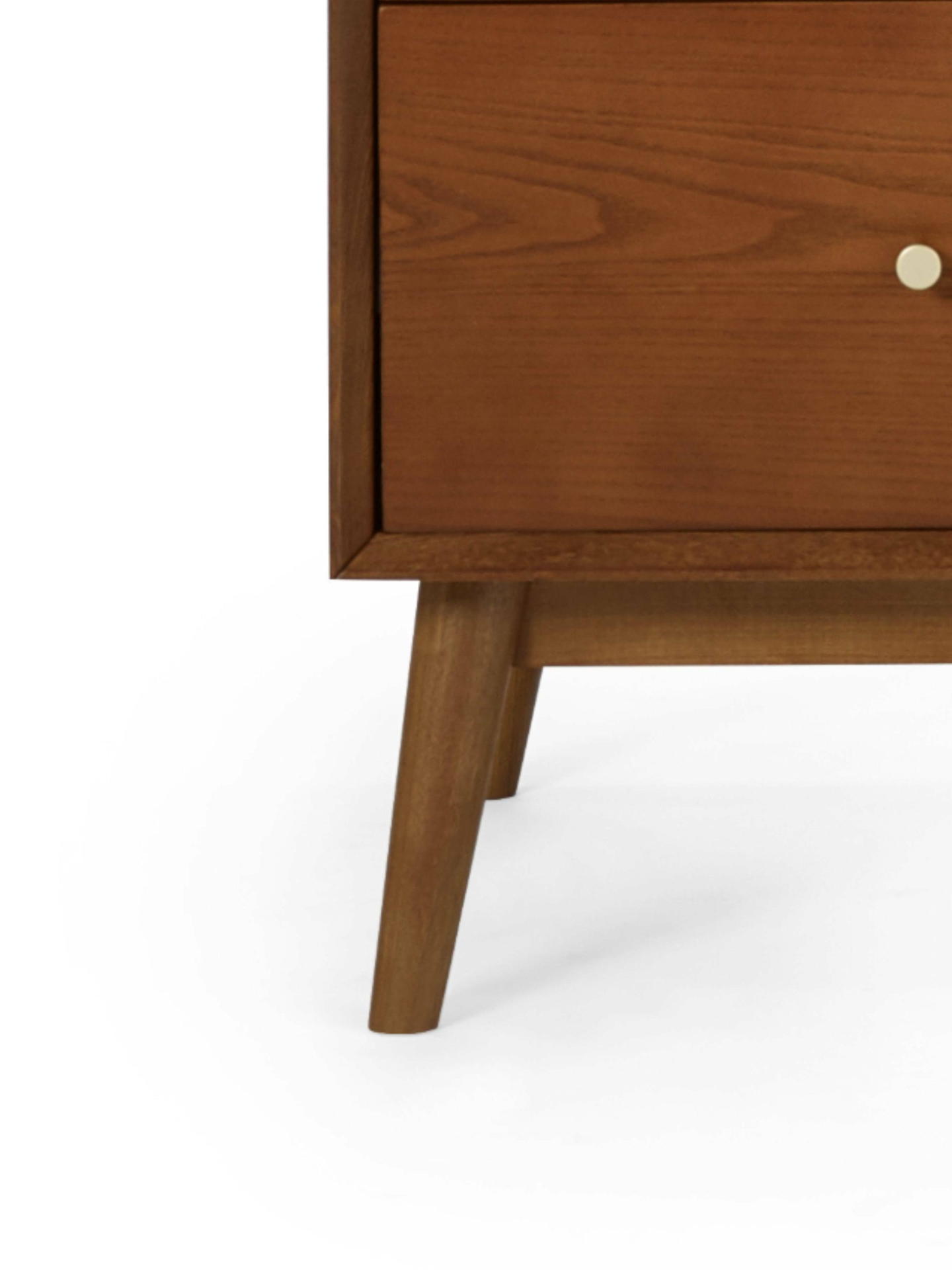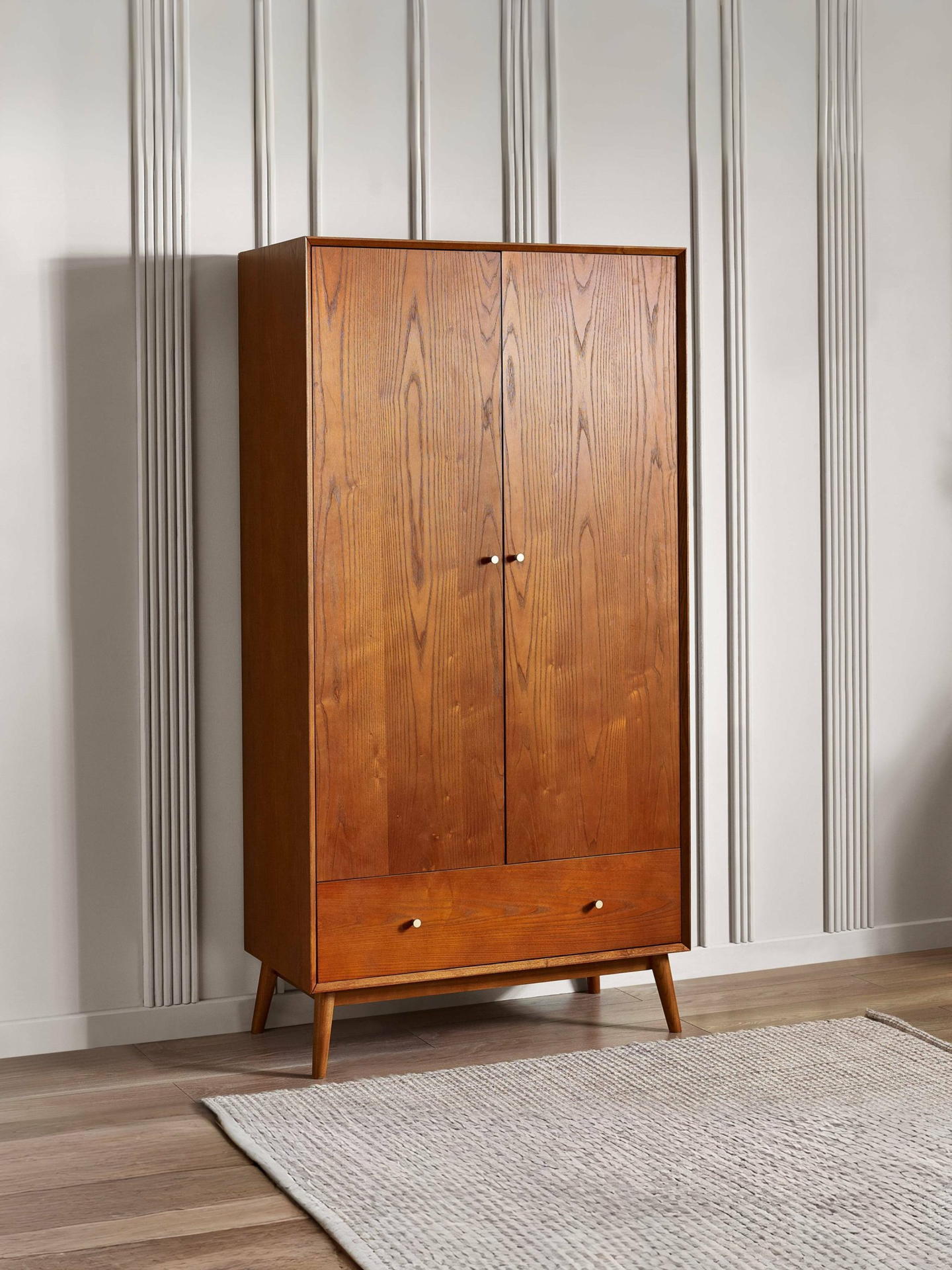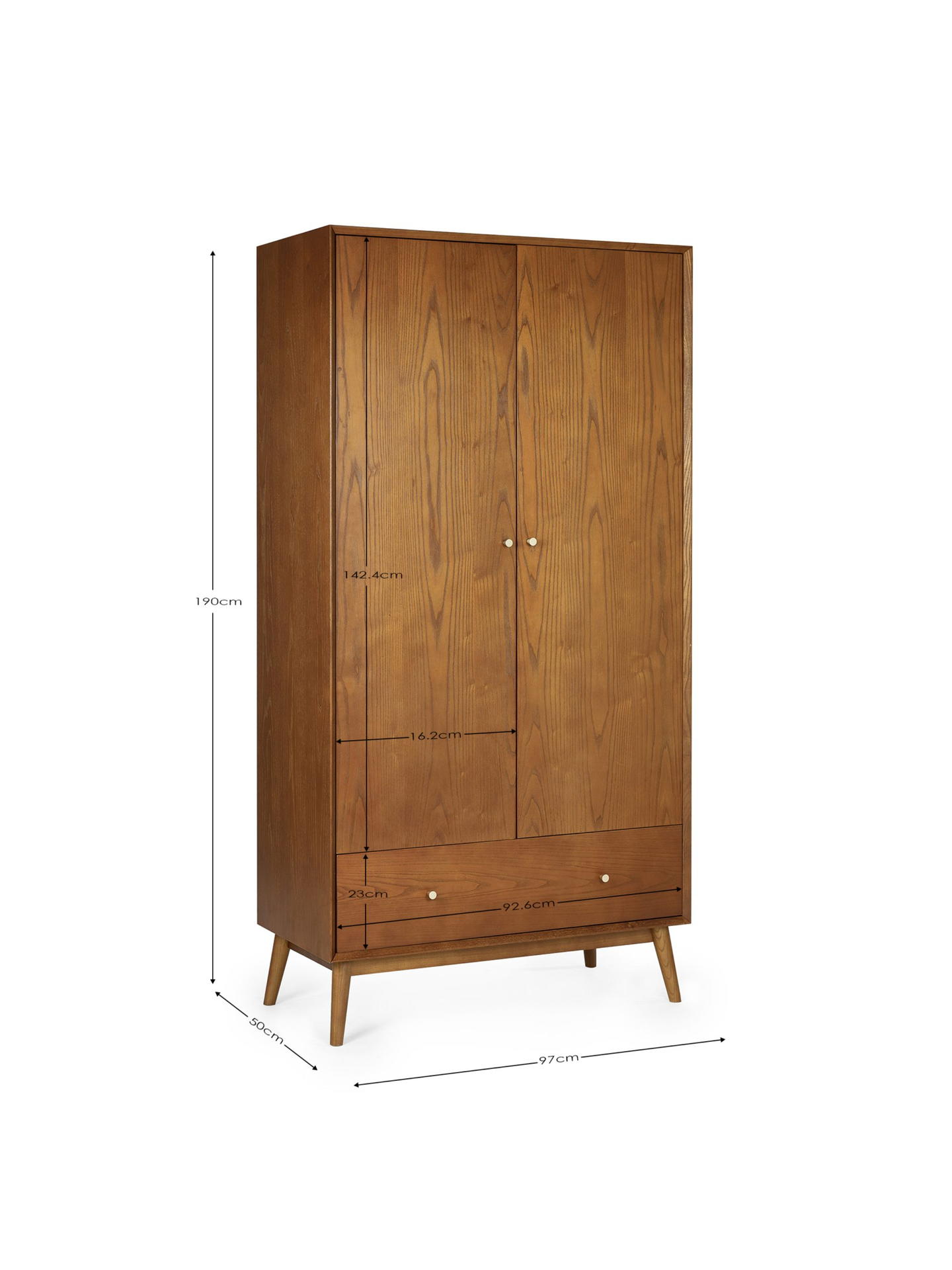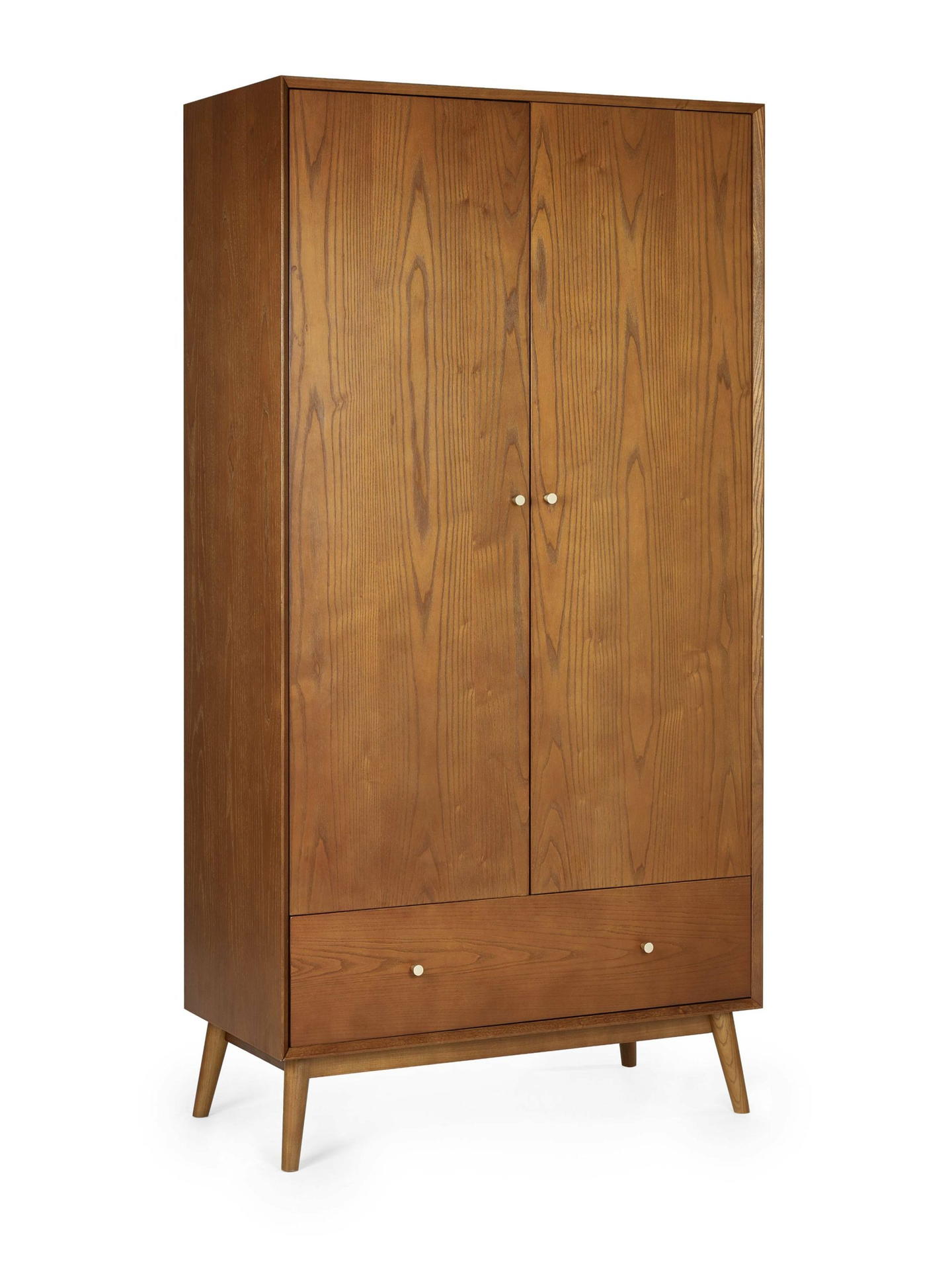 A gorgeous retro-inspired style, the Lowry Wardrobe is constructed from an exquisite cherry ash wood veneer with beautifully tapered legs. Featuring 2 soft-touch doors with 1 drawer offering plenty of hanging and storage space. Complemented by golden framed knobs, providing the perfect timeless staple to any bedroom space.
