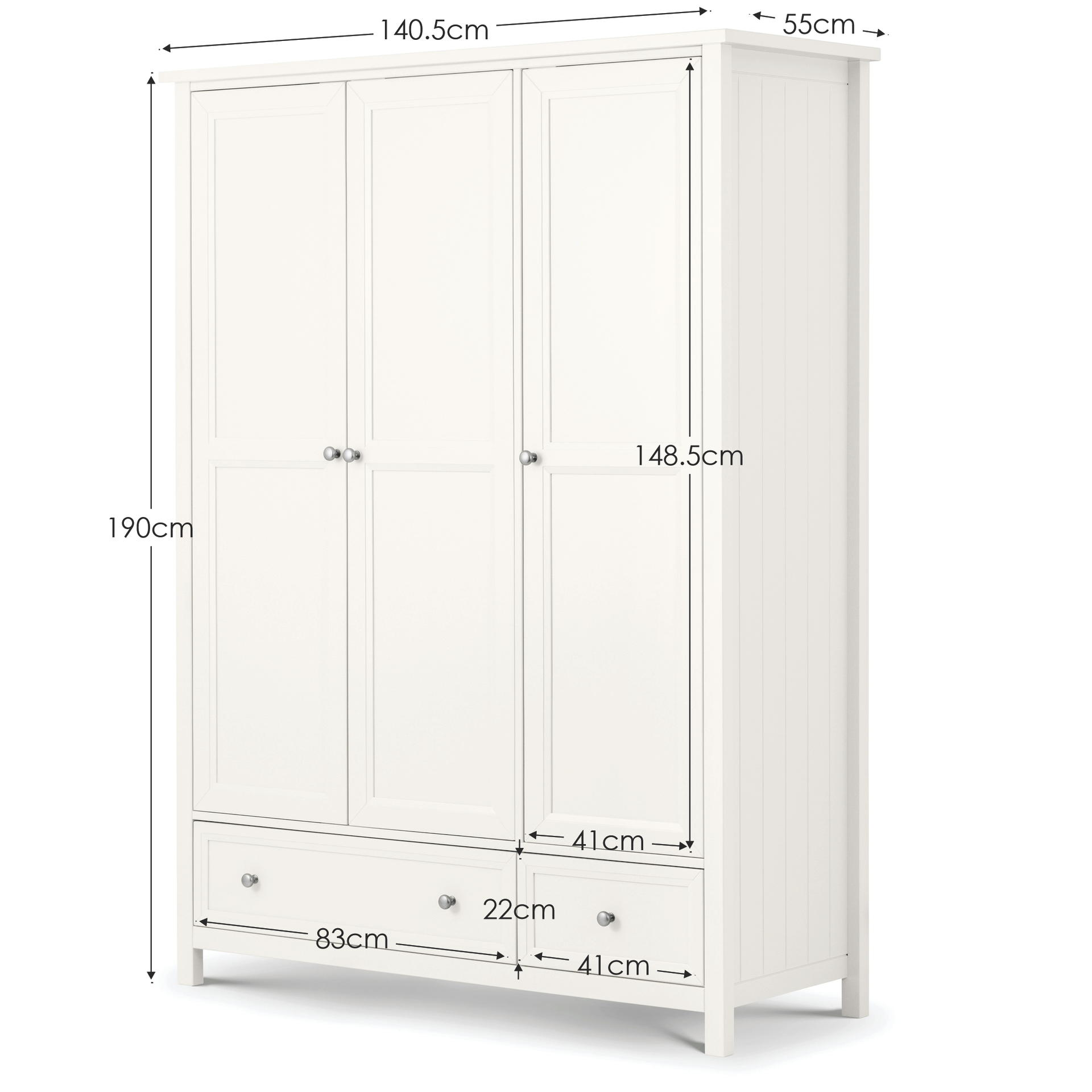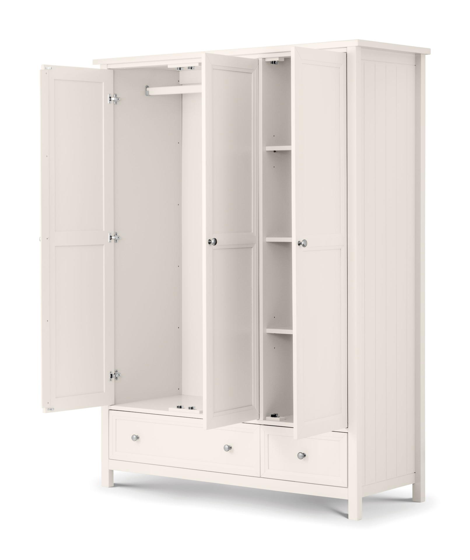 An elegant New England style wardrobe with three doors and two drawers. The combination of exquisite surf white lacquered finish with characteristic side panelling and detailed chamfered cabinetry makes for a soothing and refined aesthetic with timeless appeal, while delicate pewter handles add the perfect finishing touch.