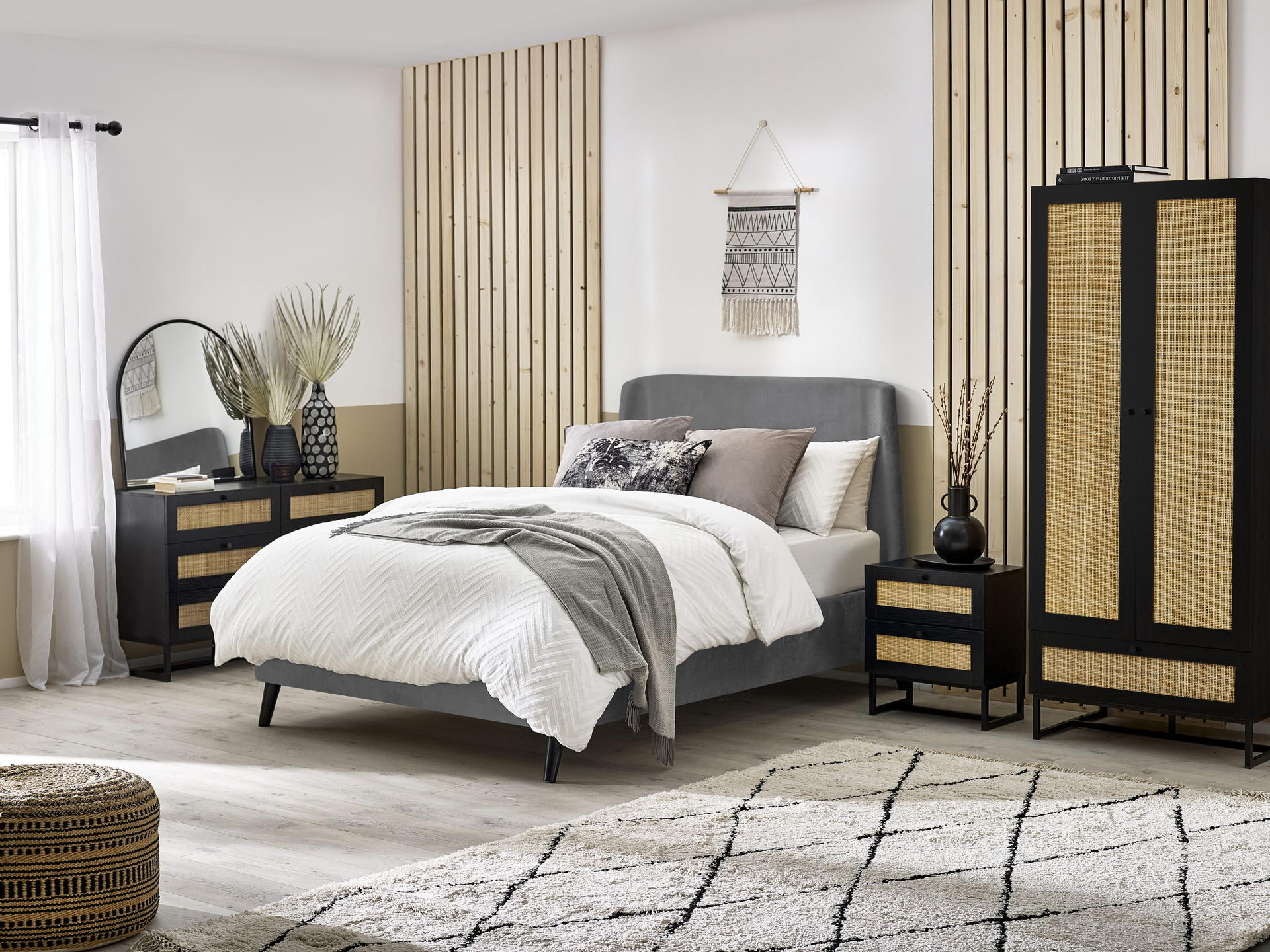 Fusing modern construction with retro design elements, the Padstow collection will exquisitely complement any styled home. The natural rattan fronts and industrial-style base collaborate perfectly to leave a warm yet chic aesthetic in your home. This range includes a bedside, 3 drawer chest, 6 drawer chest, wardrobe, coffee table, TV unit, sideboard, and tall bookcase. Also available in an oak finish.
