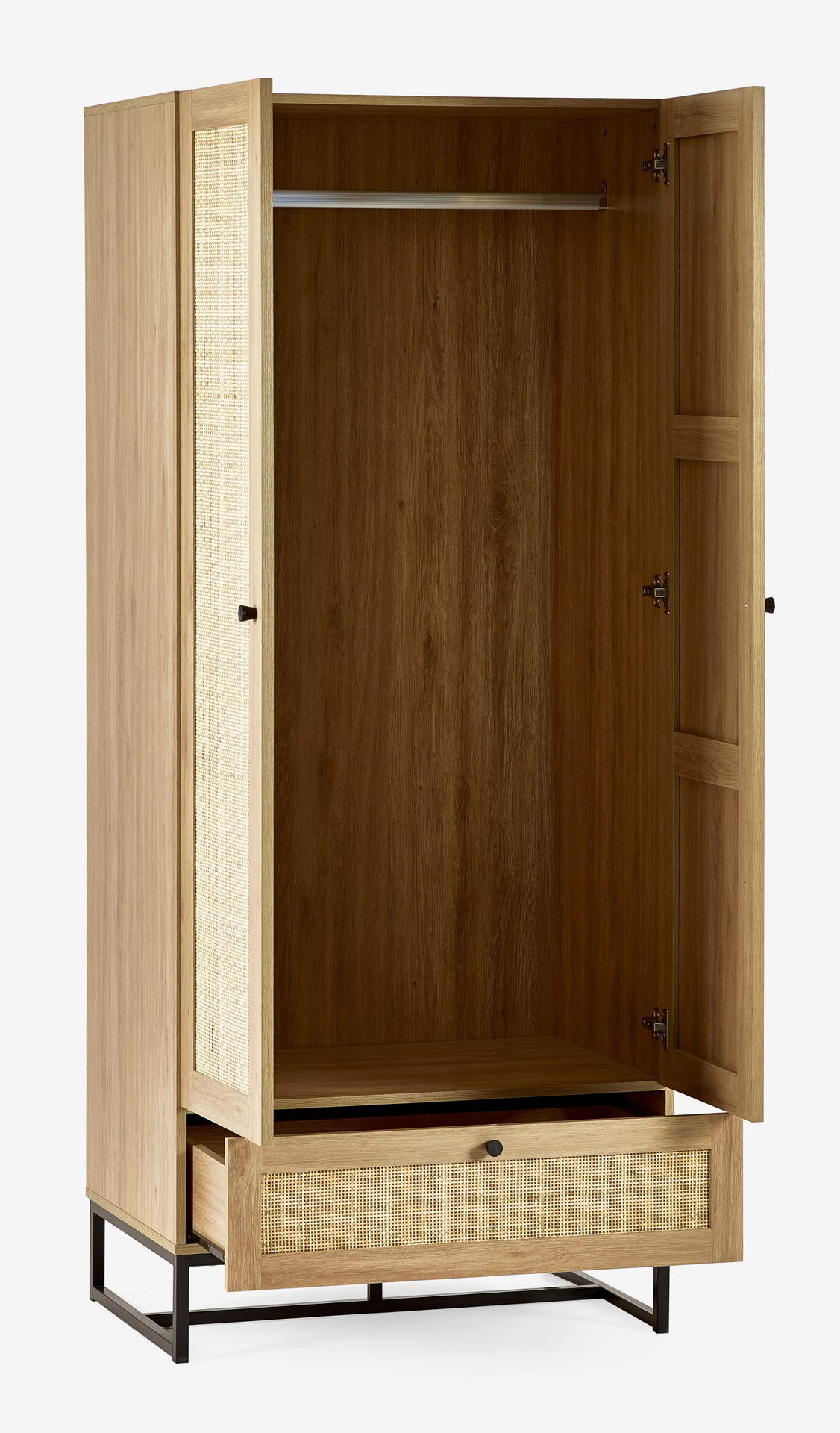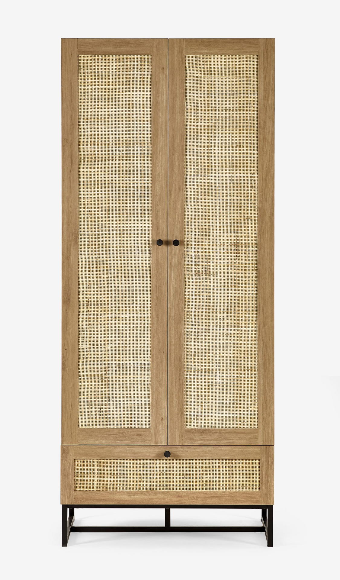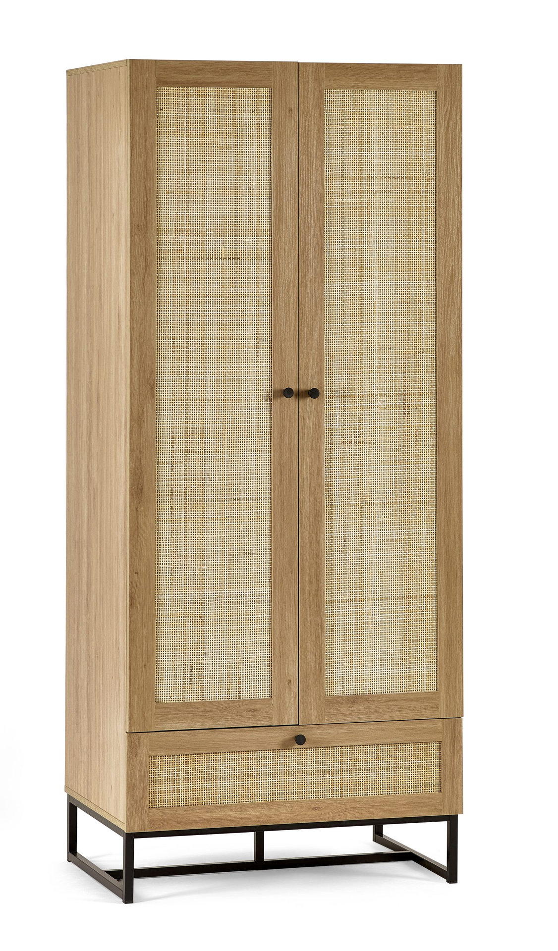 Fusing modern construction with retro design elements, the Padstow collection will exquisitely complement any styled home. The natural rattan fronts and industrial-style base collaborate perfectly to leave a warm yet chic aesthetic in your home. This range includes a bedside, 3 drawer chest, 6 drawer chest, wardrobe, coffee table, TV unit, sideboard, and tall bookcase. Also available in a black finish.