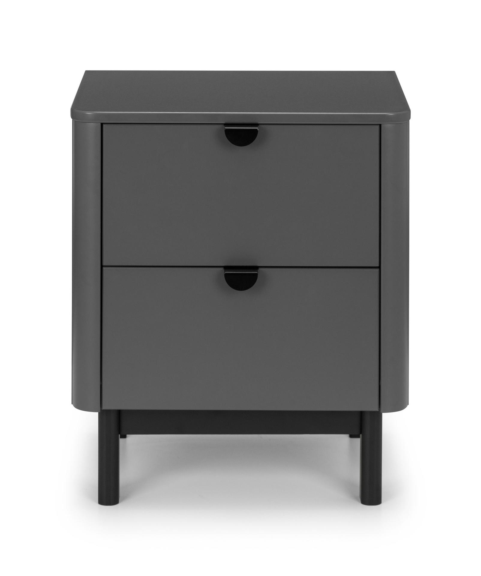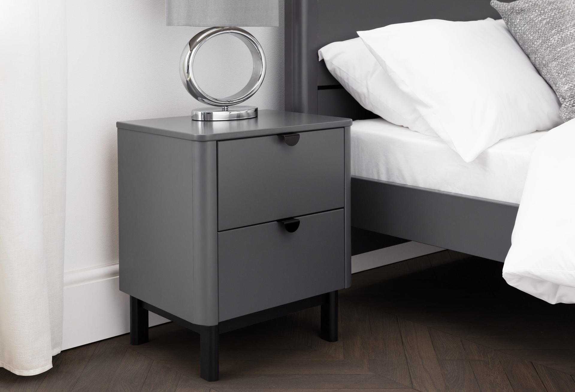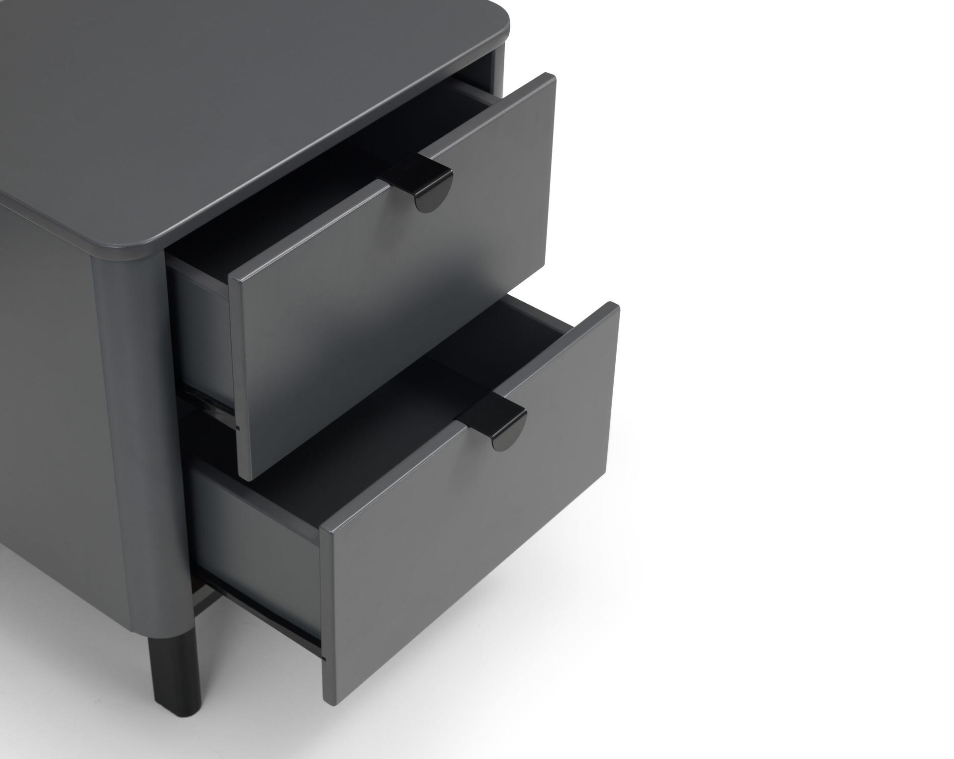 The Chloe Bedroom collection has a modern, retro style finished in a storm grey lacquer with satin black wooden legs and handles. The corners are rounded for a softer look, creating perfect balance between style and functionality. Stow away all your night time essentials with the Chloe 2 drawer bedside.