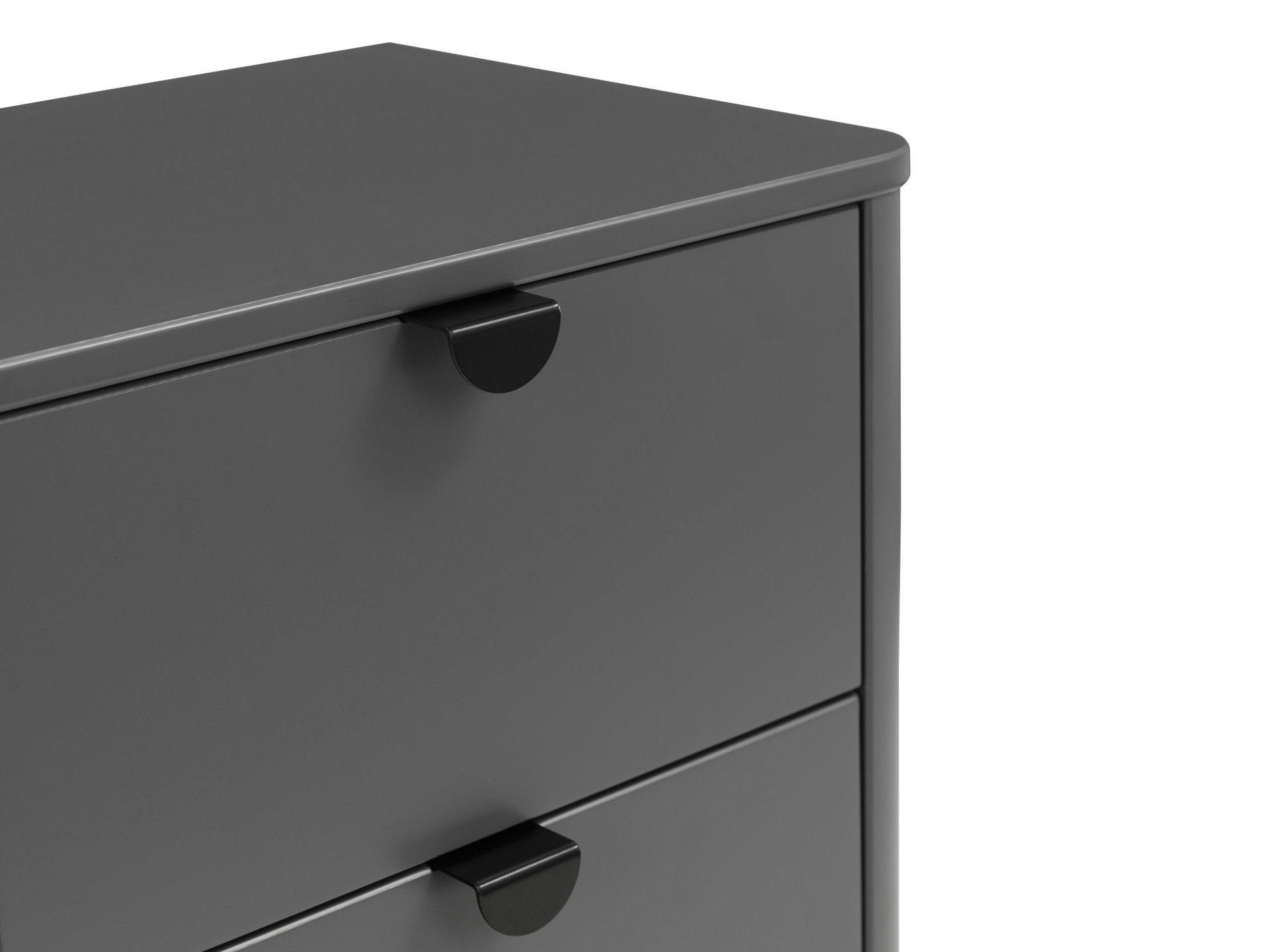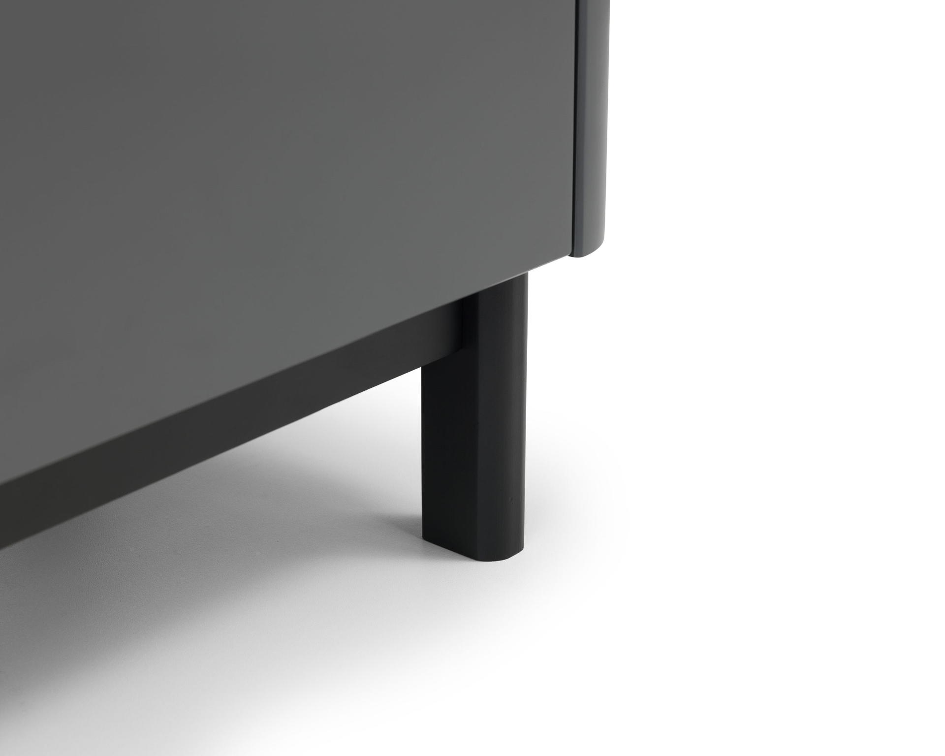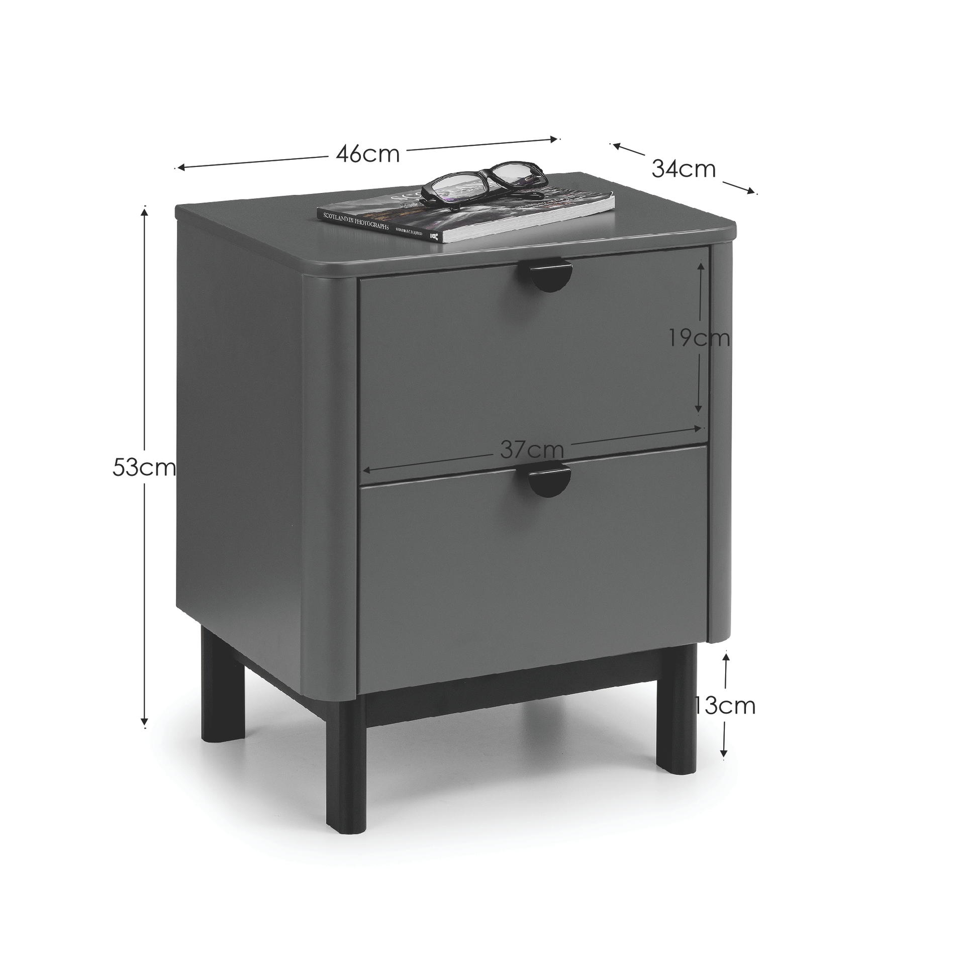 The Chloe Bedroom collection has a modern, retro style finished in a storm grey lacquer with satin black wooden legs and handles. The corners are rounded for a softer look, creating perfect balance between style and functionality. Stow away all your night time essentials with the Chloe 2 drawer bedside.