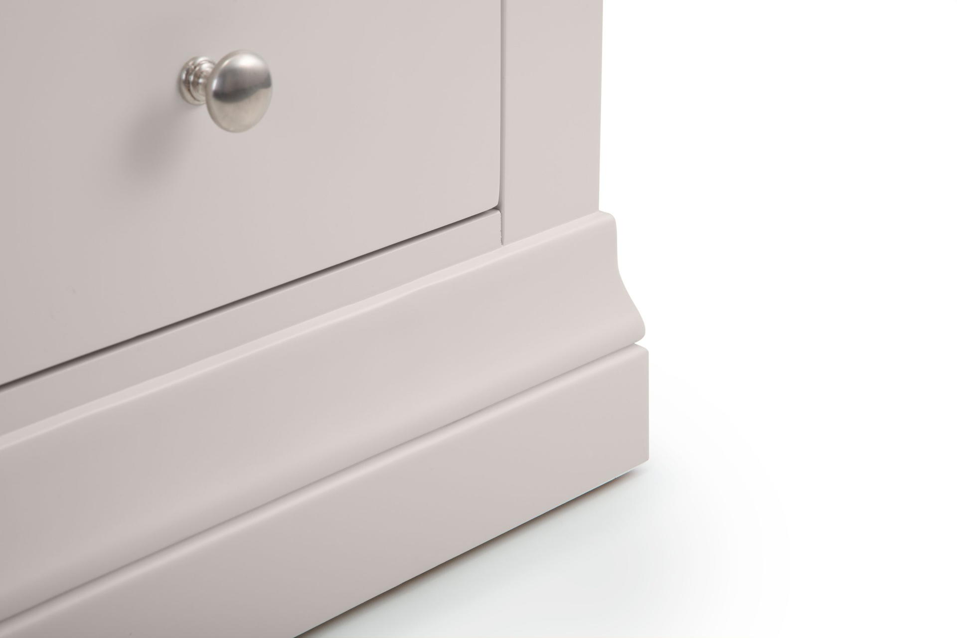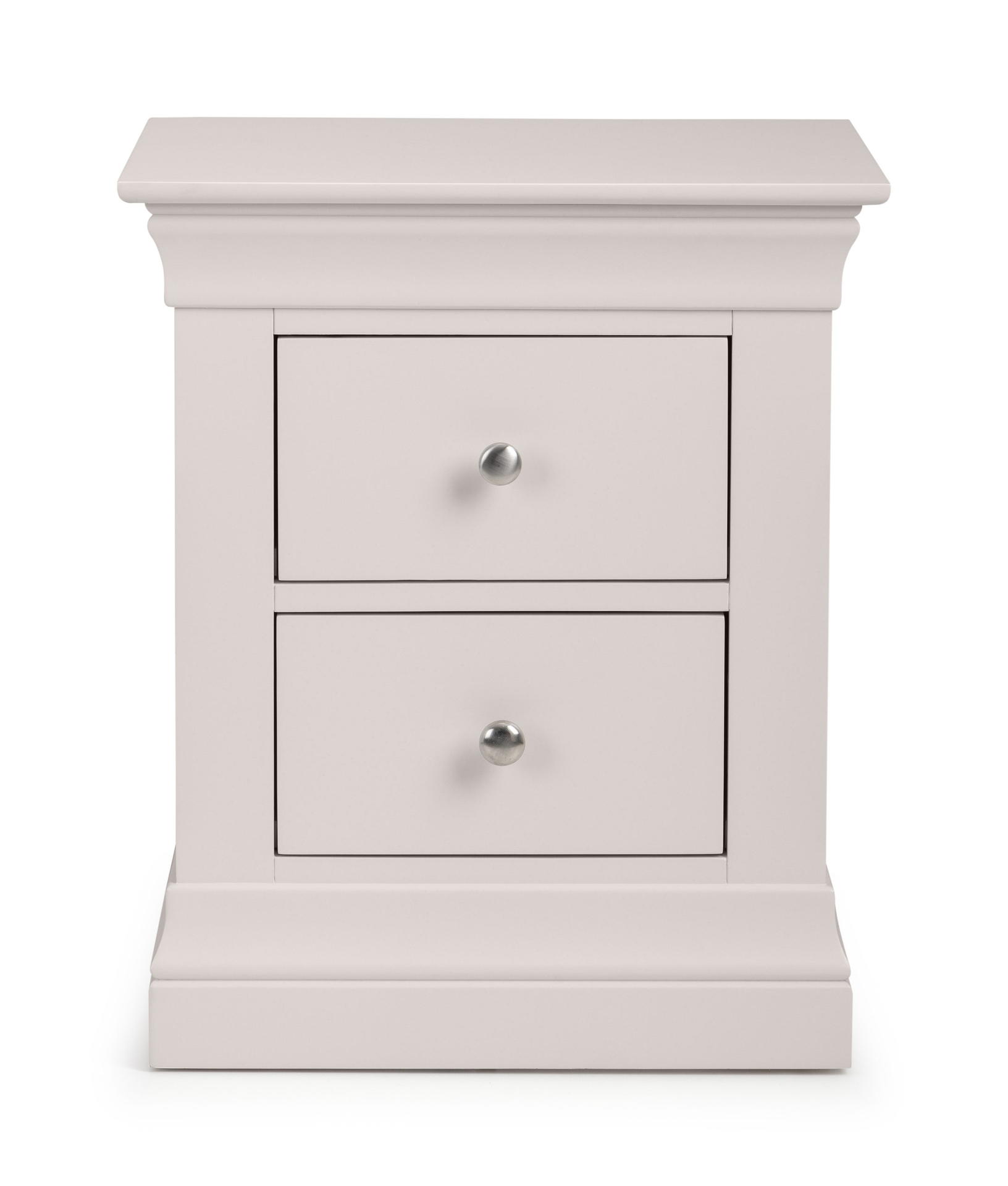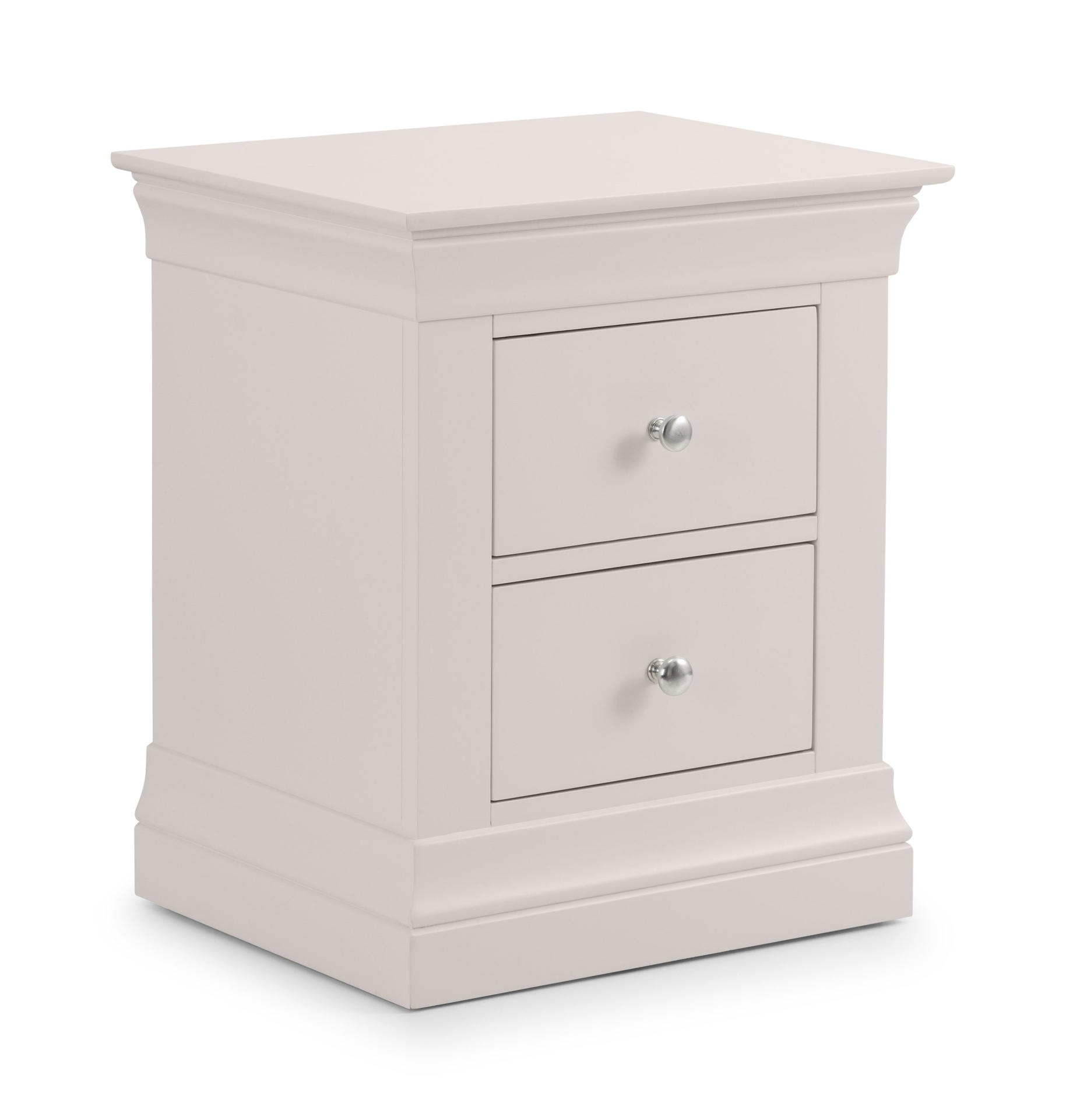 The Clermont Bedroom Collection is finished in a striking light grey lacquered finish, with simple clear lines that add a feeling of light and space. Crafted from Pine and MDF, featuring brushed steel handles, this elegant French inspired design is suitable for both contemporary and traditional settings. The Clermont Bedside has 2 drawers, suitable to stow away your nighttime essentials.