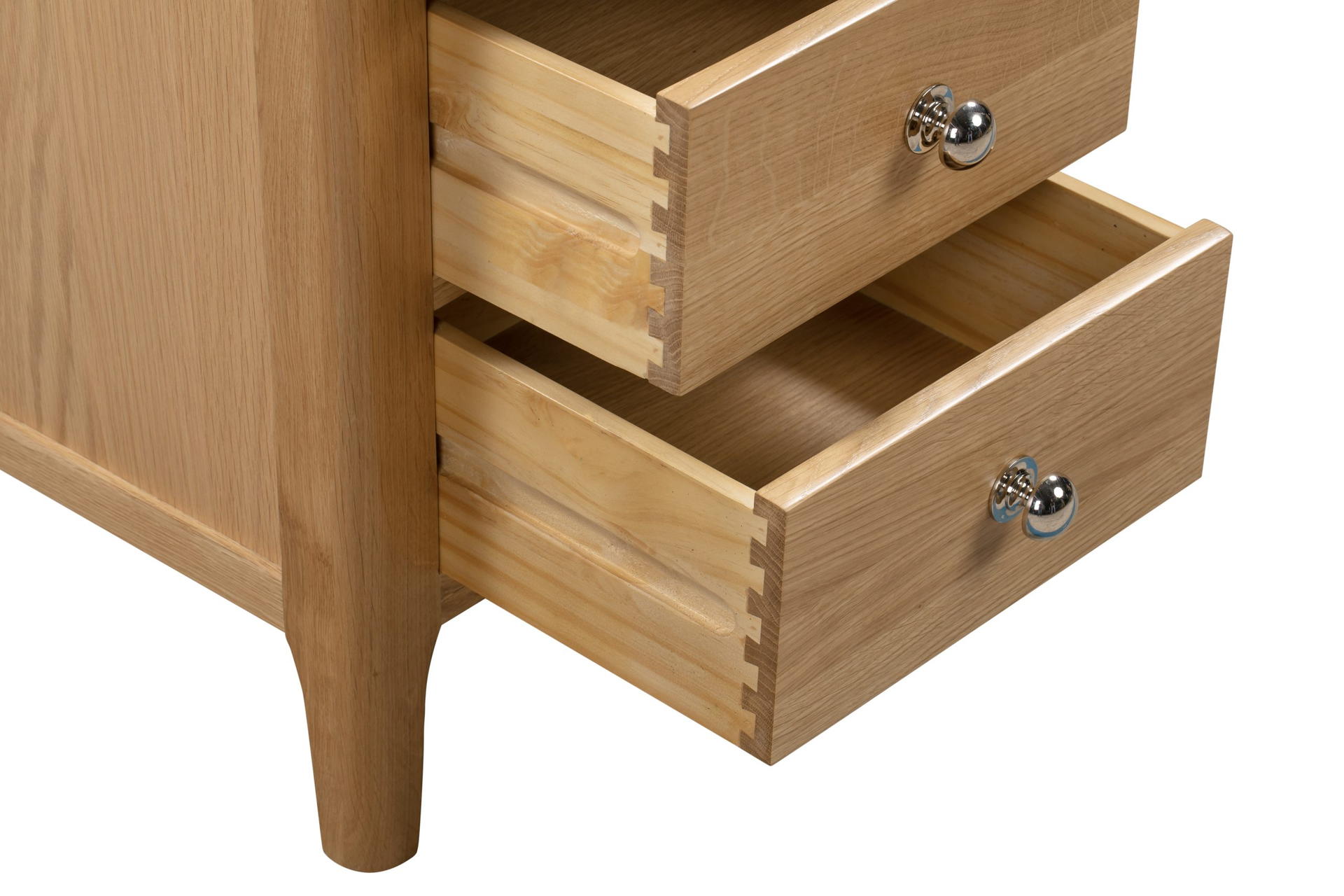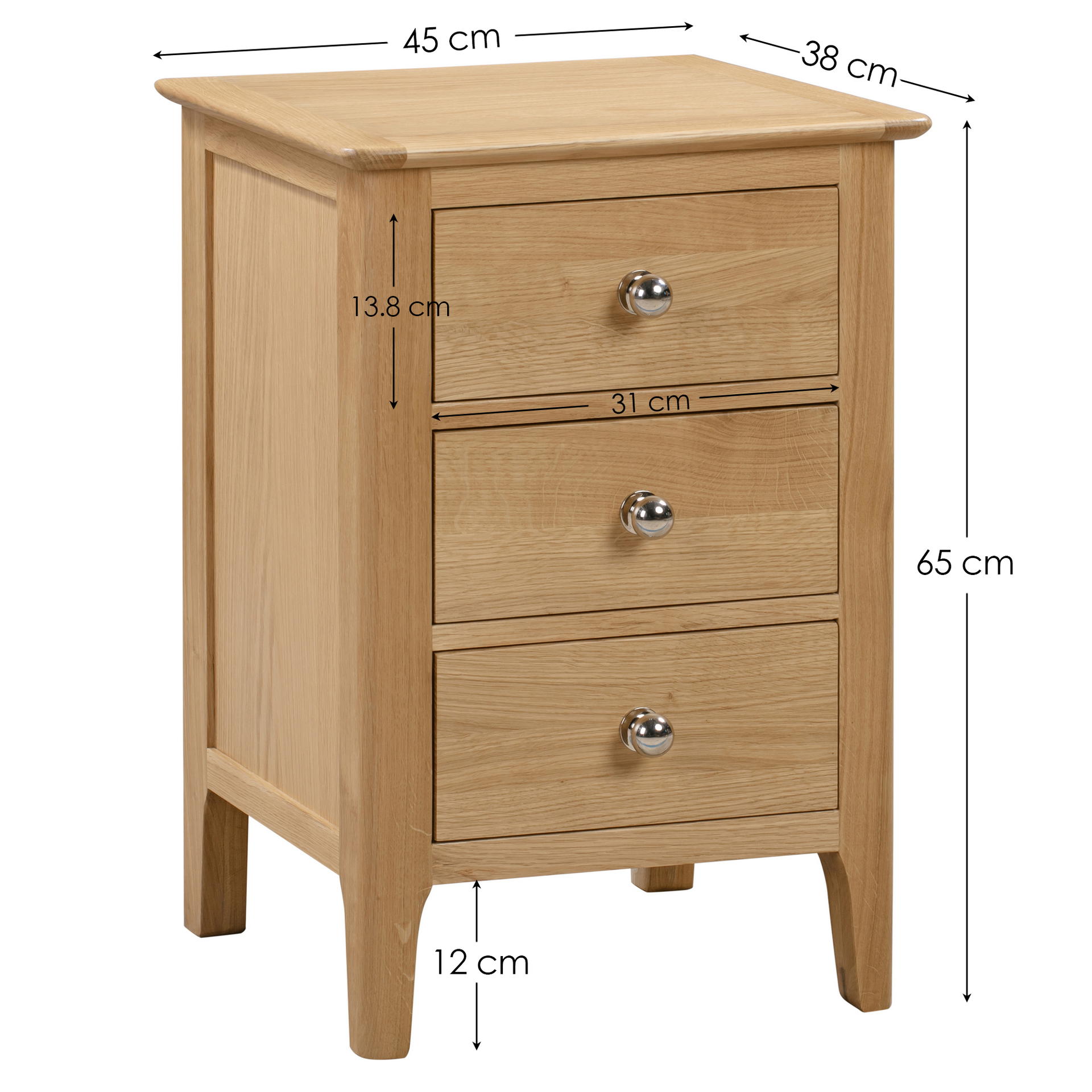 Crafted from solid oak and oak veneers, the Cotswold 3 Drawer Bedside ensures lasting durability with its robust structure. Featuring 3 spacious drawers, ideal for keeping night-time necessities within arm’s reach, with additional space on top for a bedside lamp. This simple, yet elegant design is finished with a round silver knob, perfect for any traditional bedroom.