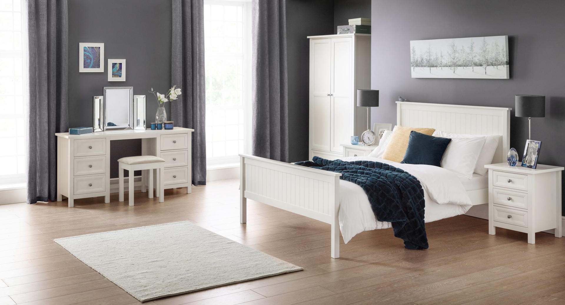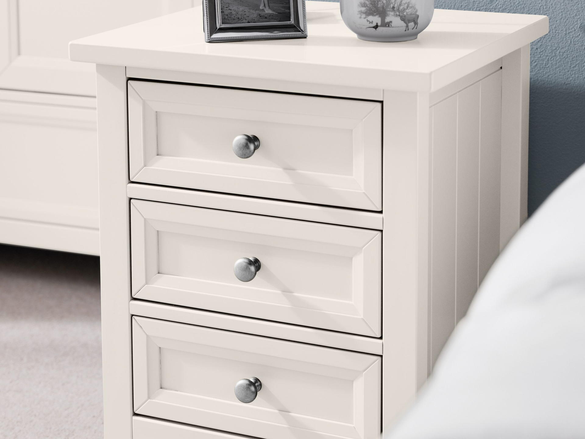 Maine is an elegant New England style range of bedroom furniture. The combination of exquisite surf white lacquered finish with characteristic side panelling and detailed chamfered cabinetry makes for a soothing and refined aesthetic with timeless appeal, while delicate pewter handles add the perfect finishing touch.