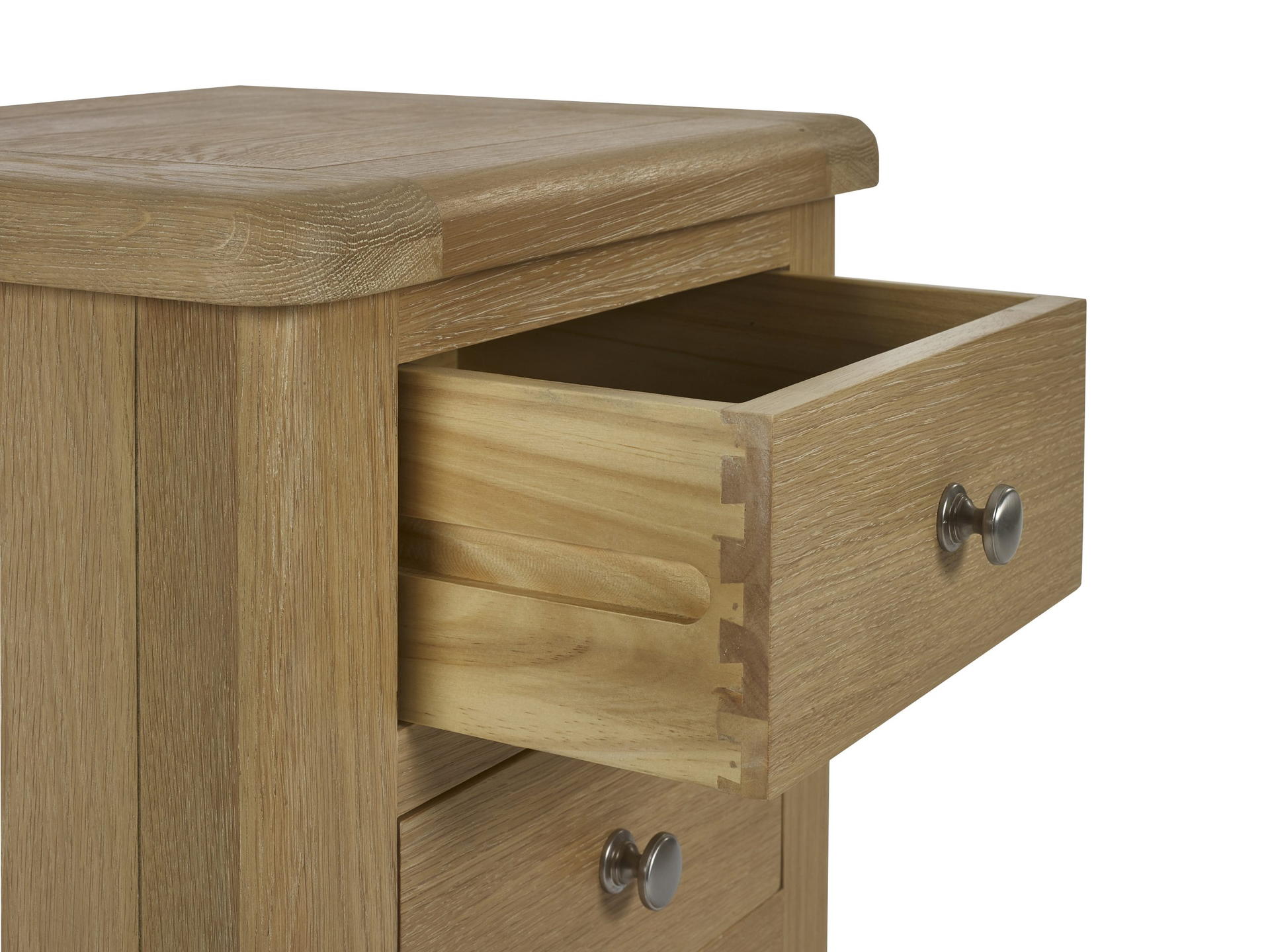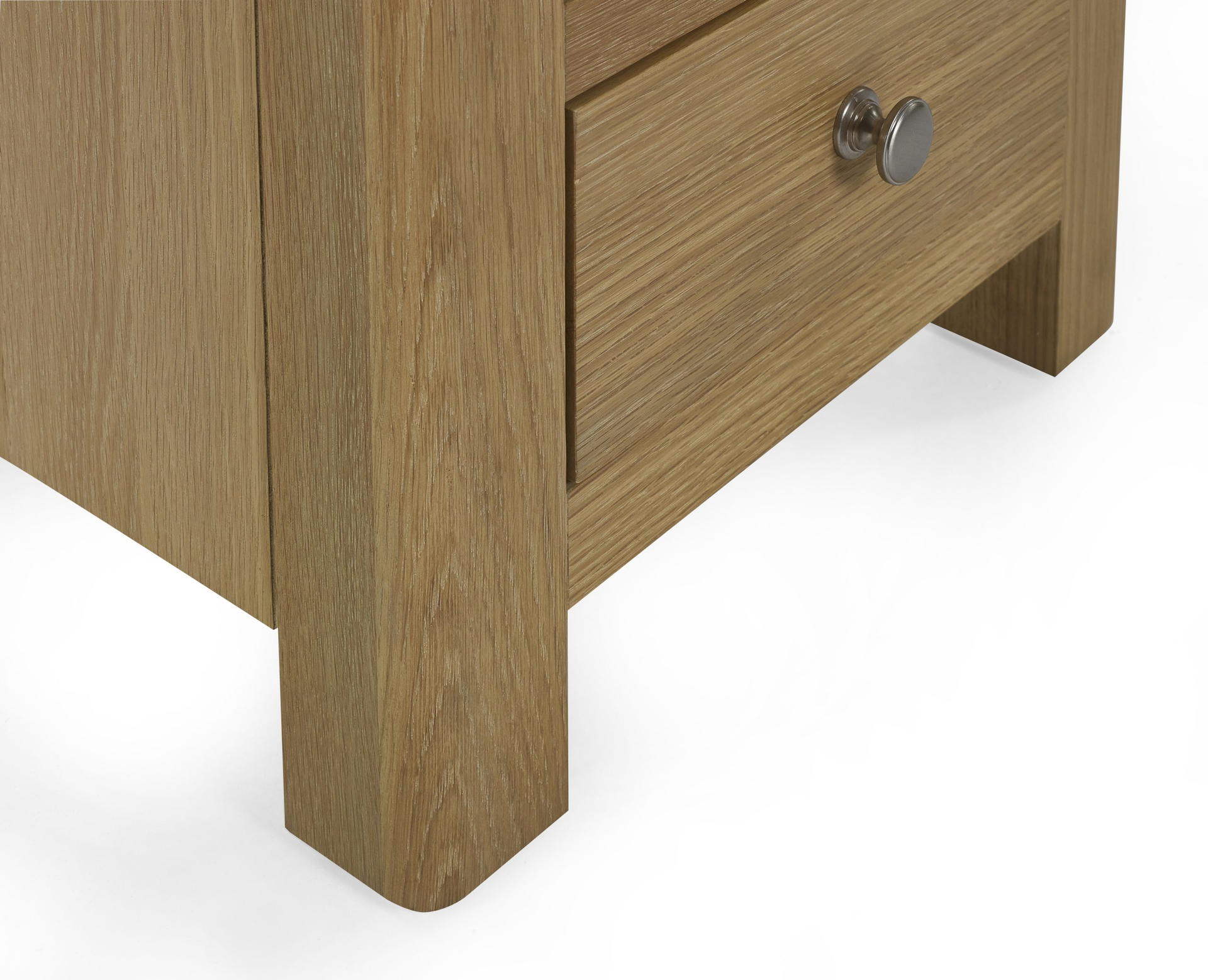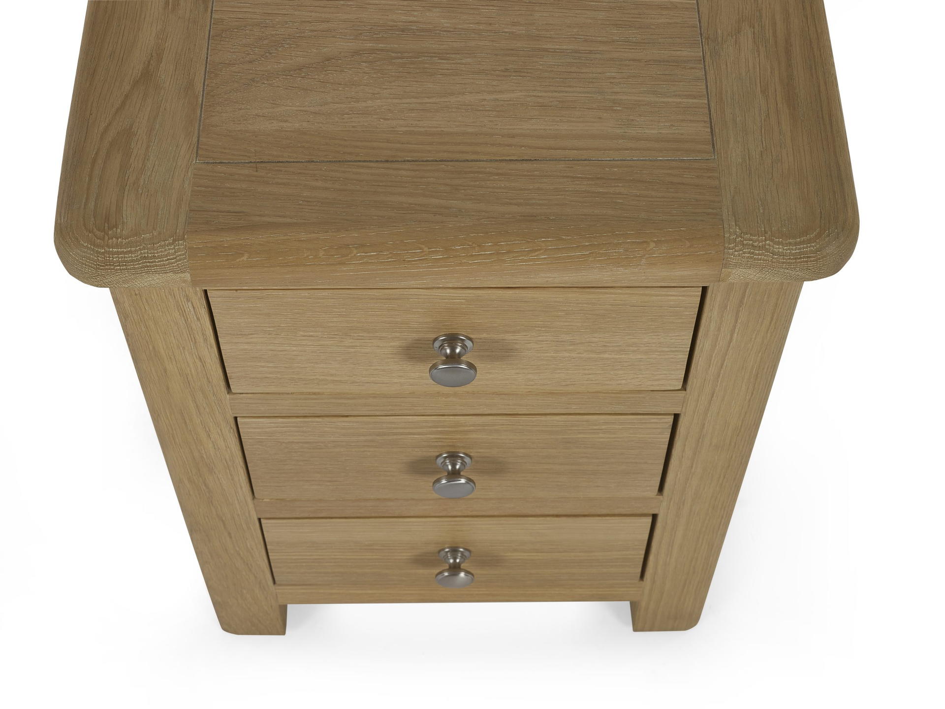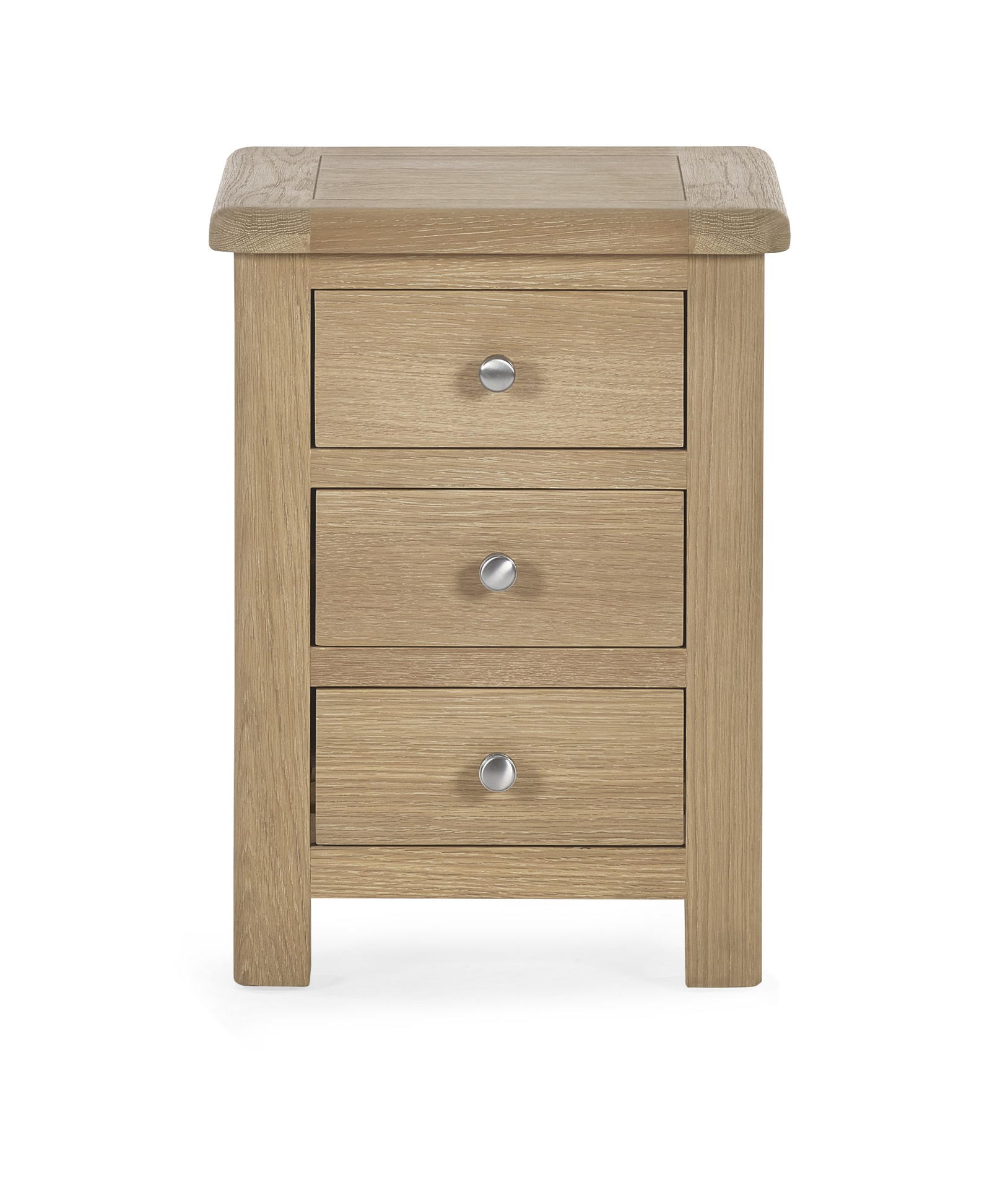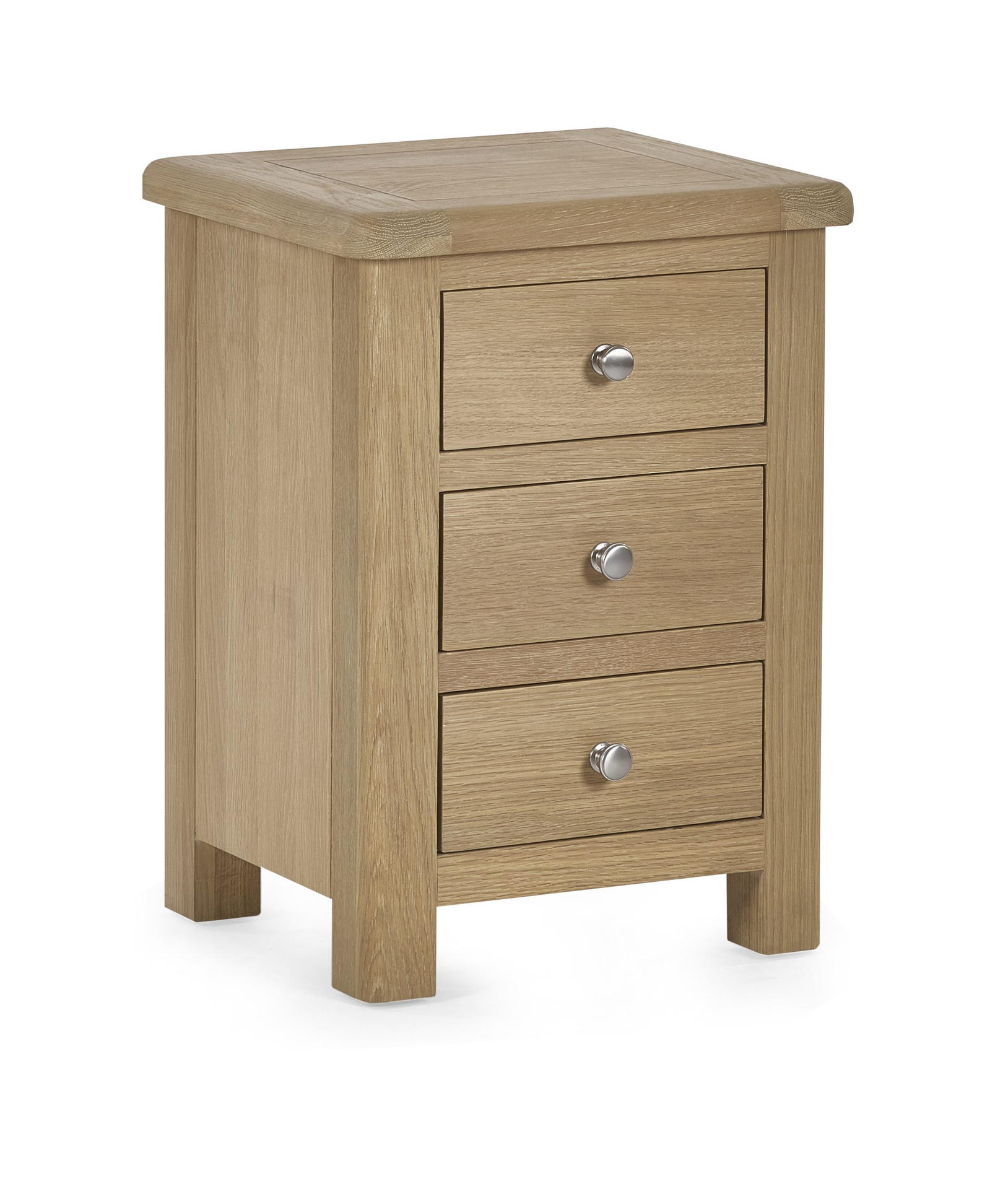 The Memphis 3 Drawer Bedside is finished in a gorgeous limed oak, providing a smooth curved edging that will add a timeless look to any bedroom space. This sleek design features three pull-out drawers offering storage space for key necessities at hand reach which are elegantly finished with bulbous polished silver handles.