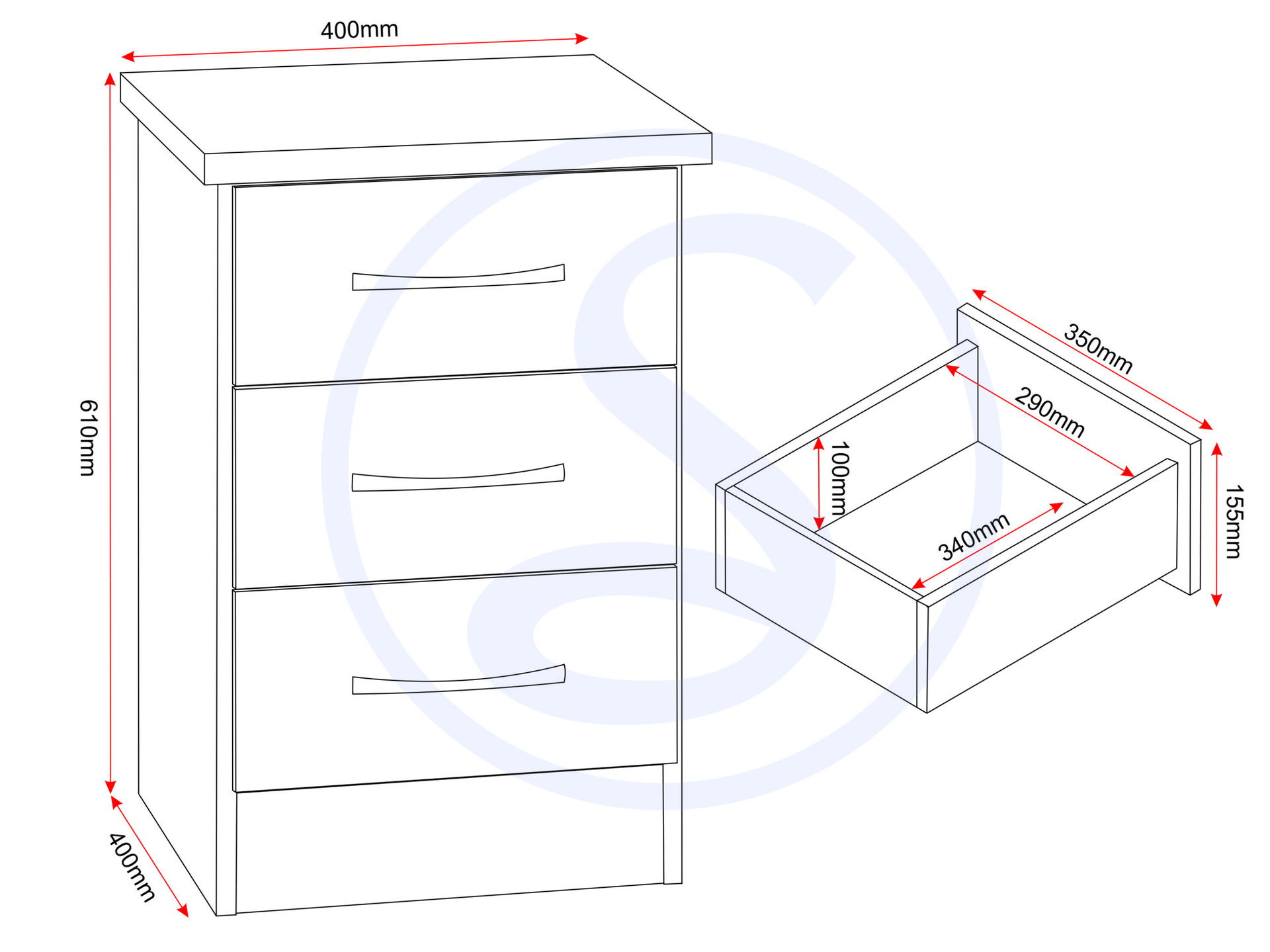 Nevada 3 Drawer Bedside