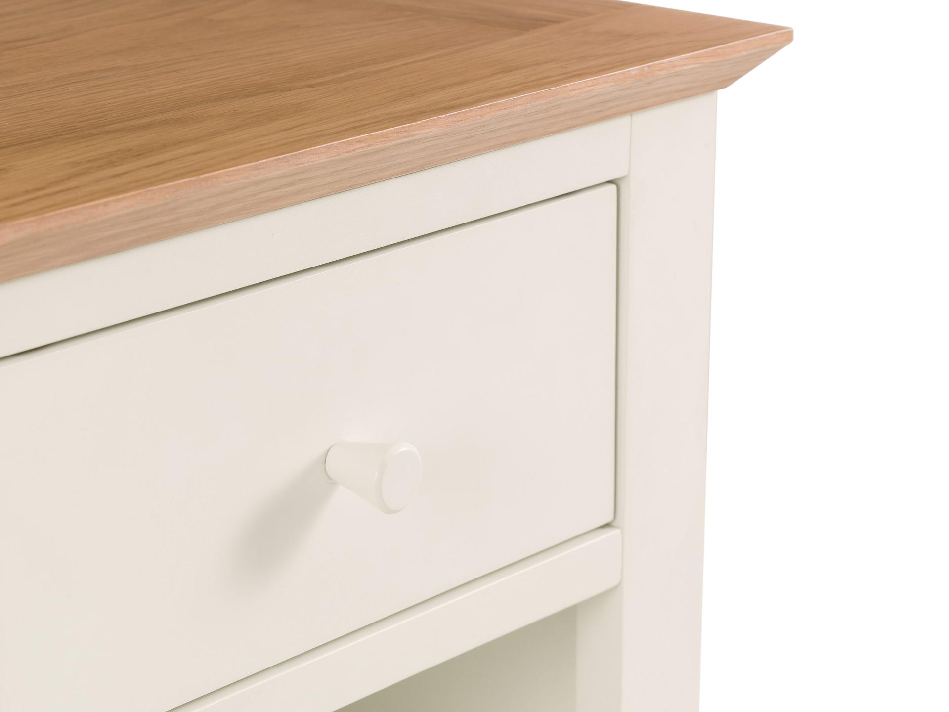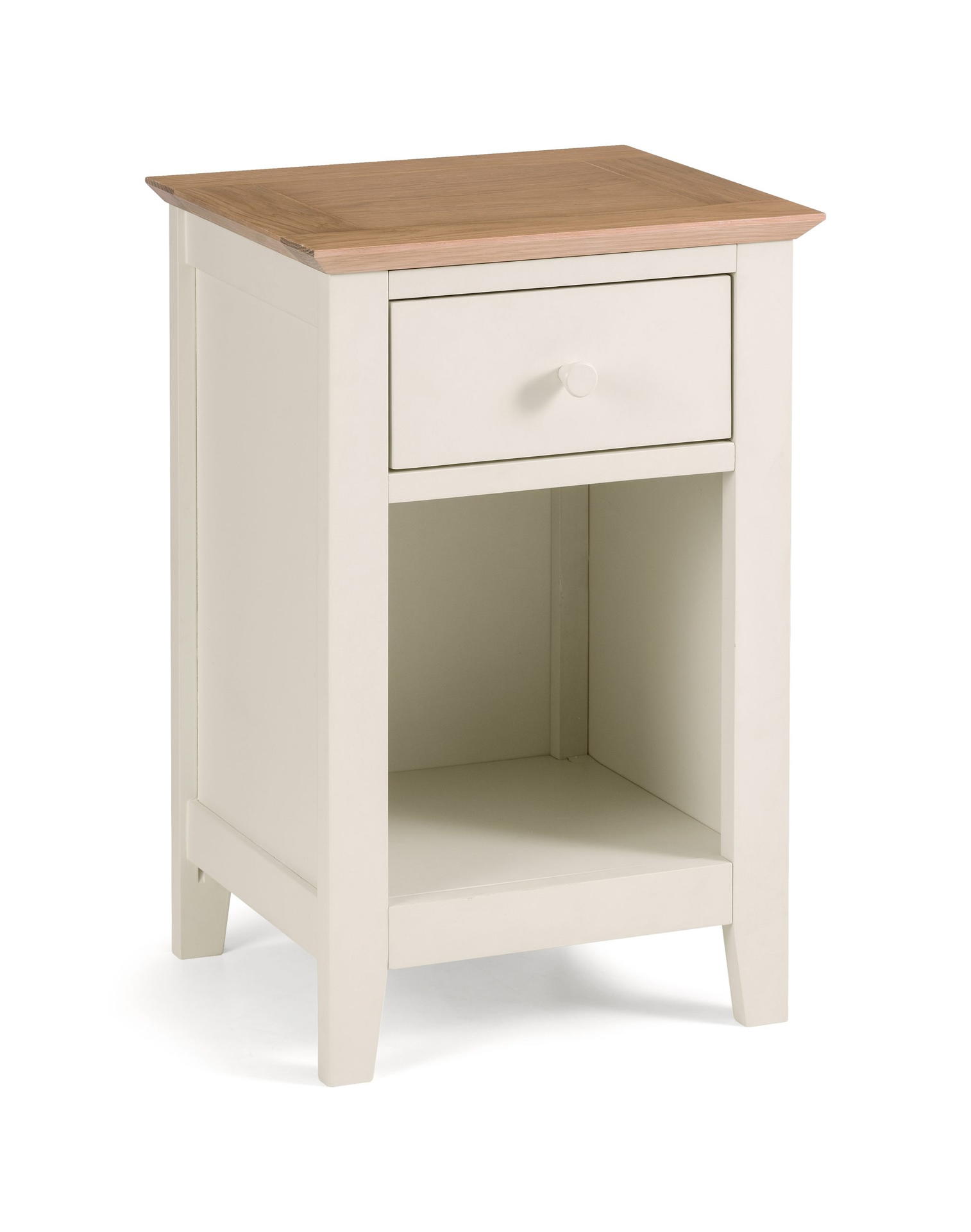 The Salerno Two-tone Ivory and Oak Bedside table is presented in the elegant Shaker style and incorporates a handy storage drawer. Its clean, simple design and compact sizing offers timeless appeal and will fit well into any bedroom space. Finished in a beautiful painted ivory with high grade White Oak veneer top, Salerno combines quality materials with robust construction into a classic design. Part of the extensive Salerno range of Beds and Bedroom Furniture in Solid Oak, Two-tone Ivory/Oak and Ivory finishes.