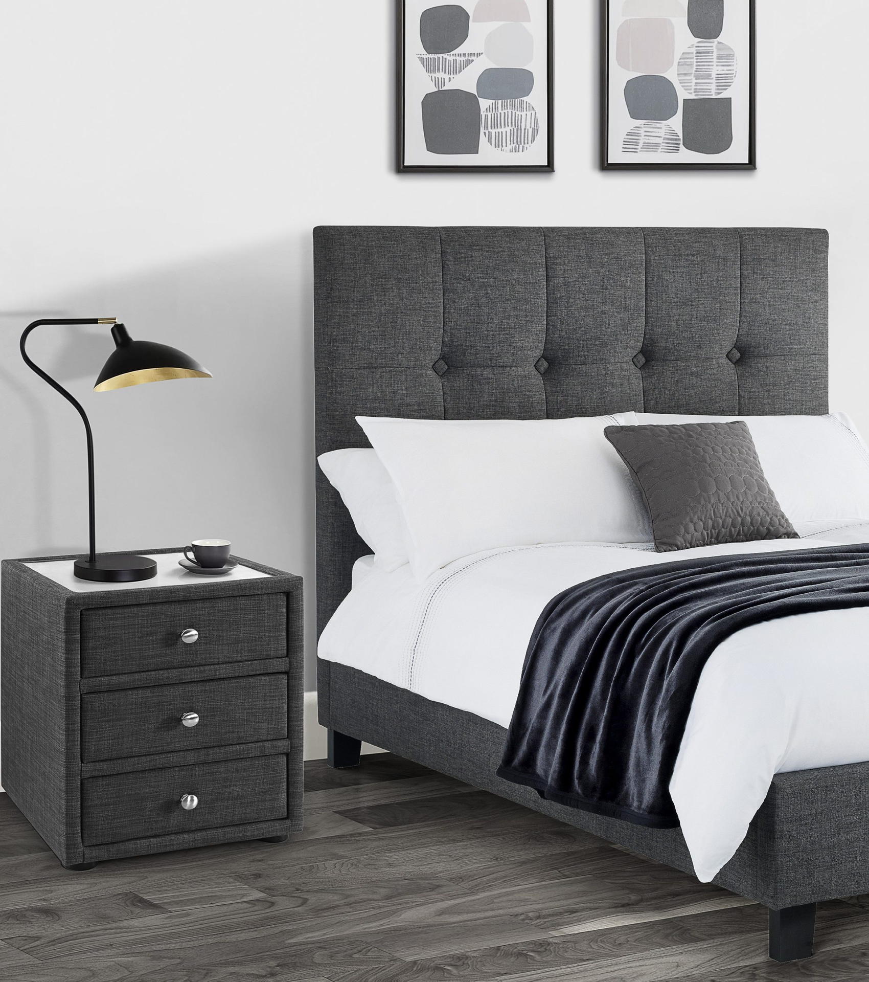 The Sorrento Bedside Cabinet is upholstered in a sophisticated slate grey linen fabric and features three well-sized drawers. It is topped with a tempered glass surface for added practicality. It is a perfect accompaniment for both of Julian Bowen’s Sorrento and Santorini beds, which are presented in the matching fabric.
