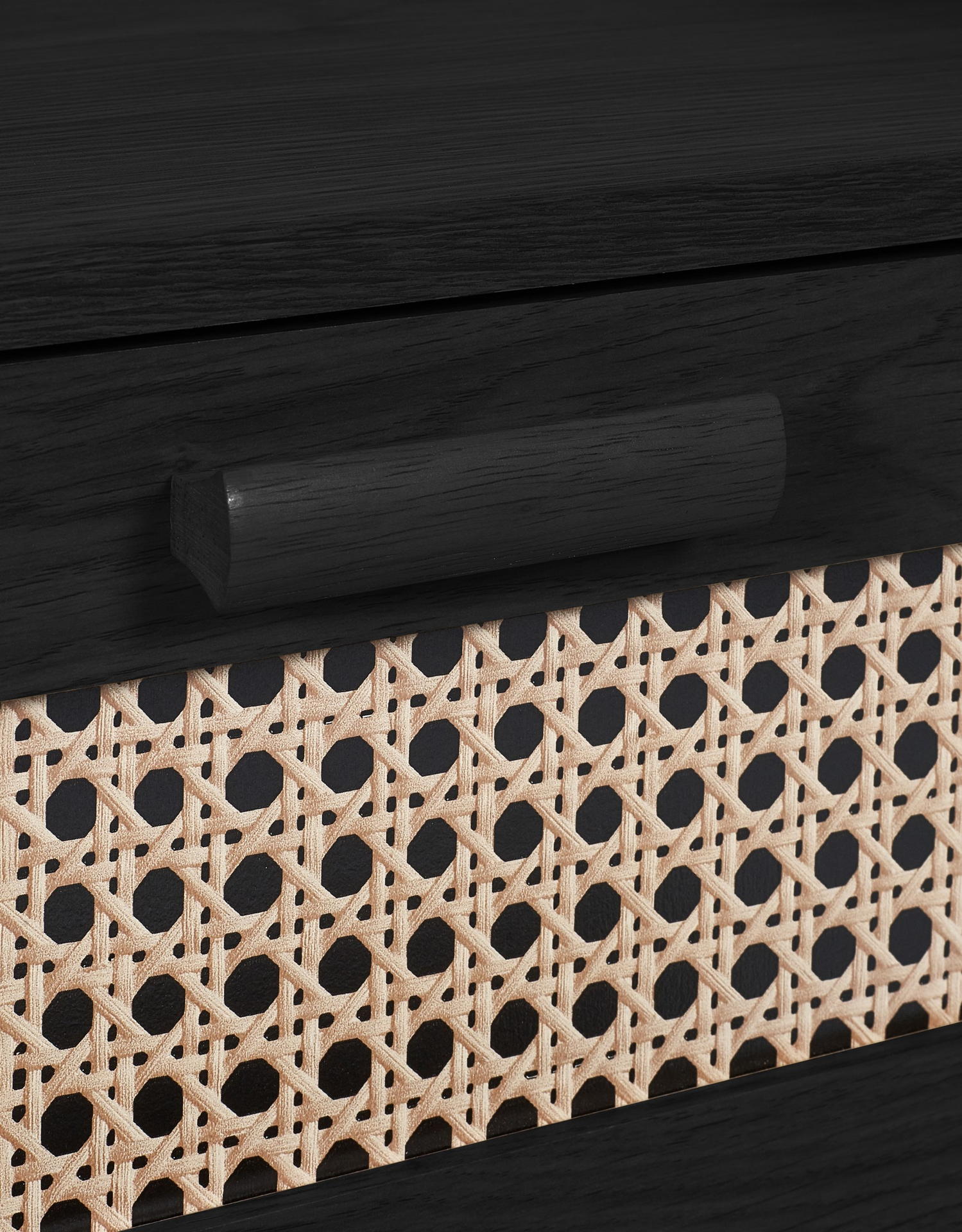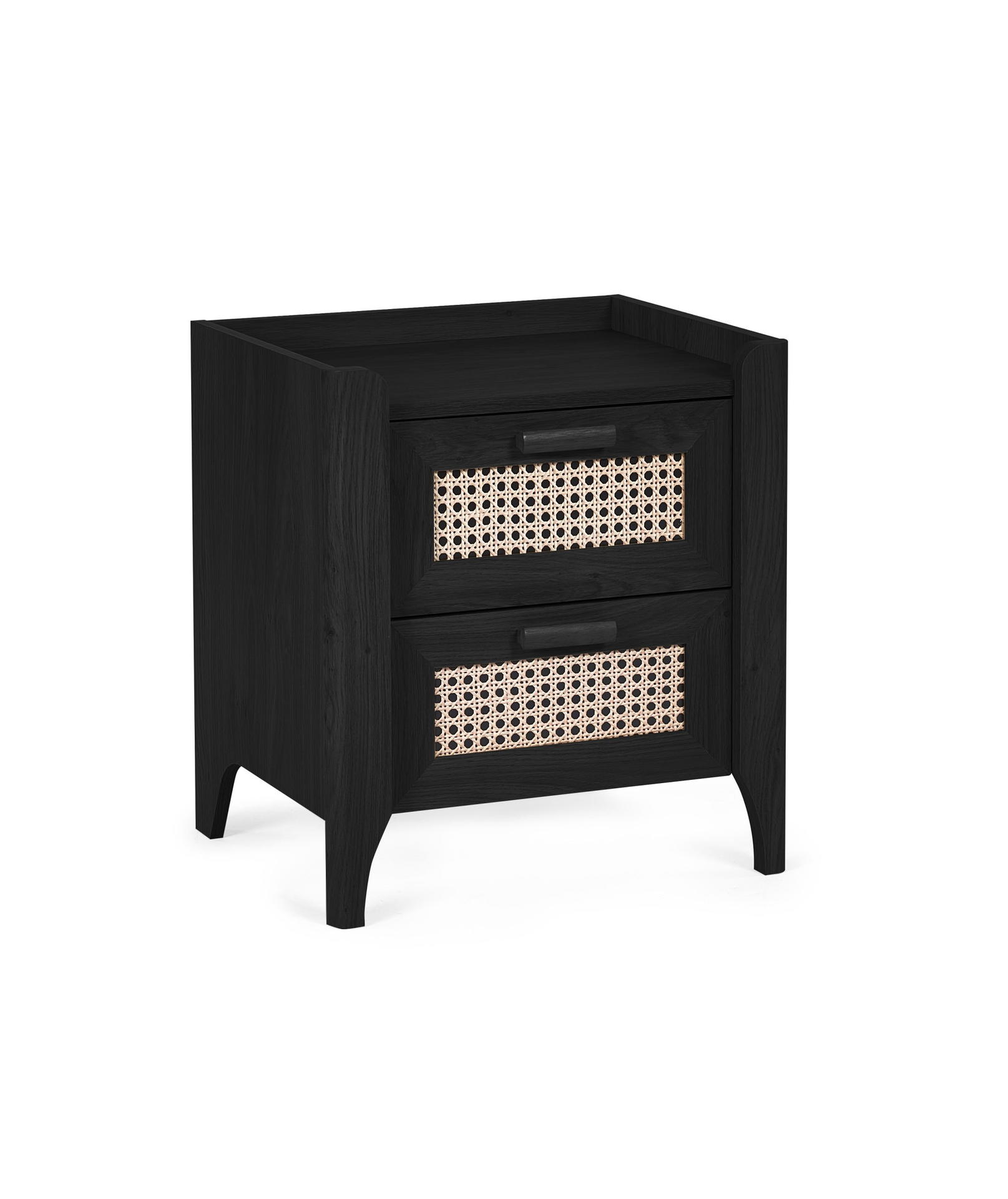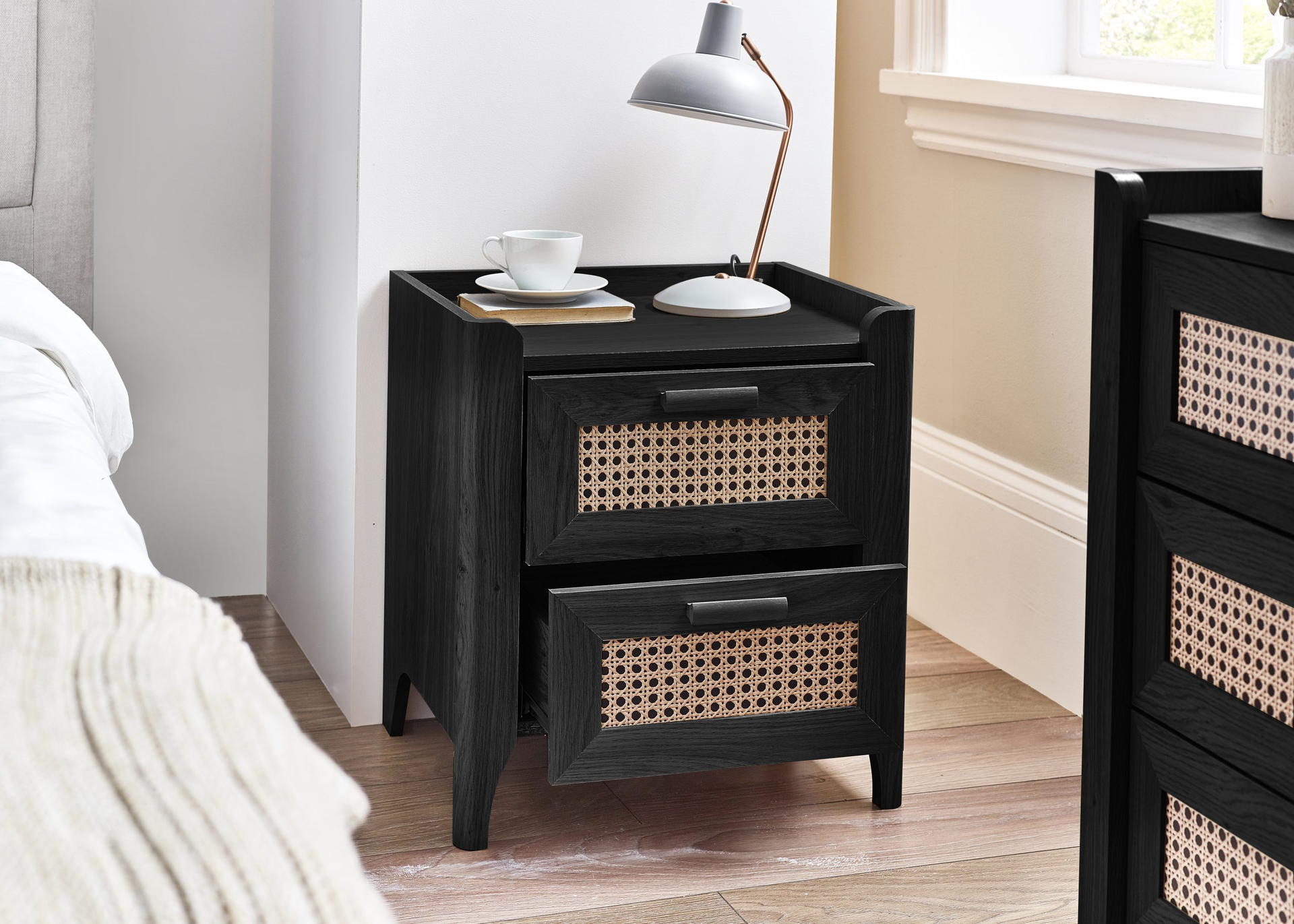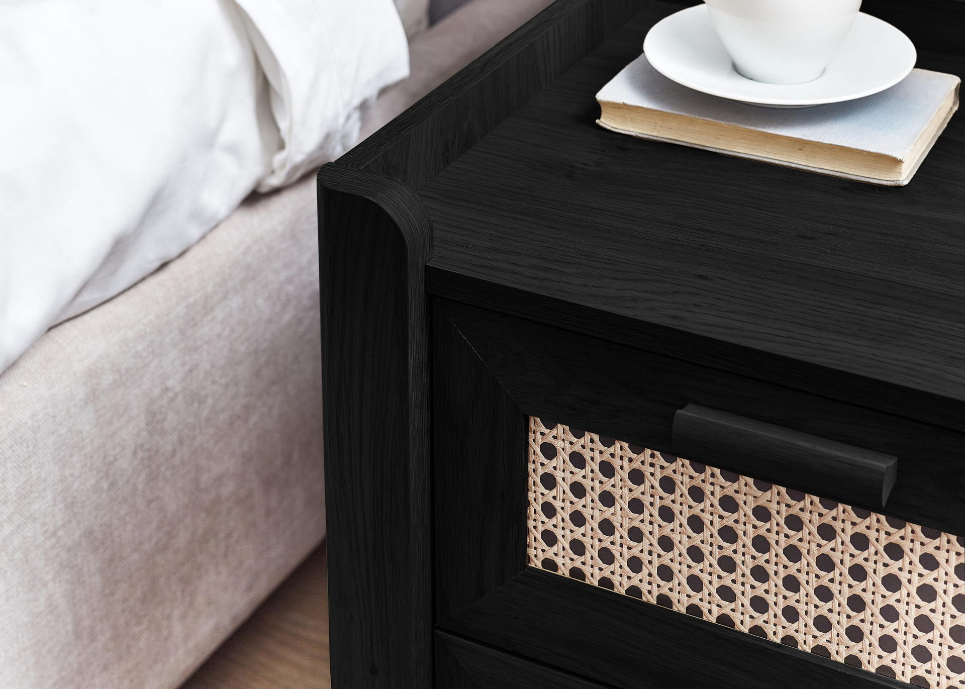 With its sleek design and bohemian flair, the Sydney 2 Drawer Bedside in Black Ash offers beautifully curved edges and a raised lip around the top for added practicality. The rattan print sticker on the front adds a natural touch, providing a clean and dust-free design with no gaps or holes. This bedside table features two spacious drawers with gloved handles for easy access, offering the perfect blend of storage and style. Minimal assembly is required for quick setup, making it a hassle-free addition to your home.
