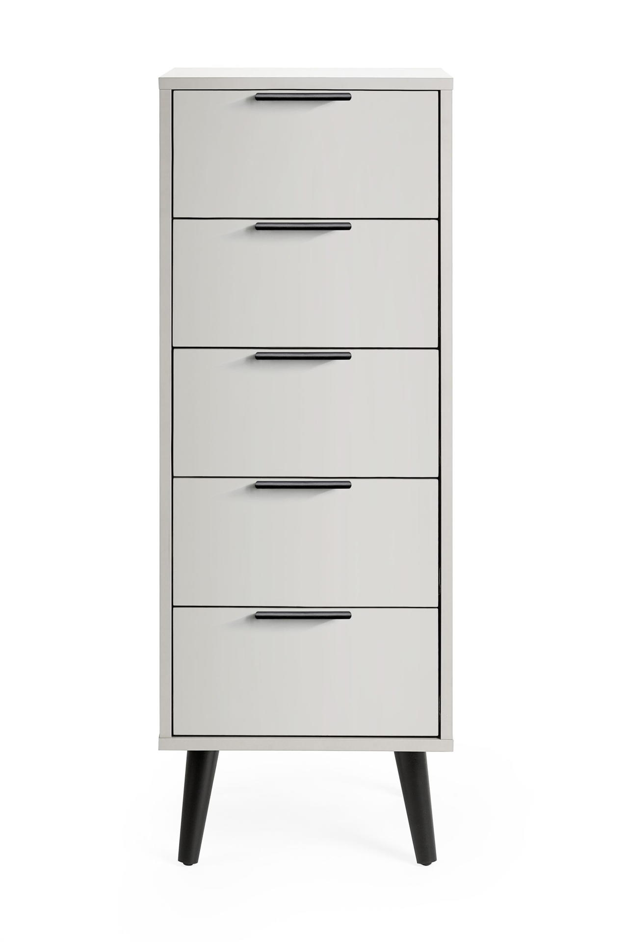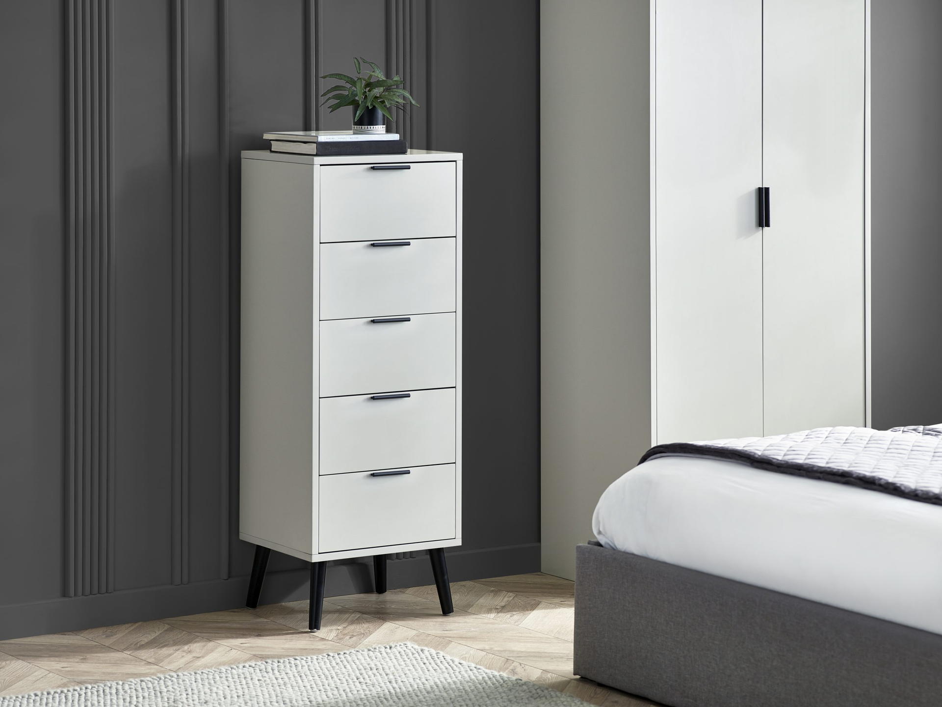 The Alba collection is a modern yet exquisitely elegant design, in a light grey lacquered finish with matt black handles and legs. Featuring beautifully soft-close draws, perfect to enhance any bedroom space. Presenting a smooth pull-out 5-drawer chest providing convenient storage space for all your essentials.