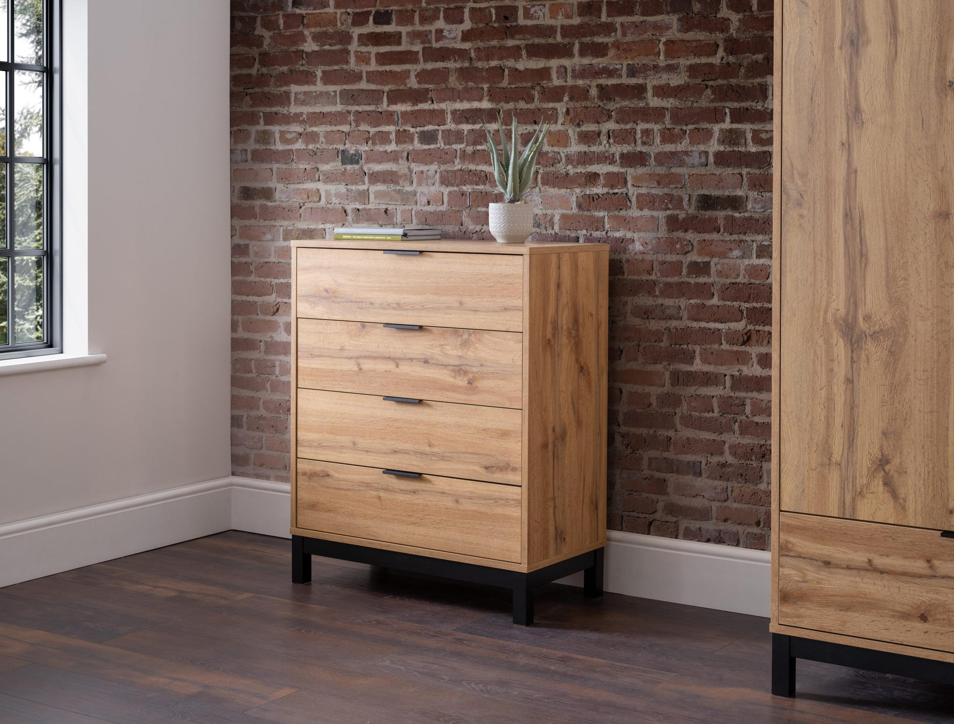 Using revolutionary click furniture technology, the Bali collection combines high quality style with simple assembly. With a modern oak finish and contrasting black legs and handles, the Bali collection creates a classic industrial look in your bedroom – leaving you with a high-quality interior, with low maintenance upkeep. This collection includes: 1 drawer bedside, 2 drawer bedside, 4 drawer chest, 6 drawer wide chest, dressing table/desk, wardrobe, and bookcase bed.
