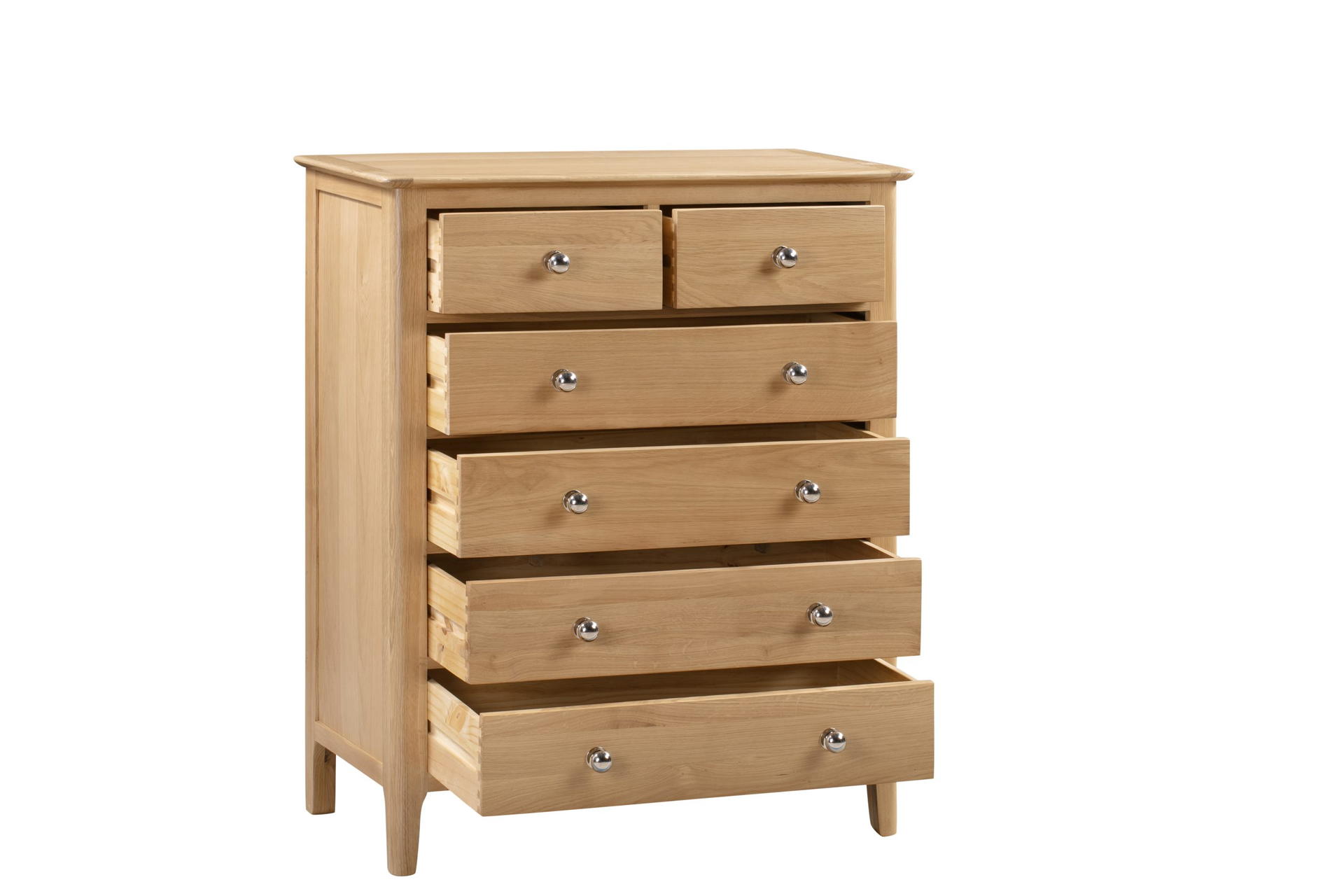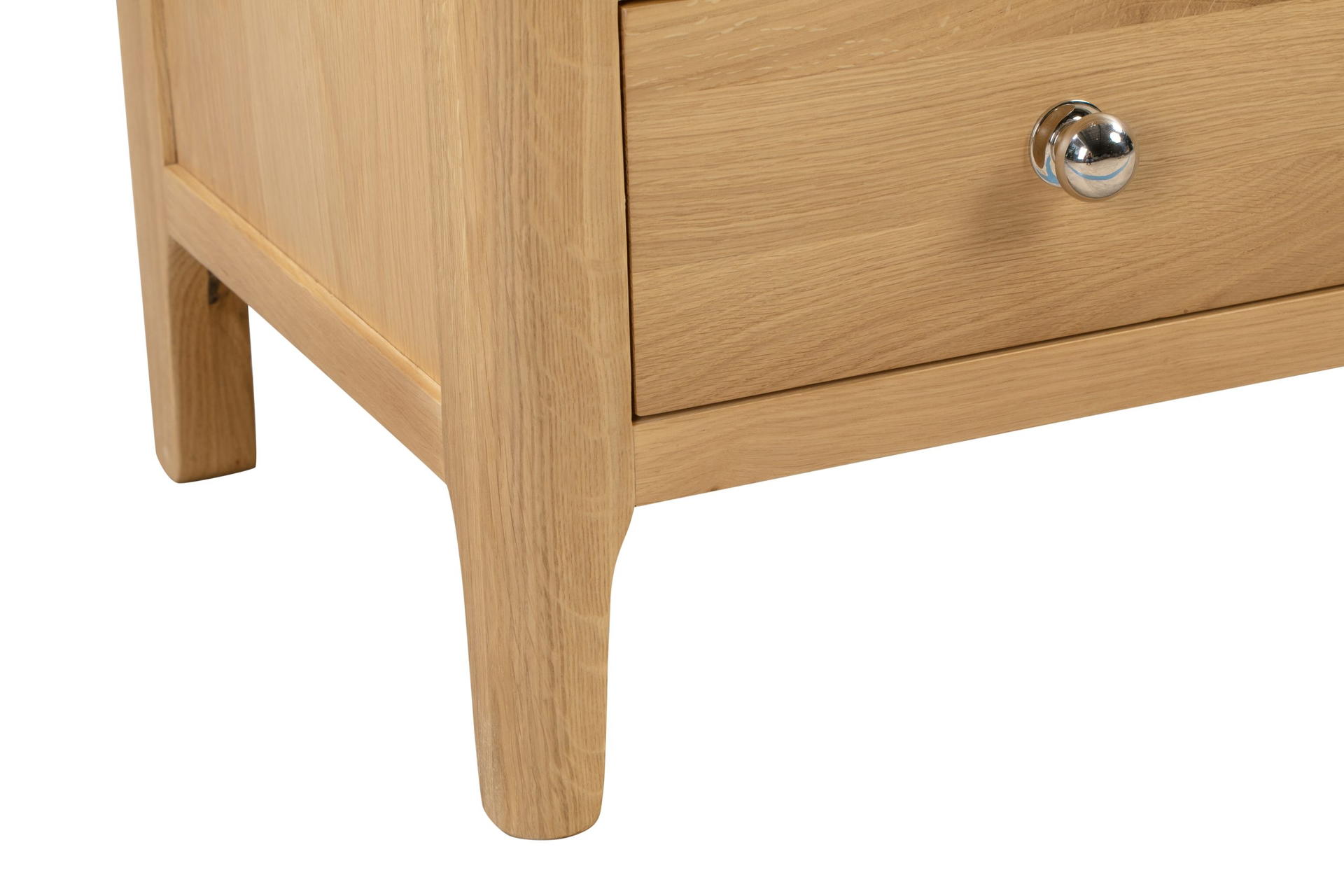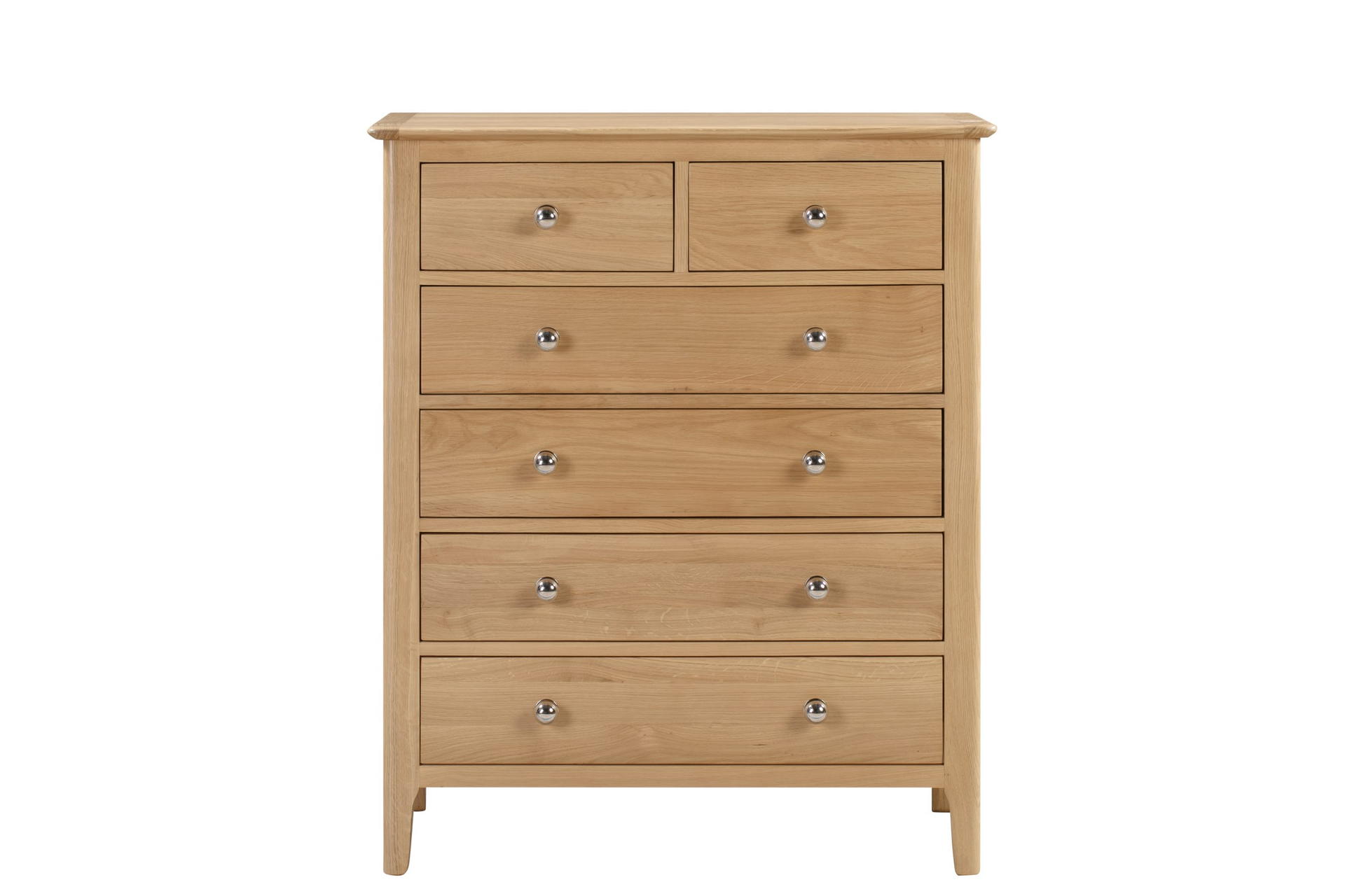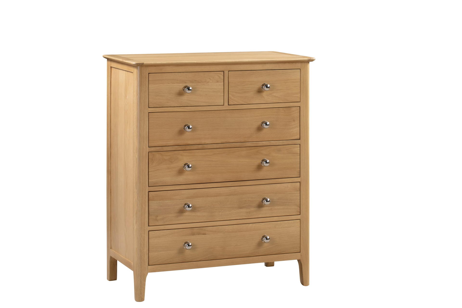 Crafted from solid oak and oak veneers, the Cotswold 4+2 Drawer Chest ensures lasting durability with its robust structure. Featuring two small drawers and four larger drawers, providing ample space for keeping your clothing organised. This simple, yet elegant design is finished with a round silver knob, perfect for any traditional bedroom.