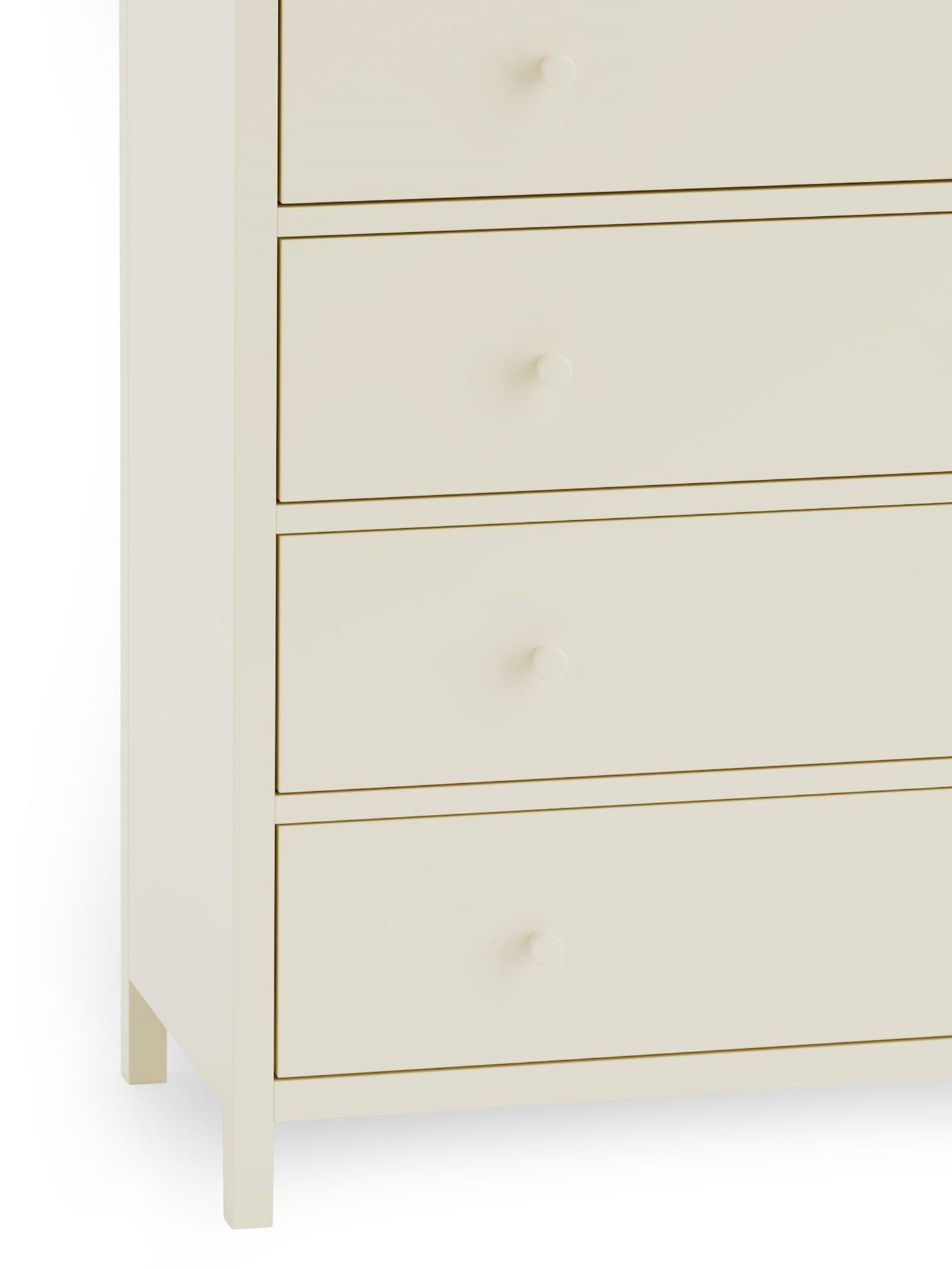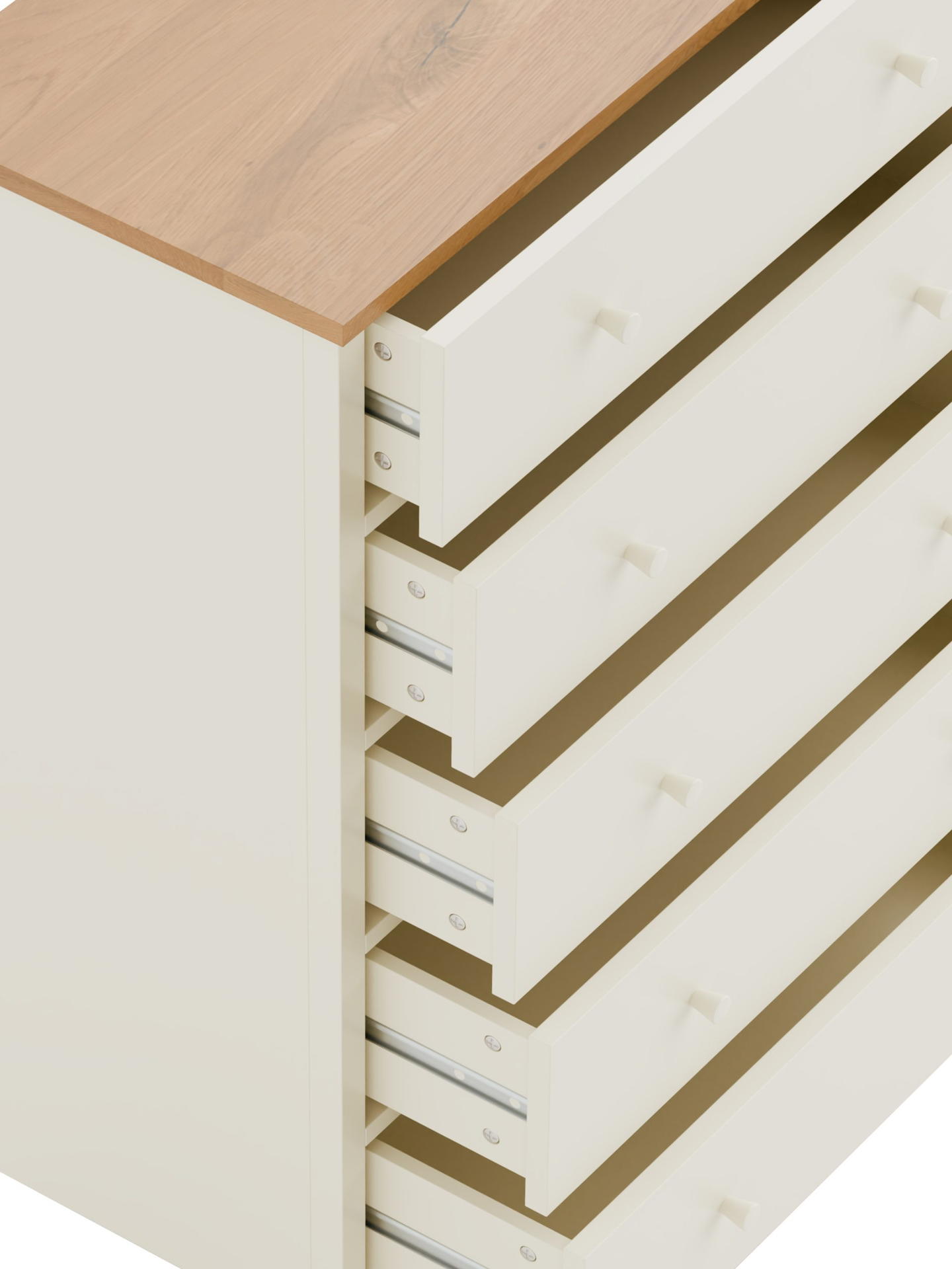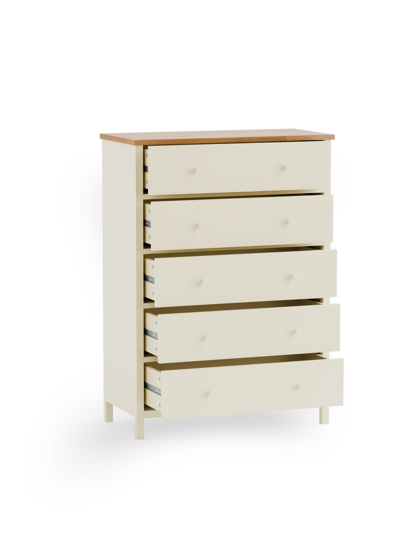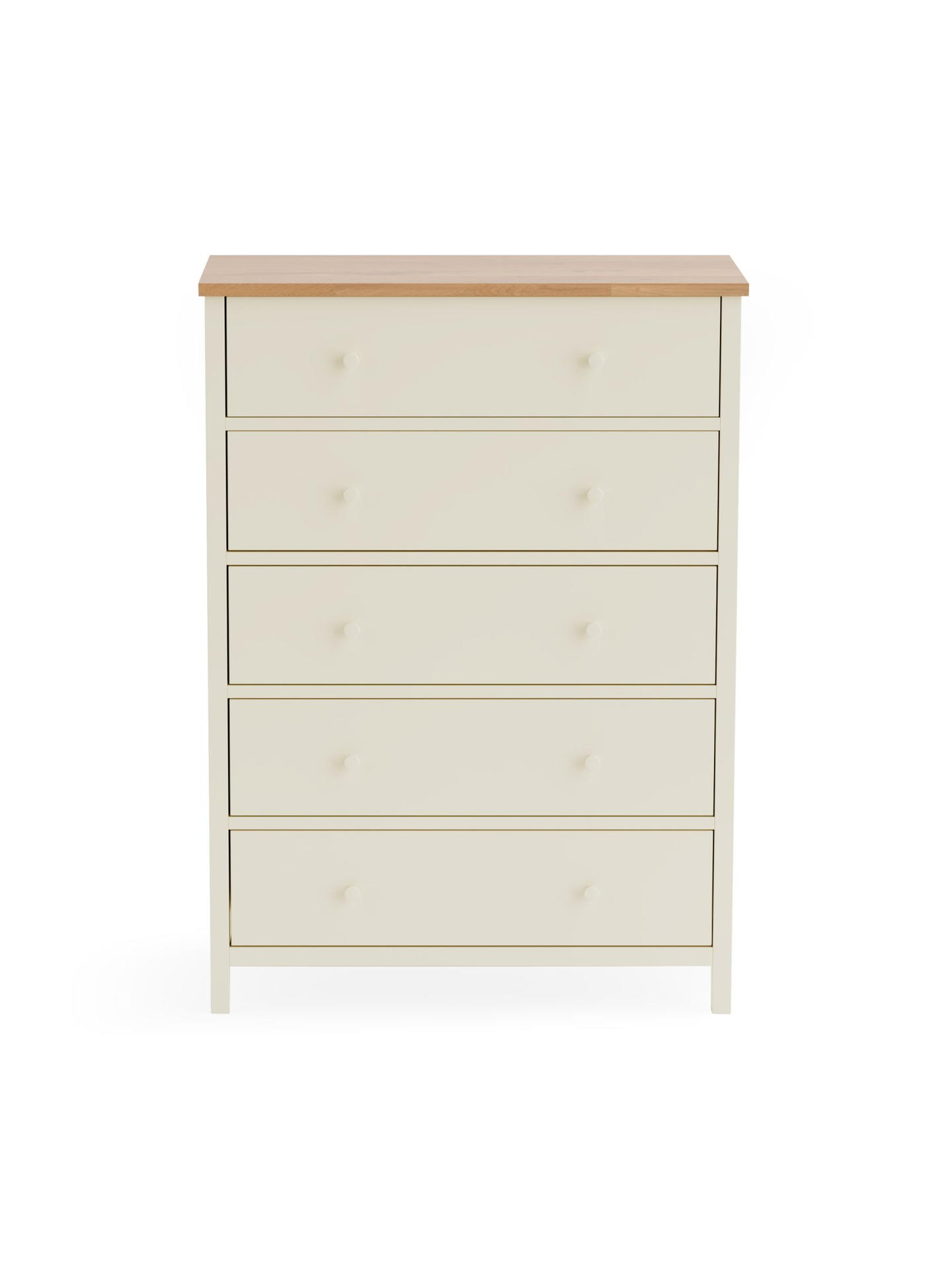 Upgrade your bedroom storage with the Coxmoor 5-Drawer Wide Chest in an elegant Ivory and Oak finish. Designed with five generously sized drawers, each equipped with sleek knob handles, this chest offers ample space for clothes, bedding, and other essentials. Its horizontal layout maximizes storage while creating a stylish focal point in your room. The blend of Ivory and Oak finish brings a sophisticated touch to your space, effortlessly complementing a variety of décor styles. Built for durability, this chest is a timeless addition to any home, combining both practical storage and elegant design. Requires minimal assembly.