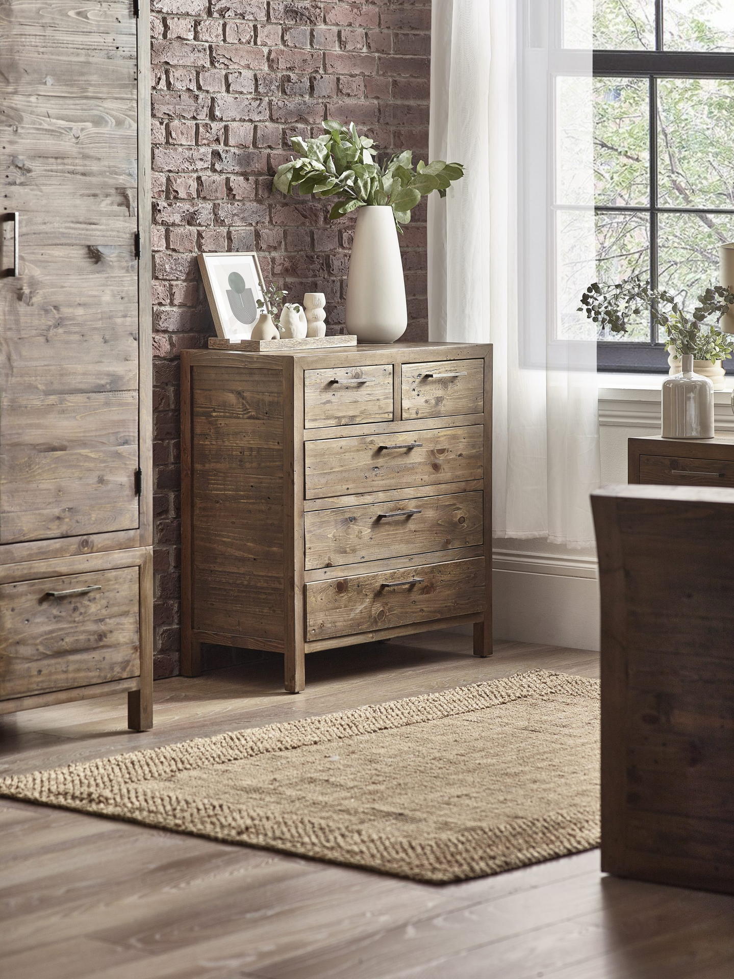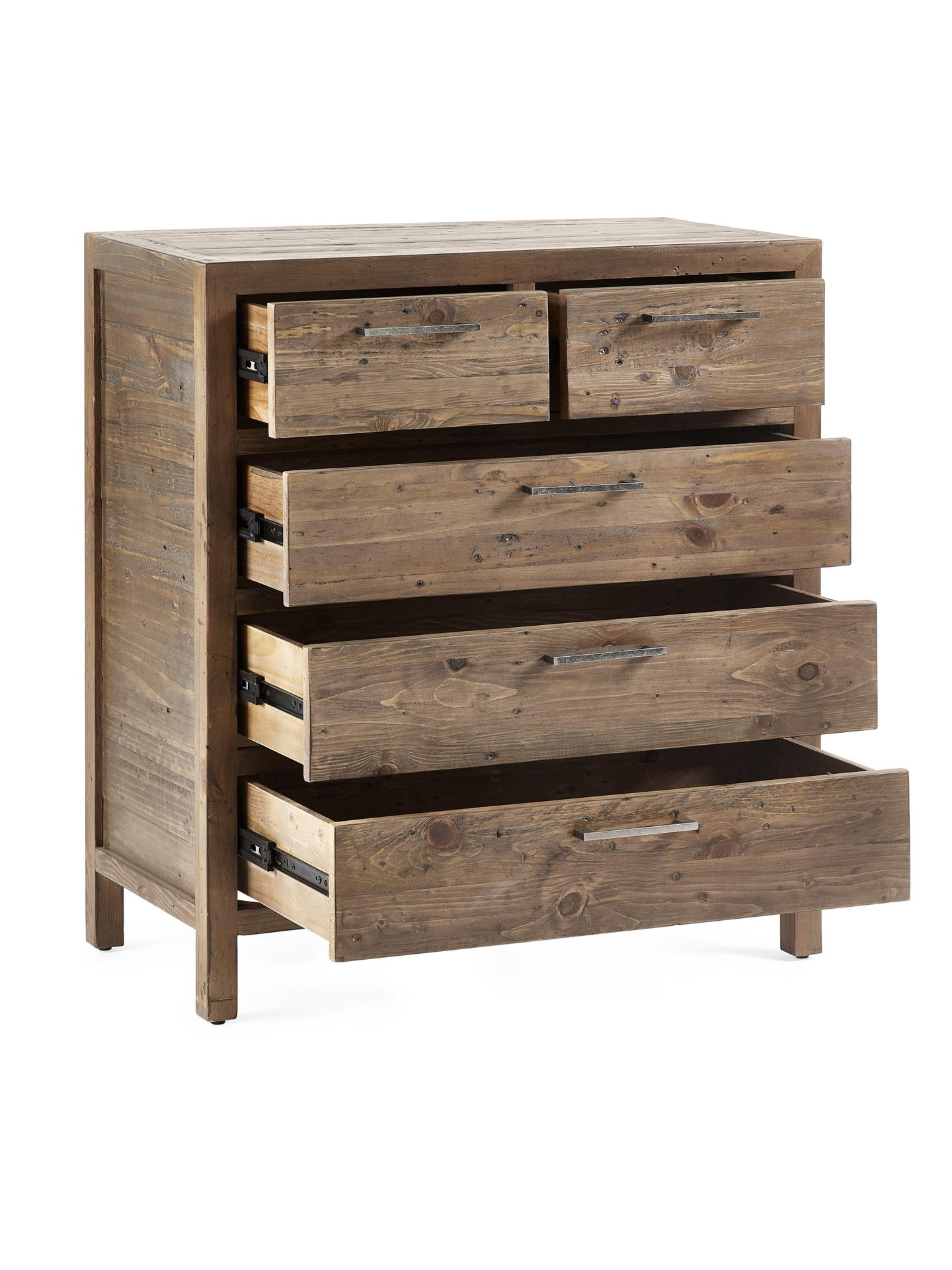 Heritage is constructed using reclaimed and recycled wood – making each piece unique and distinct. The Heritage 3+2 Drawer Chest has a distressed finish and is combined with industrial style metal handles that complete the look. The original imperfections are what make these pieces so unique and provide a distinct character in your bedroom space. With spacious drawers, this chest not only looks good, but provides the storage space you need. See the wide ranging Heritage Collection for the perfect matching pieces.
