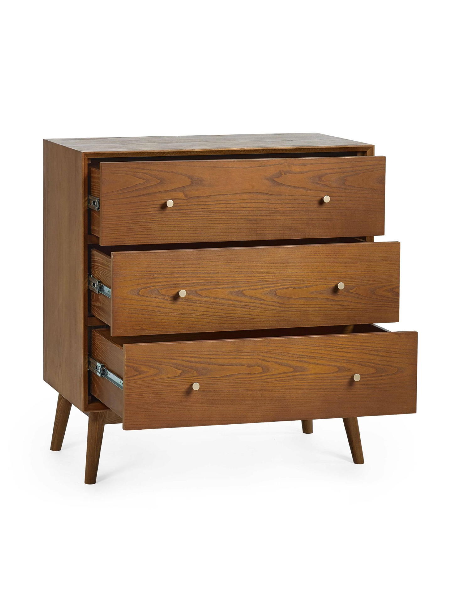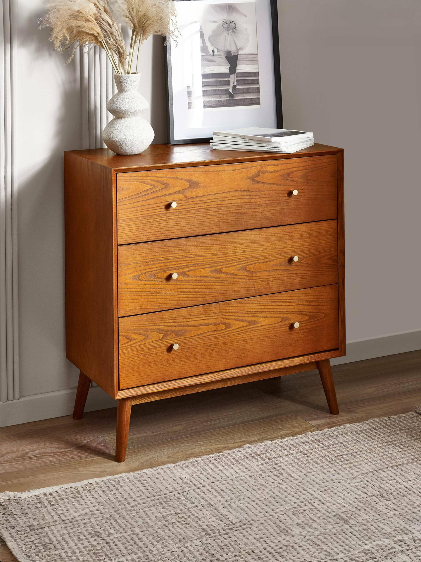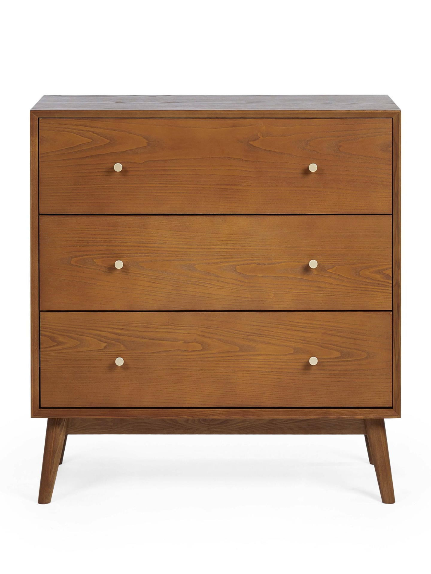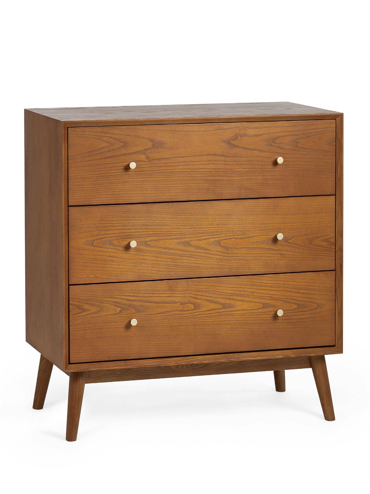 A retro-inspired style with a nostalgic feel, the Lowry Bedroom collection is a gorgeous timeless design that will add character and depth to any bedroom space. Constructed from an exquisite cherry ash wood veneer with beautifully tapered legs, complemented by golden framed knobs. The Lowry 3-drawer chest features 3 drawers for convenient storage usage.