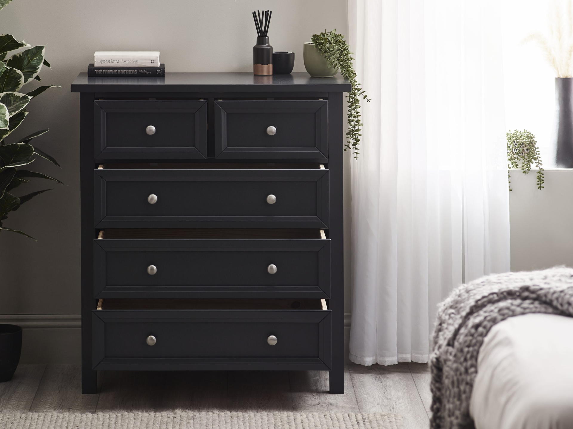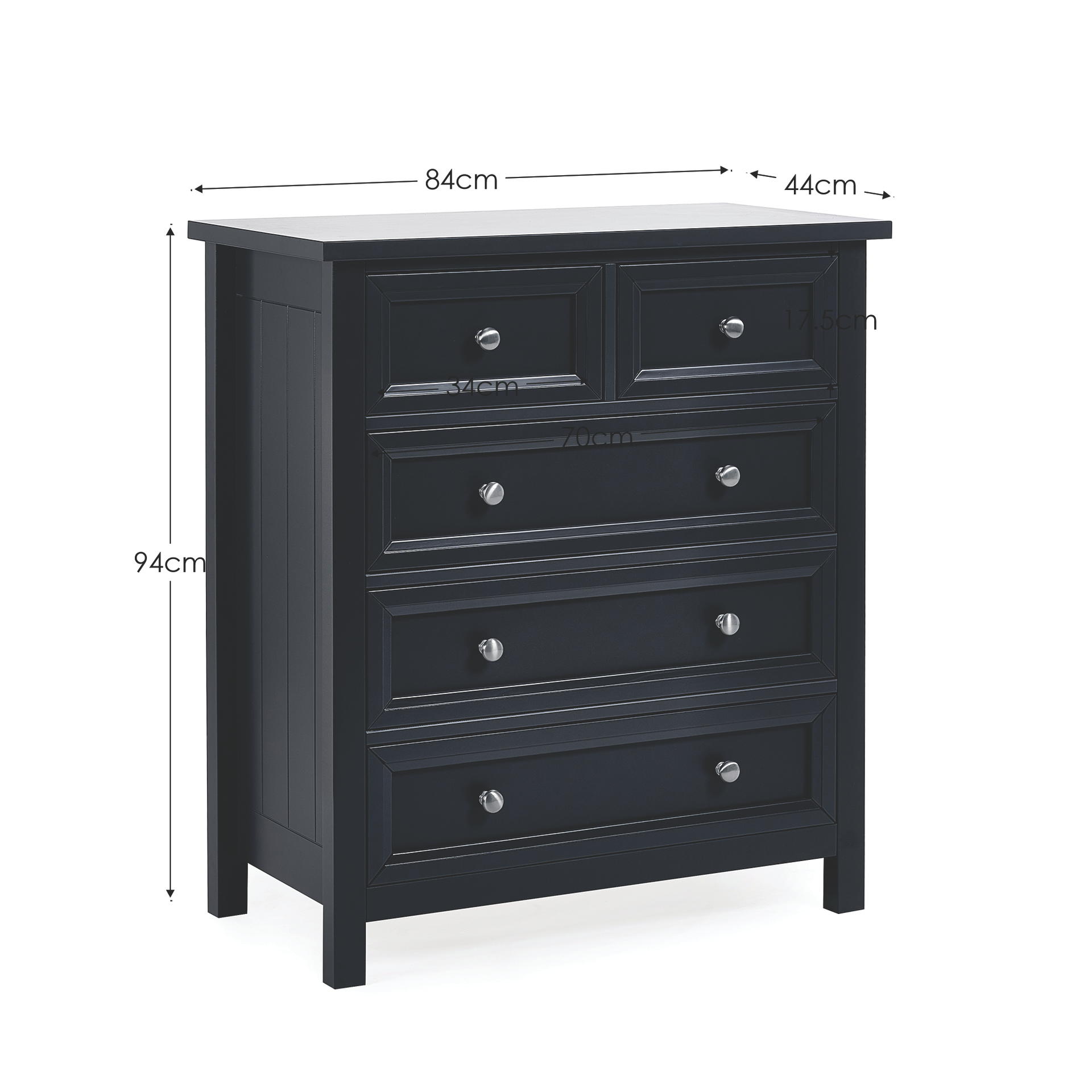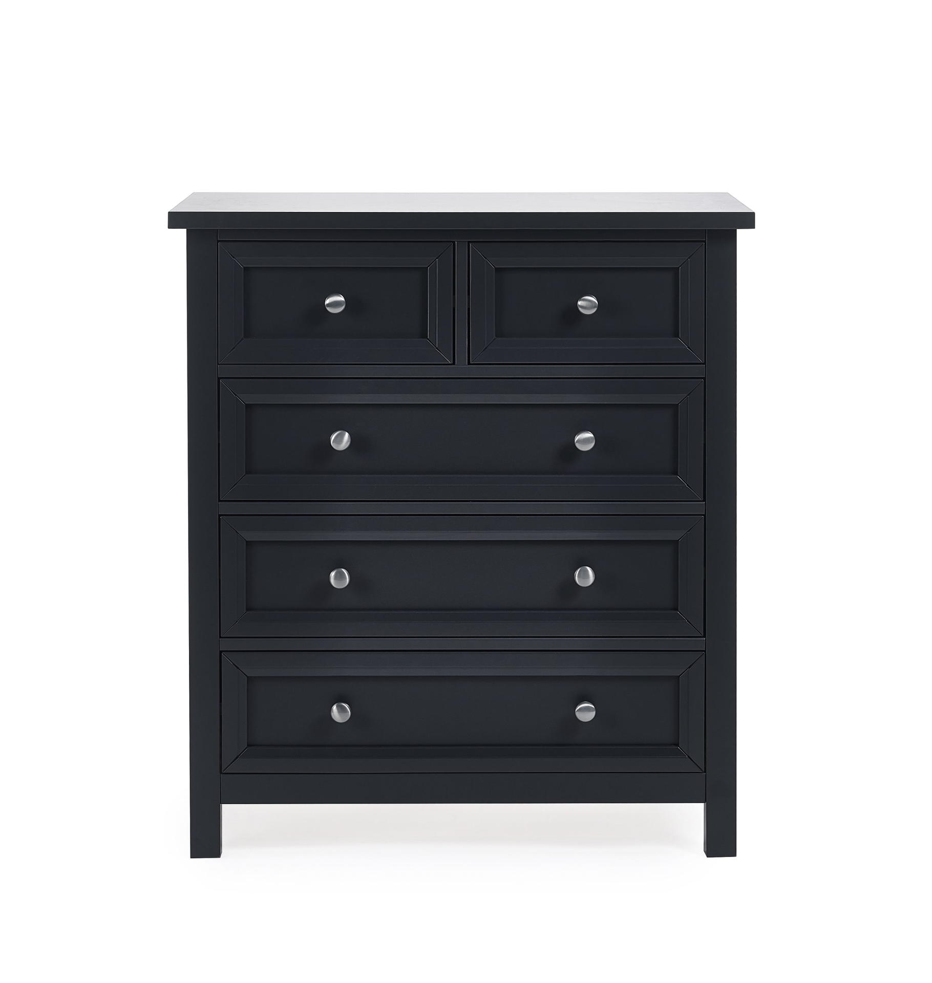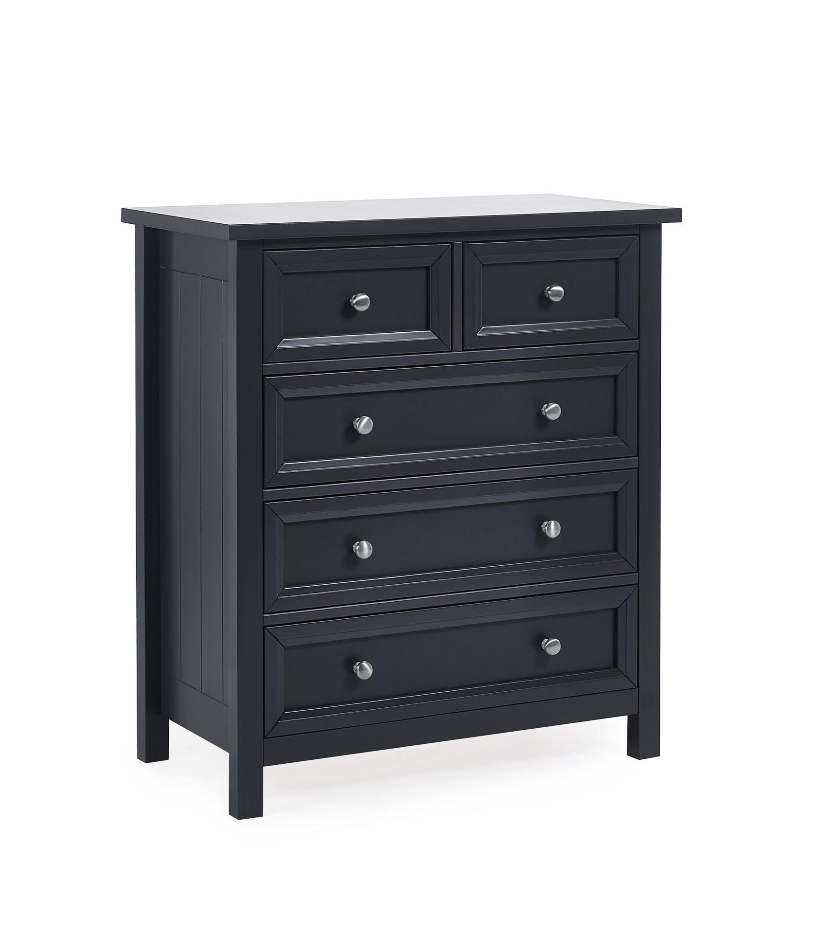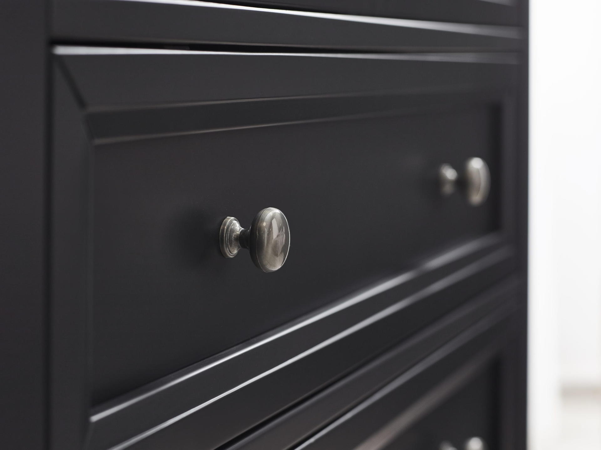 Maine is an elegant New England style range of bedroom furniture. The combination of exquisite anthracite lacquered finish with characteristic side panelling and detailed chamfered cabinetry makes for a soothing and refined aesthetic with timeless appeal, while delicate pewter handles add the perfect finishing touch. The Maine 3+2 drawer chest offers great storage with three large drawers topped with two smaller drawers.