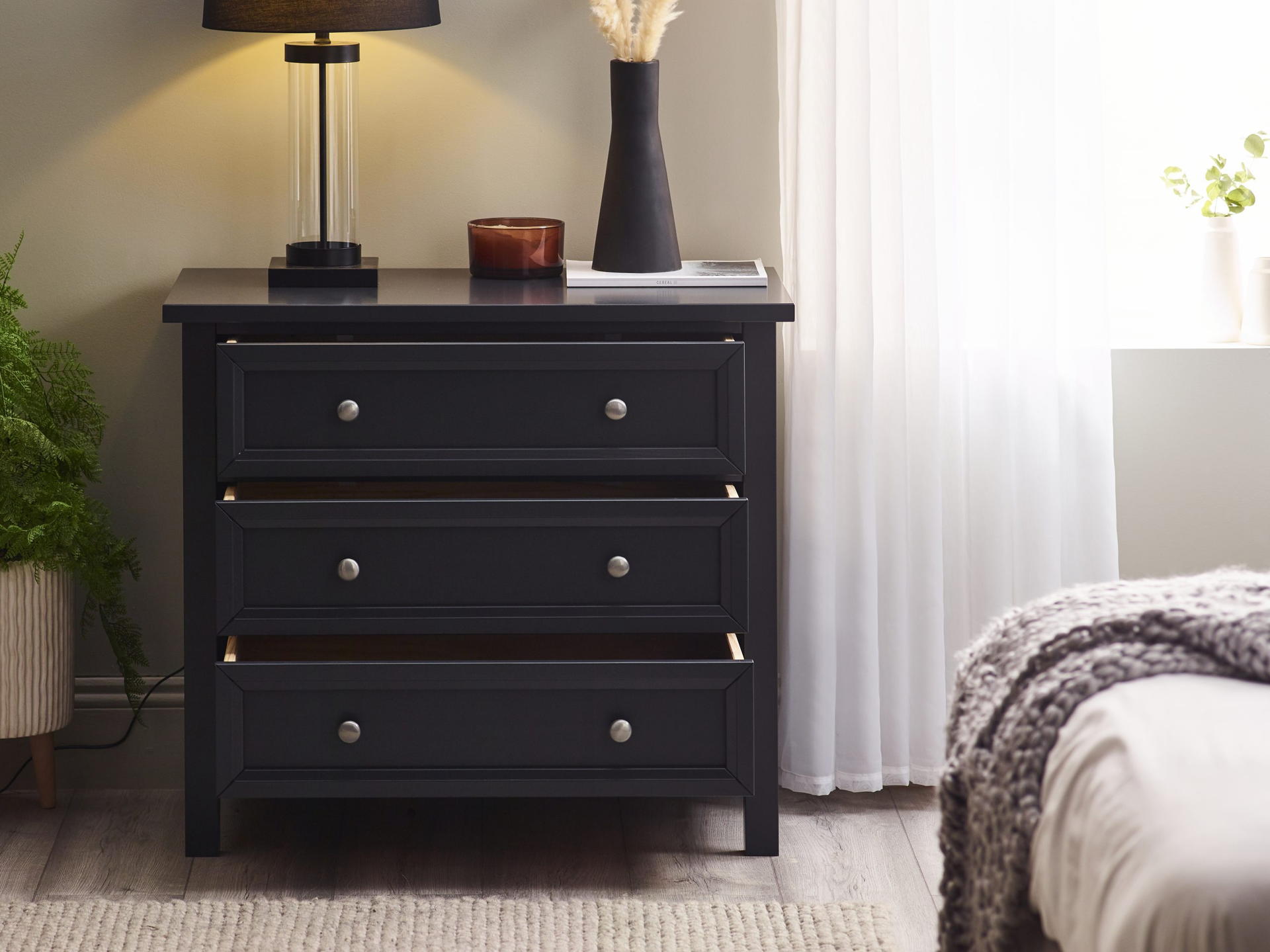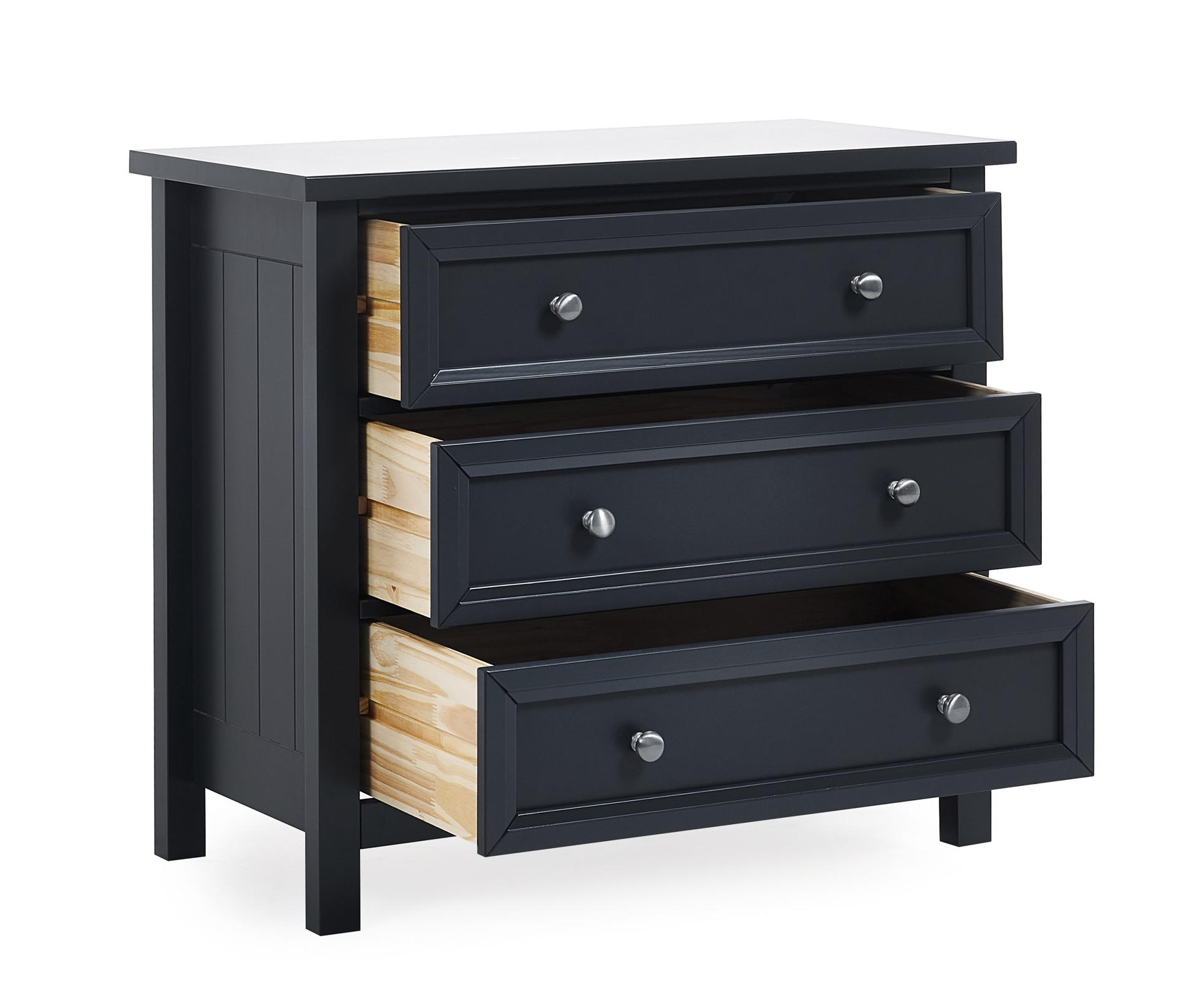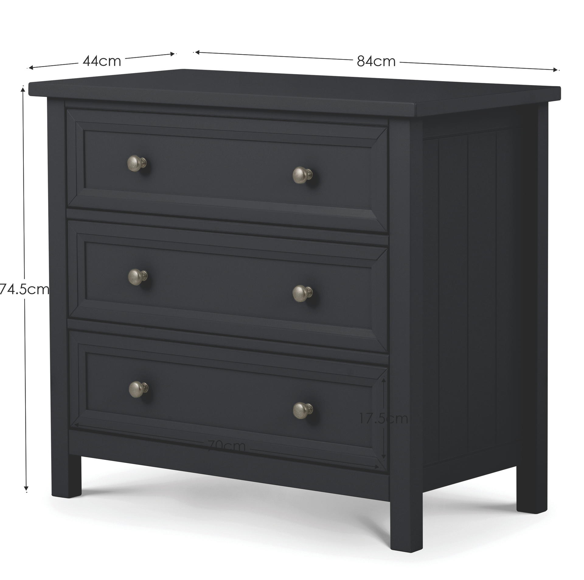 Maine is an elegant New England style range of bedroom furniture. The combination of exquisite anthracite lacquered finish with characteristic side panelling and detailed chamfered cabinetry makes for a soothing and refined aesthetic with timeless appeal, while delicate pewter handles add the perfect finishing touch. The Maine 3 drawer chest offers three large storage drawers.