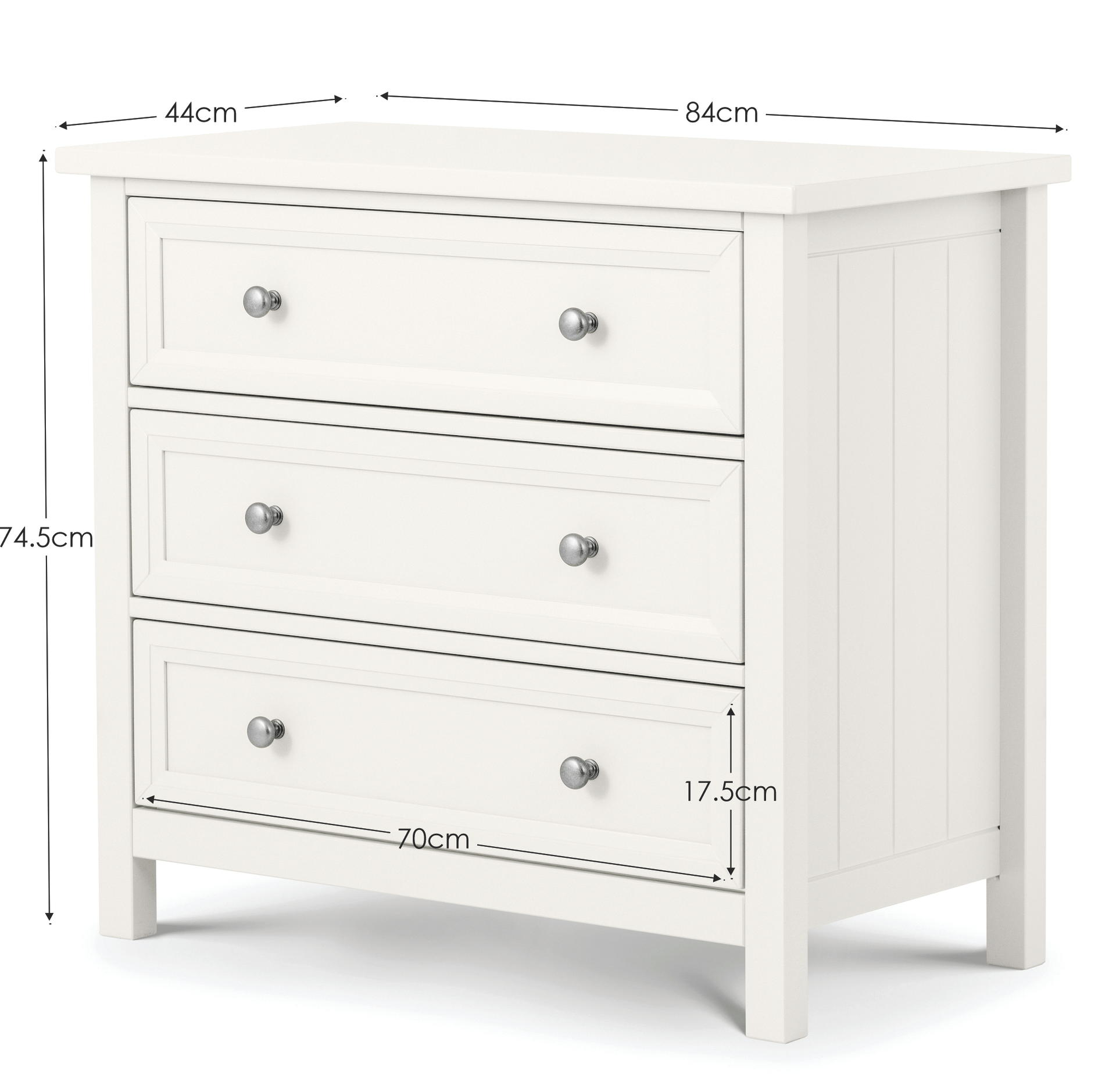 Maine is an elegant New England style range of bedroom furniture. The combination of exquisite surf white lacquered finish with characteristic side panelling and detailed chamfered cabinetry makes for a soothing and refined aesthetic with timeless appeal, while delicate pewter handles add the perfect finishing touch. The Maine 3 drawer chest offers three large storage drawers.