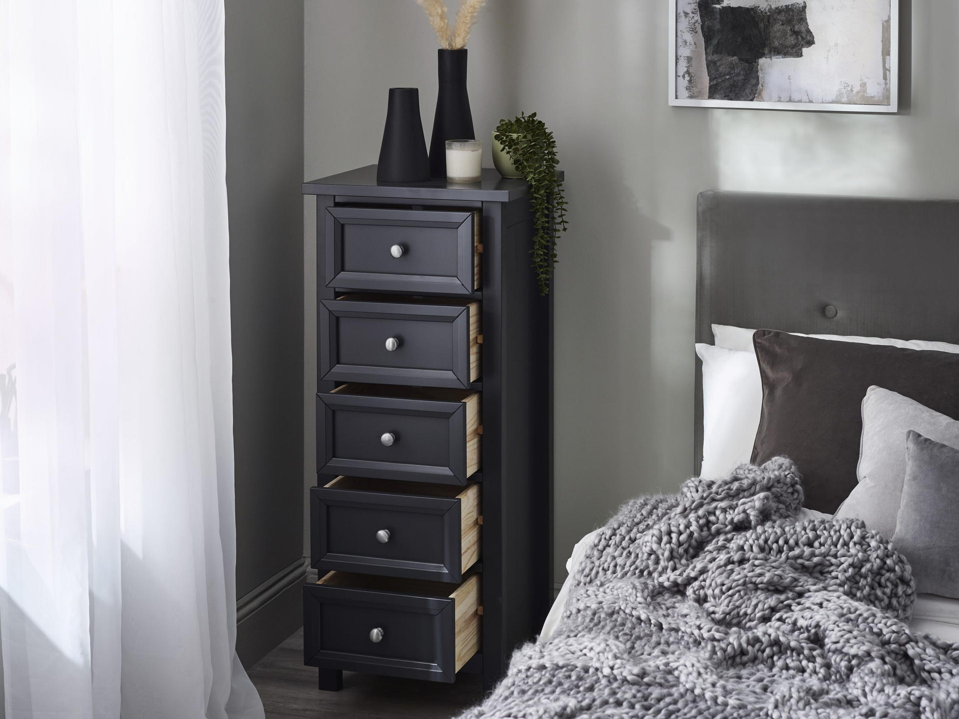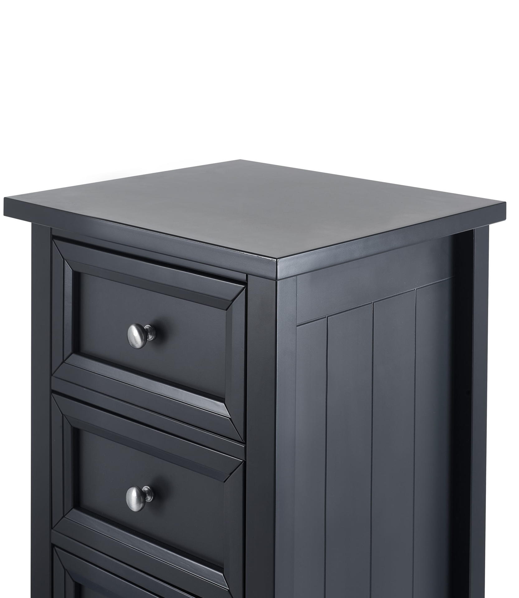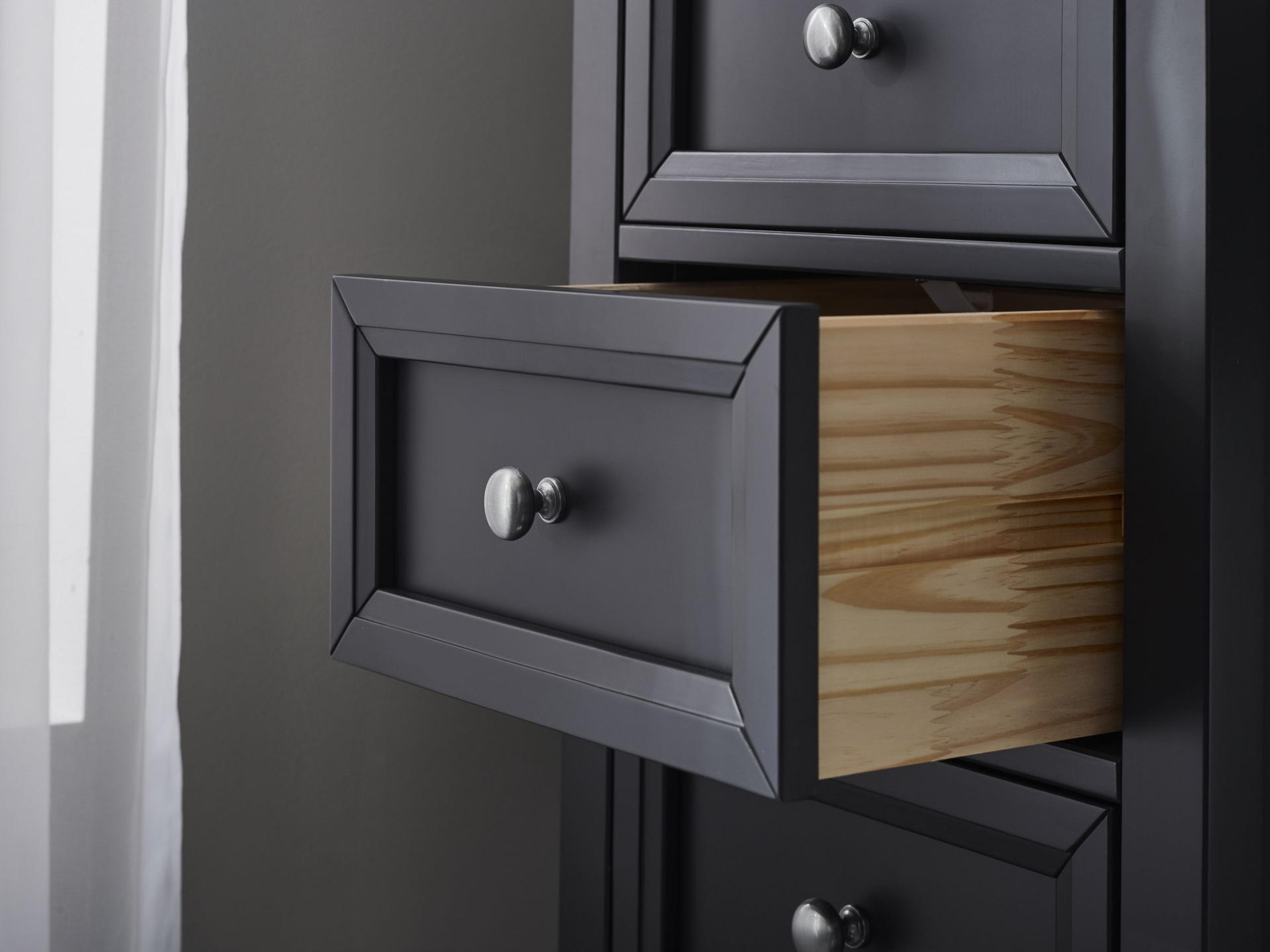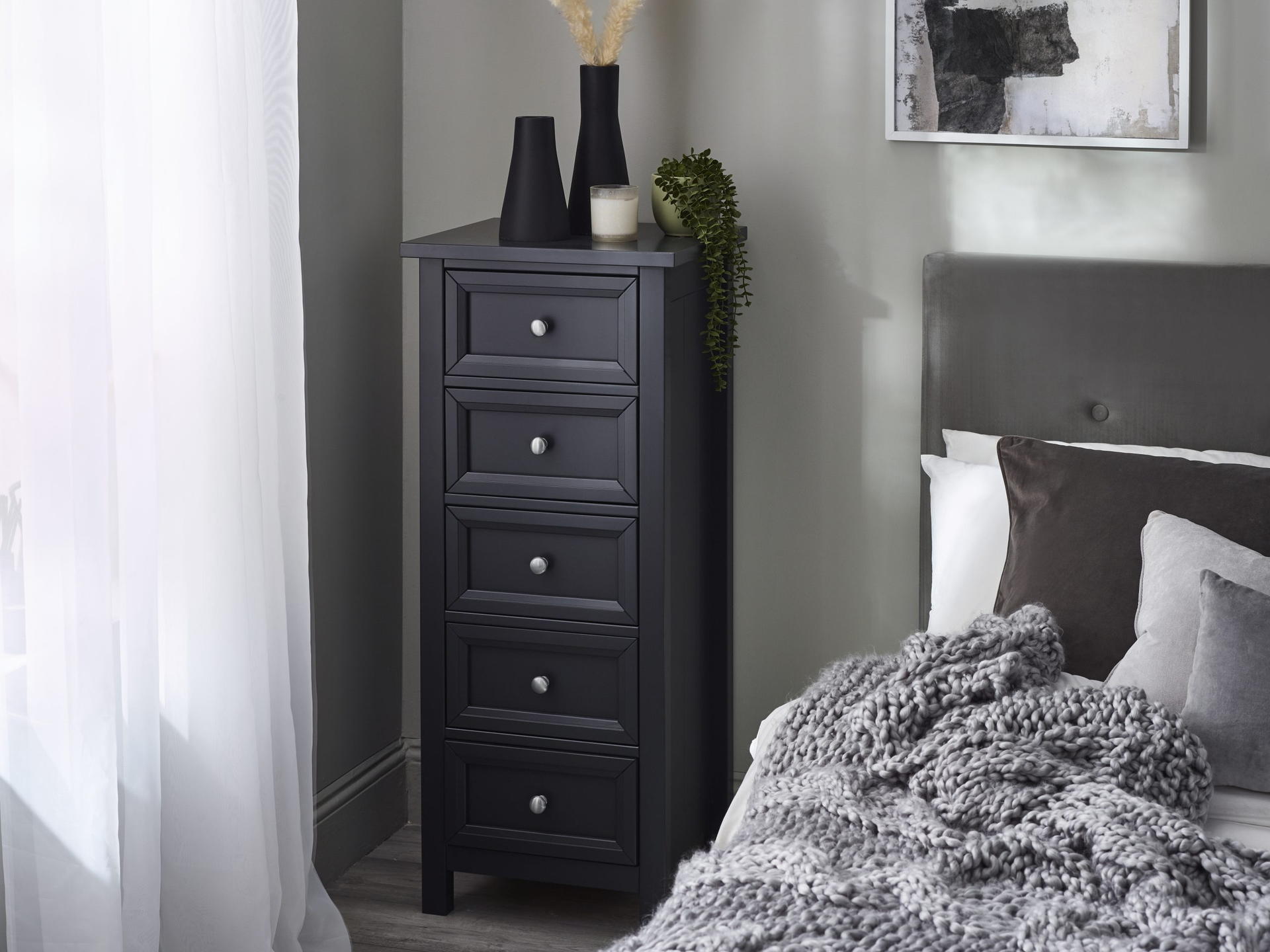 Maine is an elegant New England style range of bedroom furniture. The combination of exquisite anthracite lacquered finish with characteristic side panelling and detailed chamfered cabinetry makes for a soothing and refined aesthetic with timeless appeal, while delicate pewter handles add the perfect finishing touch. The Maine 5 drawer tall chest’s compact footprint makes it a great storage solution for smaller bedrooms