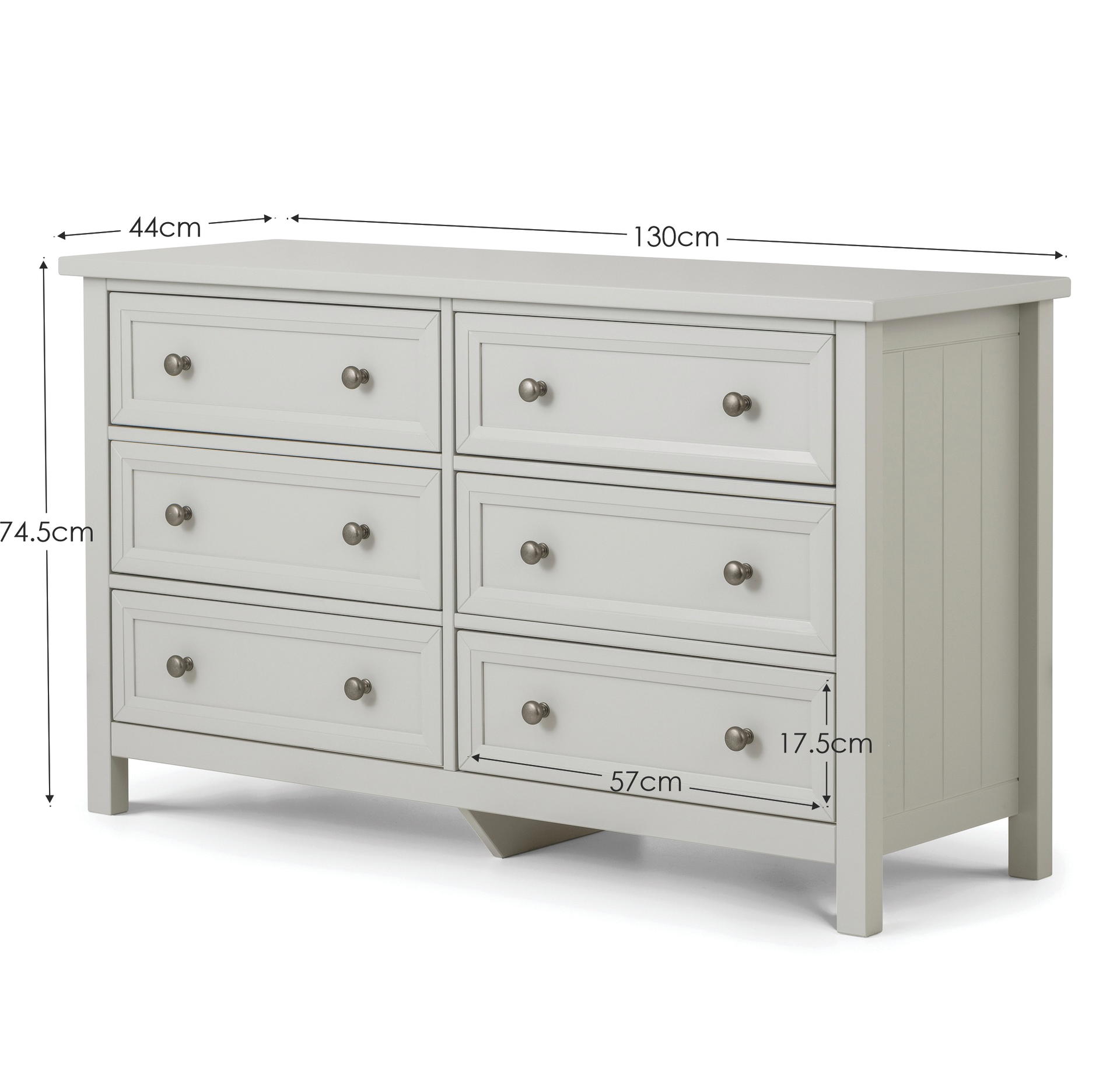 Maine is an elegant New England style range of bedroom furniture. The combination of exquisite dove grey lacquered finish with characteristic side panelling and detailed chamfered cabinetry makes for a soothing and refined aesthetic with timeless appeal, while delicate pewter handles add the perfect finishing touch. The Maine 6 drawer wide chest offers copious amounts of storage and can also be used as a dressing table