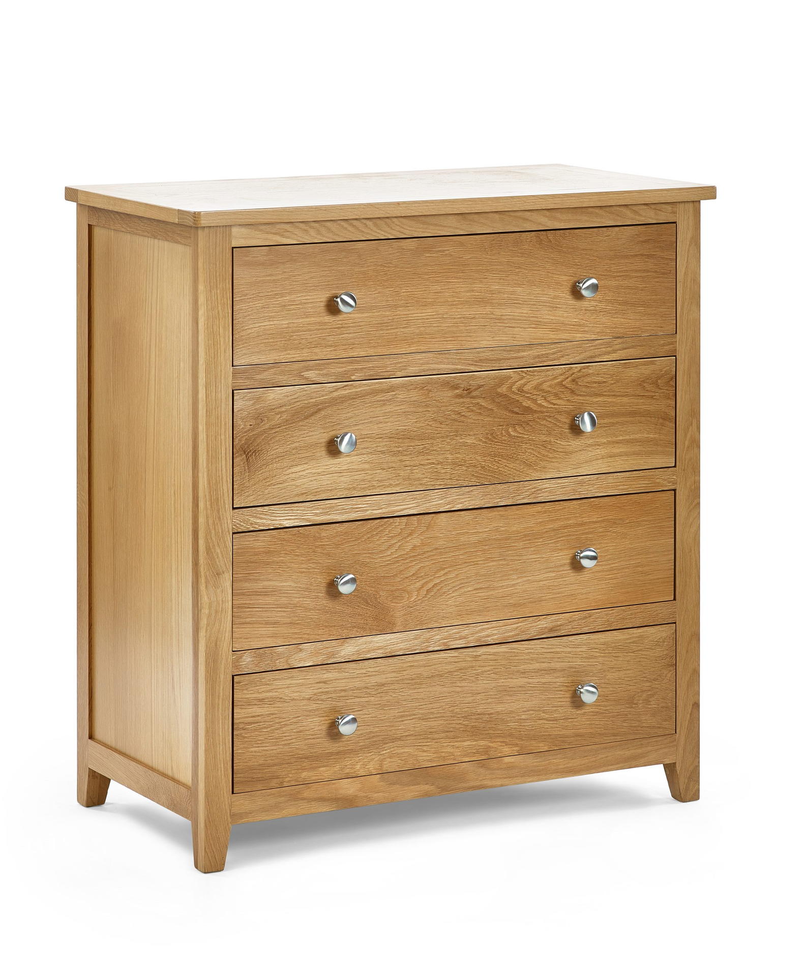 Crafted from solid oak and oak veneers, the Mallory 4 Drawer Chest features 4 generously sizes drawers ideal for storing clothing. The simple, yet stylish design with beautiful silver knobs perfectly complements any bedroom decor.