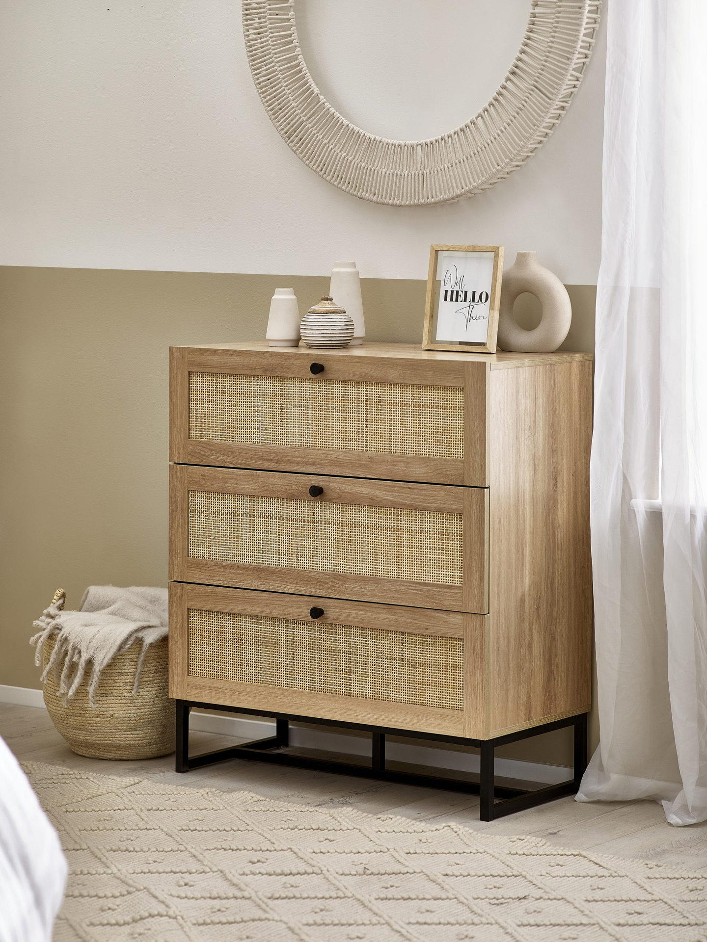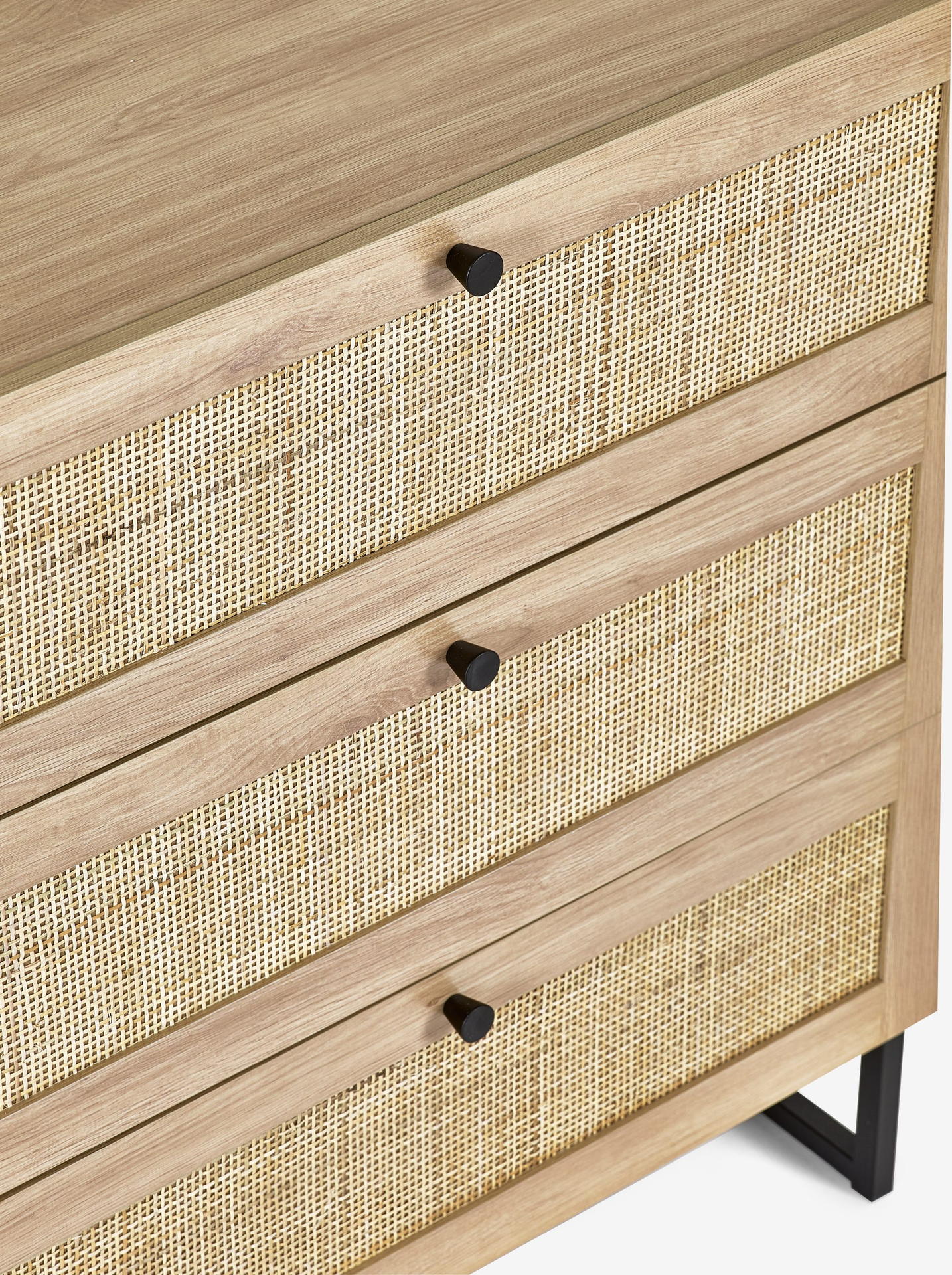 Fusing modern construction with retro design elements, the Padstow collection will exquisitely complement any styled home. The natural rattan fronts and industrial-style base collaborate perfectly to leave a warm yet chic aesthetic in your home. This range includes a bedside, 3 drawer chest, 6 drawer chest, wardrobe, coffee table, TV unit, sideboard, and tall bookcase. Also available in a black finish.