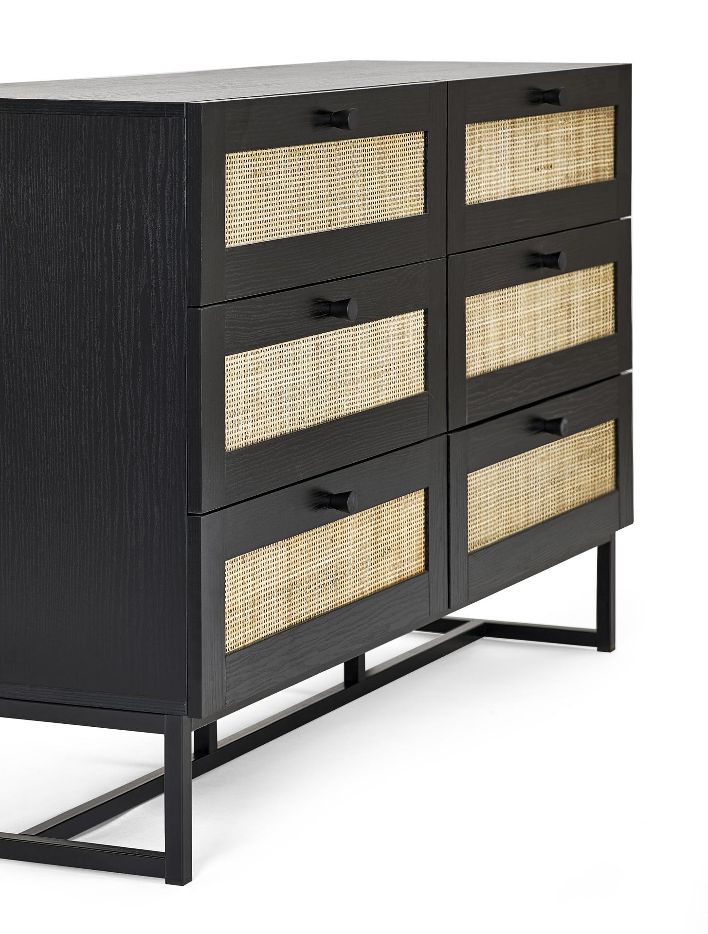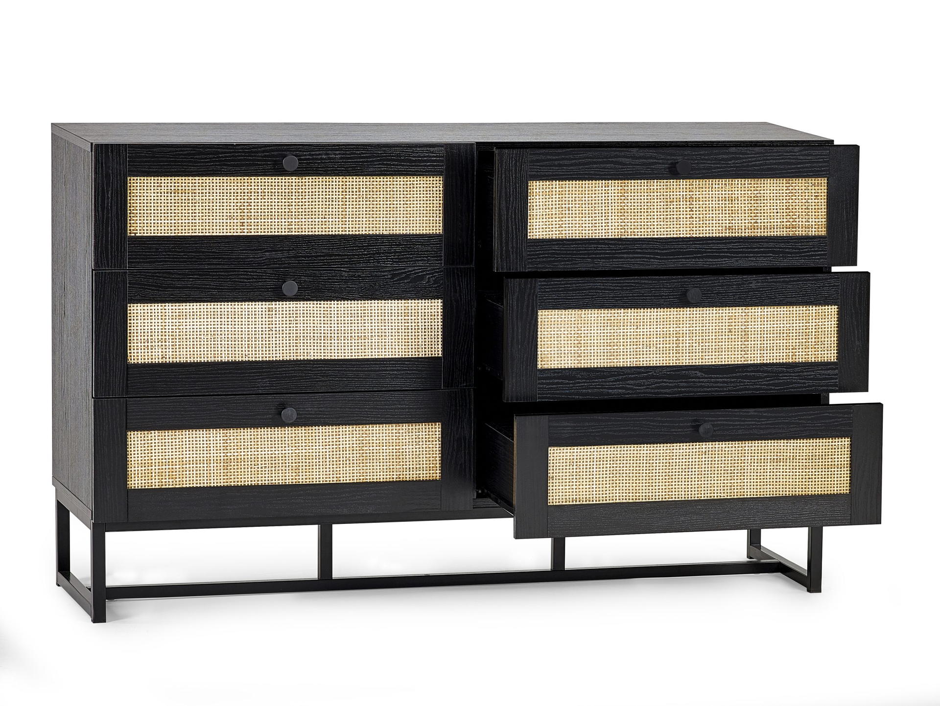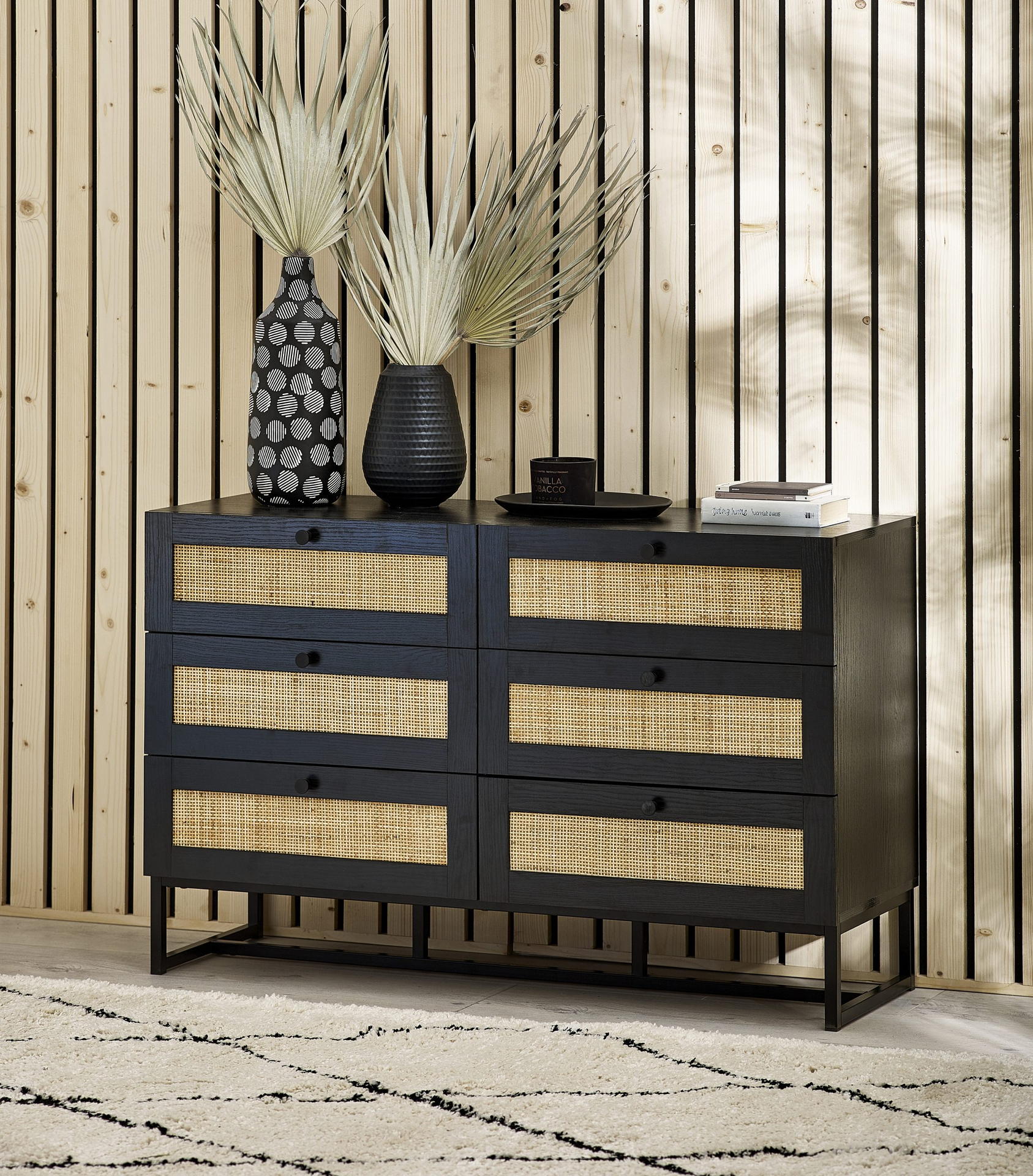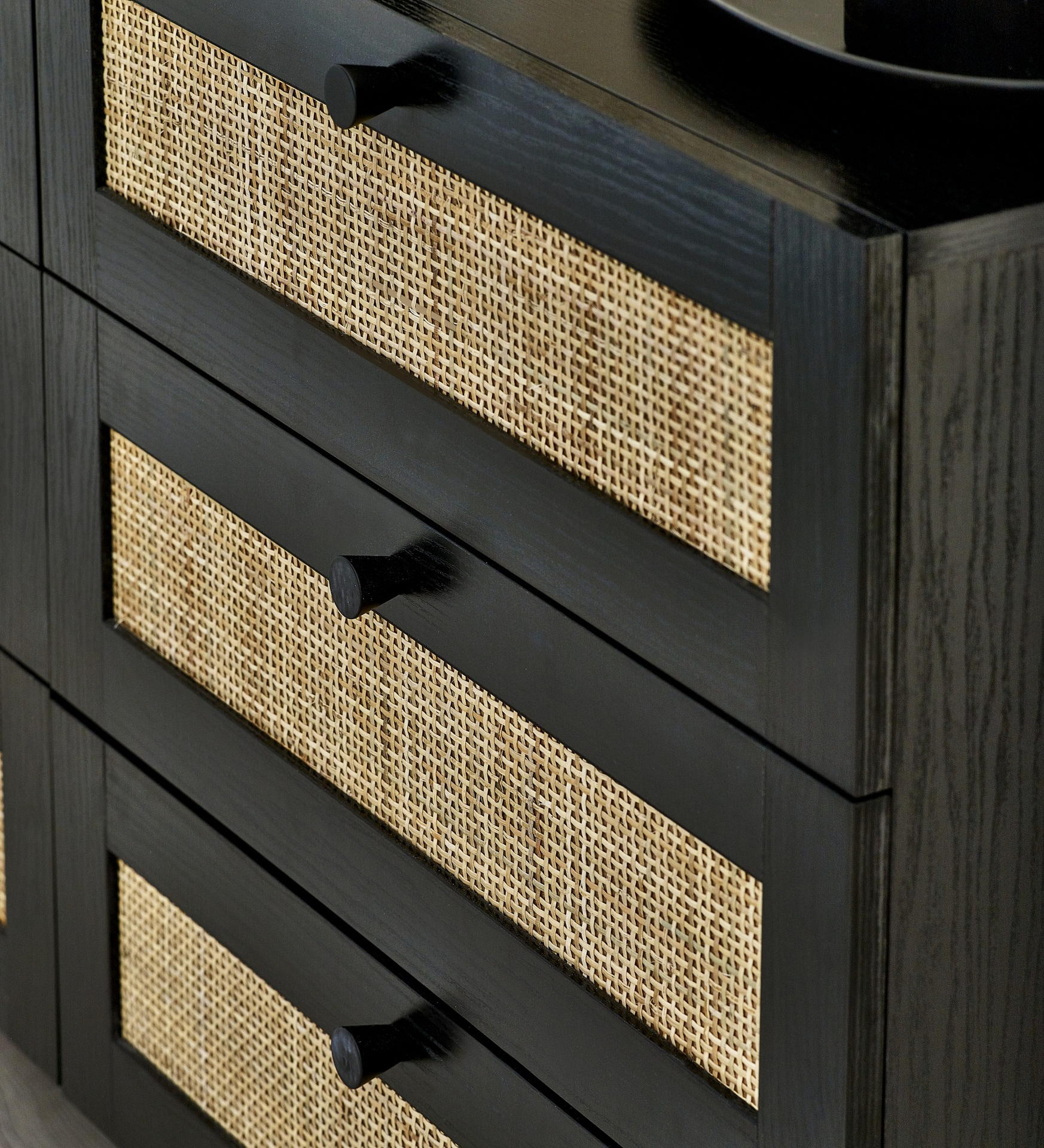 Fusing modern construction with retro design elements, the Padstow collection will exquisitely complement any styled home. The natural rattan fronts and industrial-style base collaborate perfectly to leave a warm yet chic aesthetic in your home. This range includes a bedside, 3 drawer chest, 6 drawer chest, wardrobe, coffee table, TV unit, sideboard, and tall bookcase. Also available in an oak finish.