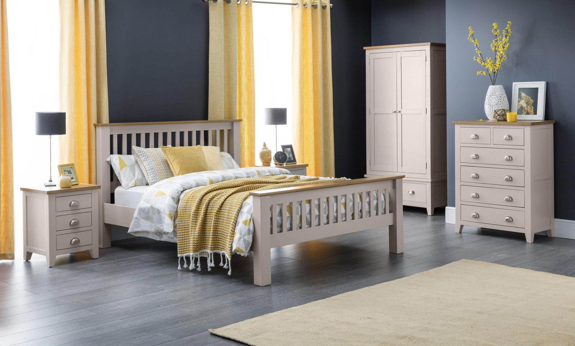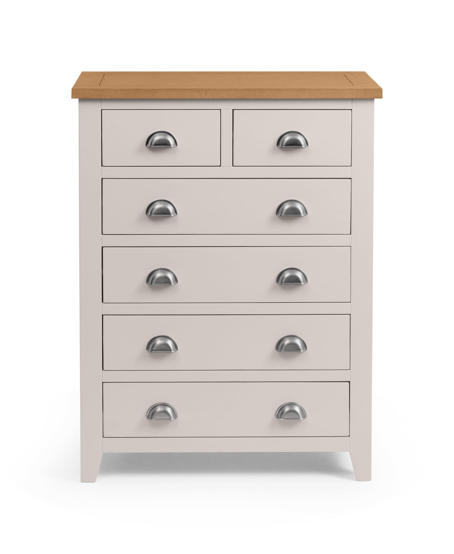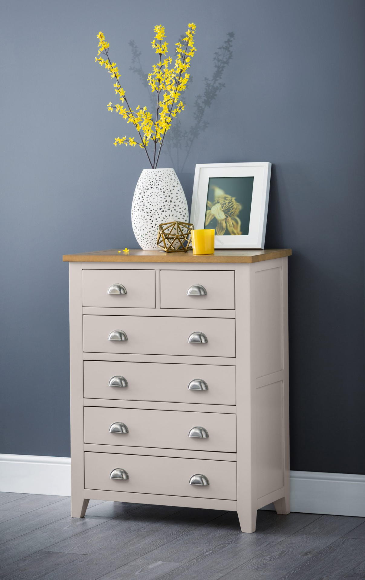 Finished in a elephant grey lacquer, the Richmond bedroom range is a timeless, elegant design suitable for a wide range of décor. Constructed from white oak and oak veneers, this lacquered bedroom range brings a modern twist on a traditional construction. Offering 2 small drawers and 4 large drawers, this 4+2 chest provides plenty of space for your clothes.