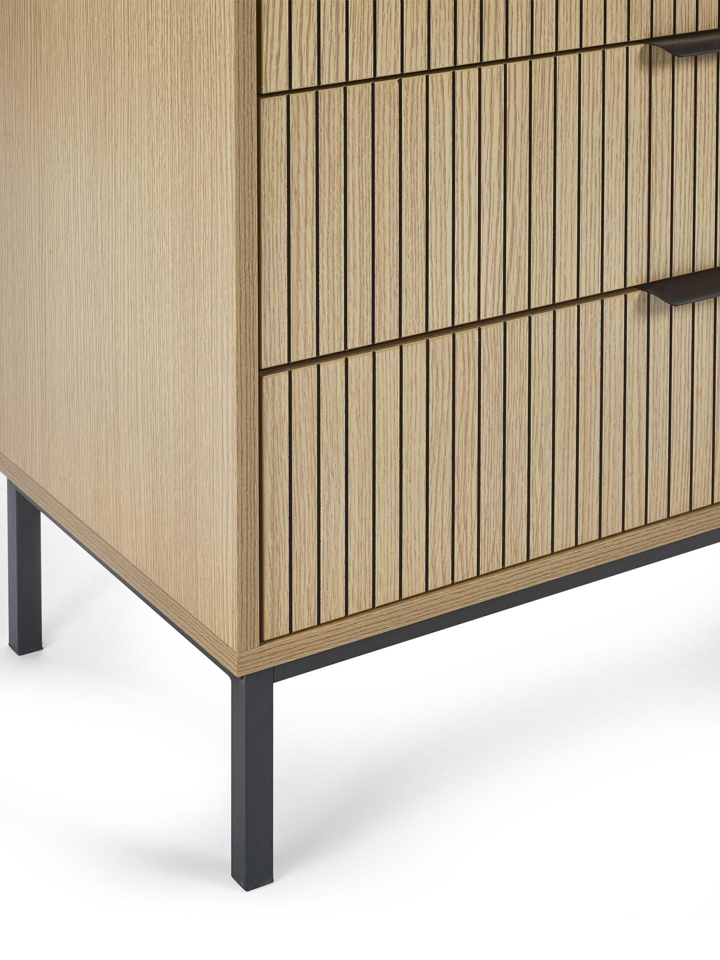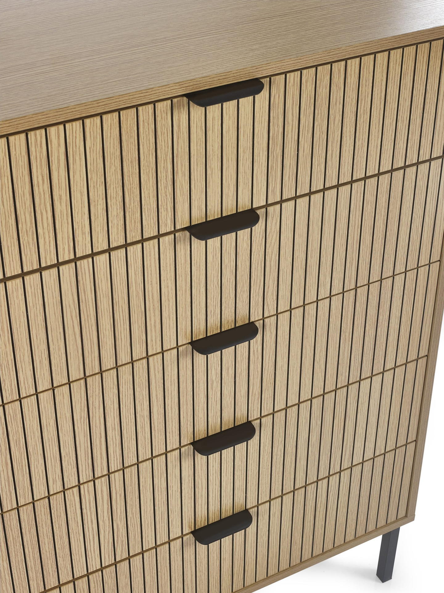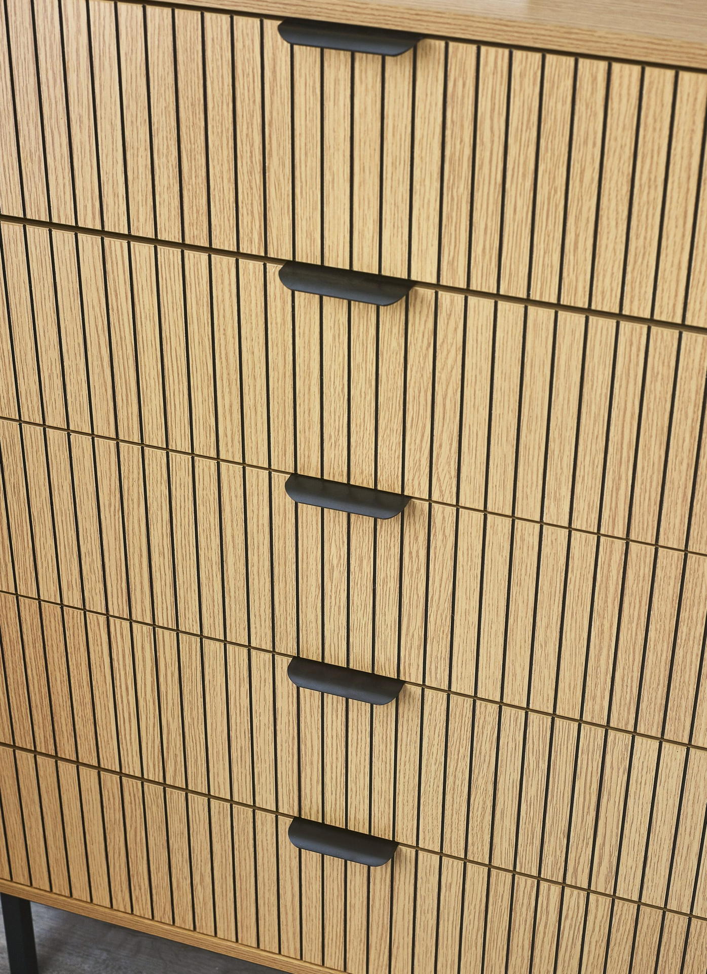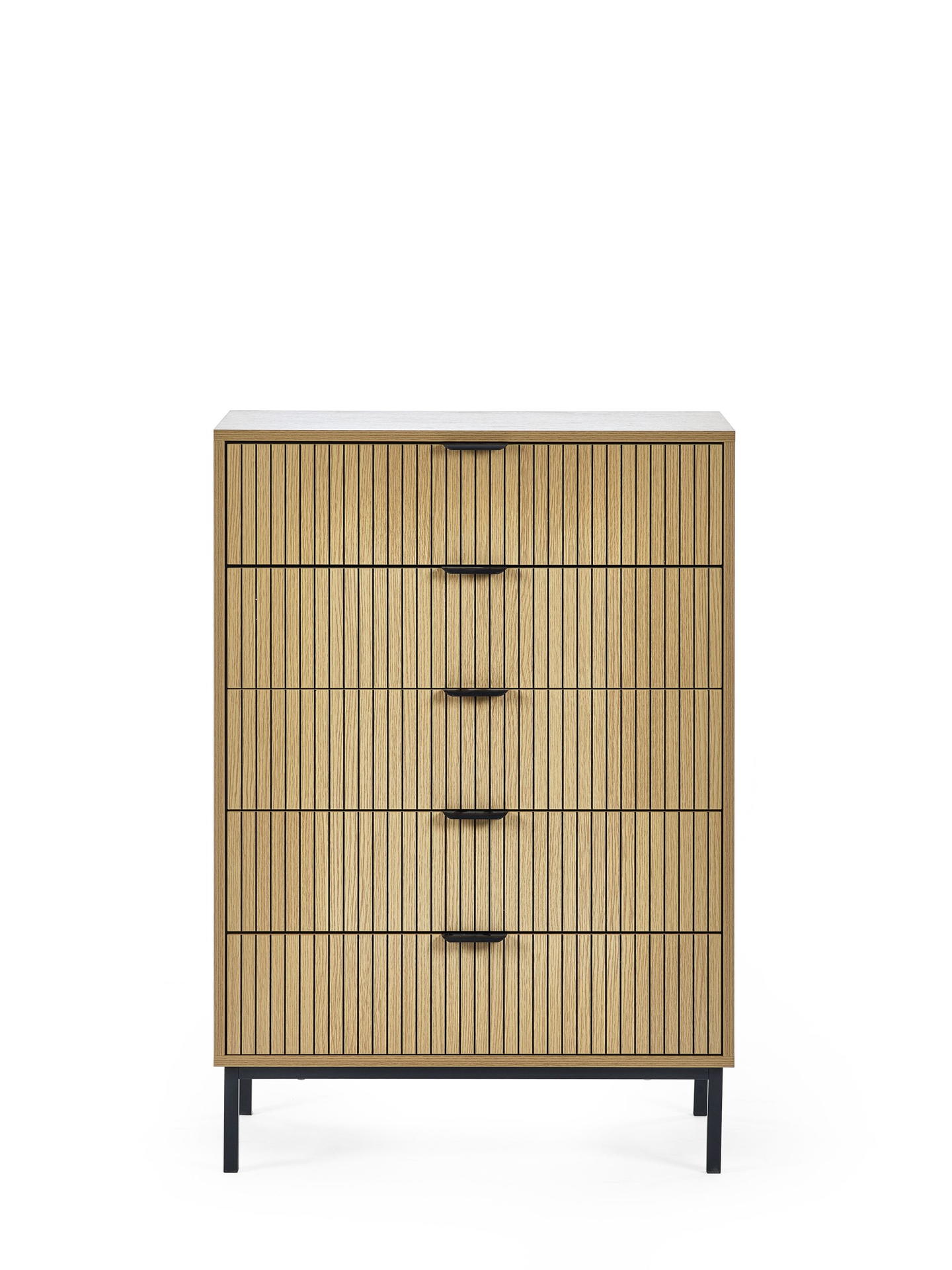 Discover the perfect blend of style and organisation with the Sia 5 Drawer Chest. This striking piece features five spacious drawers adorned with a stylish vertical slat effect, making it an eye-catching addition to your bedroom. The sleek handles provide a refined touch and make accessing your belongings effortless. Ideal for storing clothing, linens, or accessories, this chest adds a touch of sophistication to your space. The warm natural wood finish and modern black metal legs enhance its beauty while ensuring durability. Assembly is straightforward, allowing you to enjoy your new chest quickly.