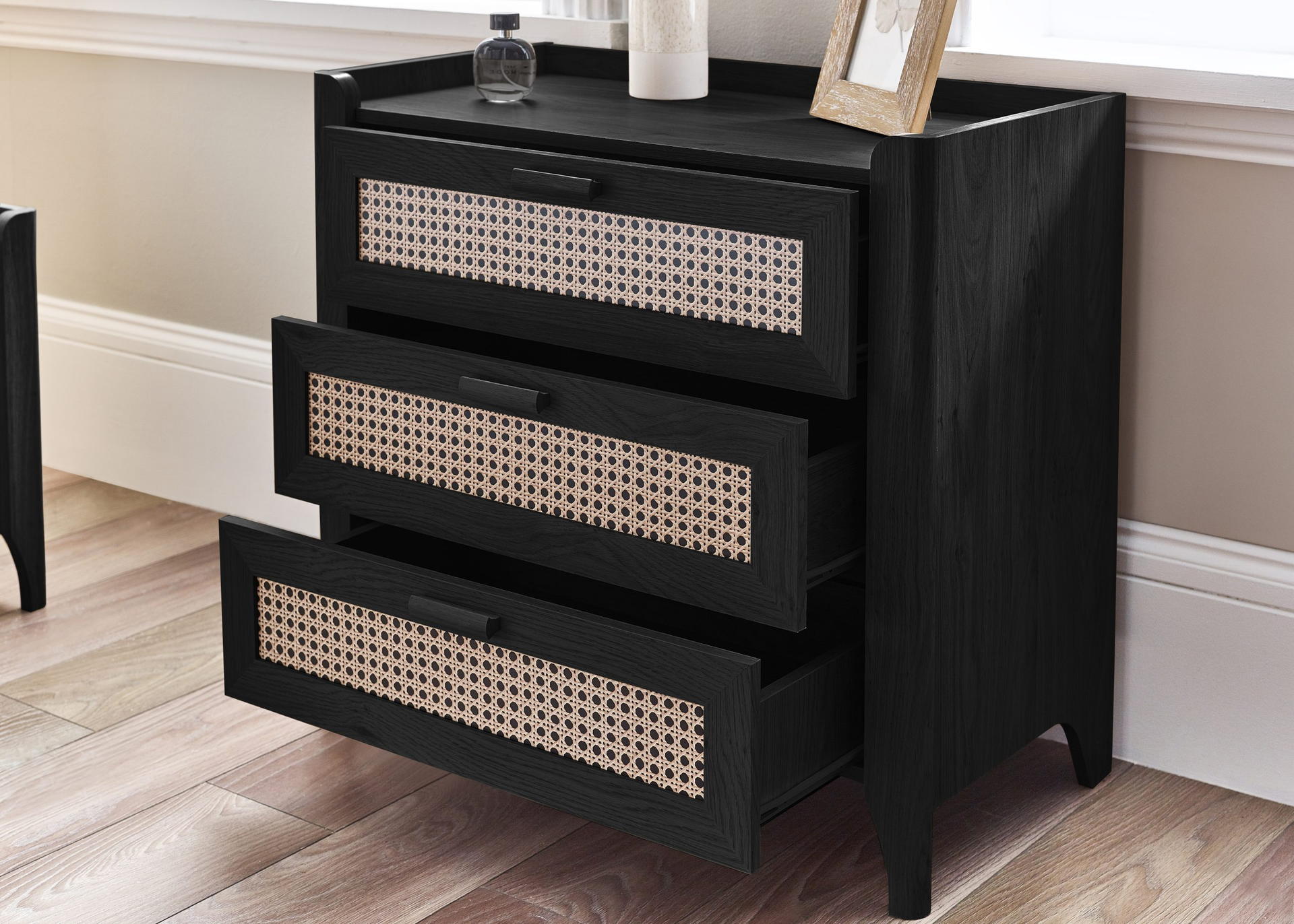 The Sydney 3 Drawer Chest in Black Ash combines sleek bohemian design with practicality. The smooth curved edges and raised lip offer both style and function, while the rattan print sticker front creates a clean, dust-free design with no gaps or holes. This chest features three spacious drawers with gloved handles for easy access, perfect for storing your essentials. Minimal assembly is required, providing a quick and easy setup to bring warmth and elegance to your home.