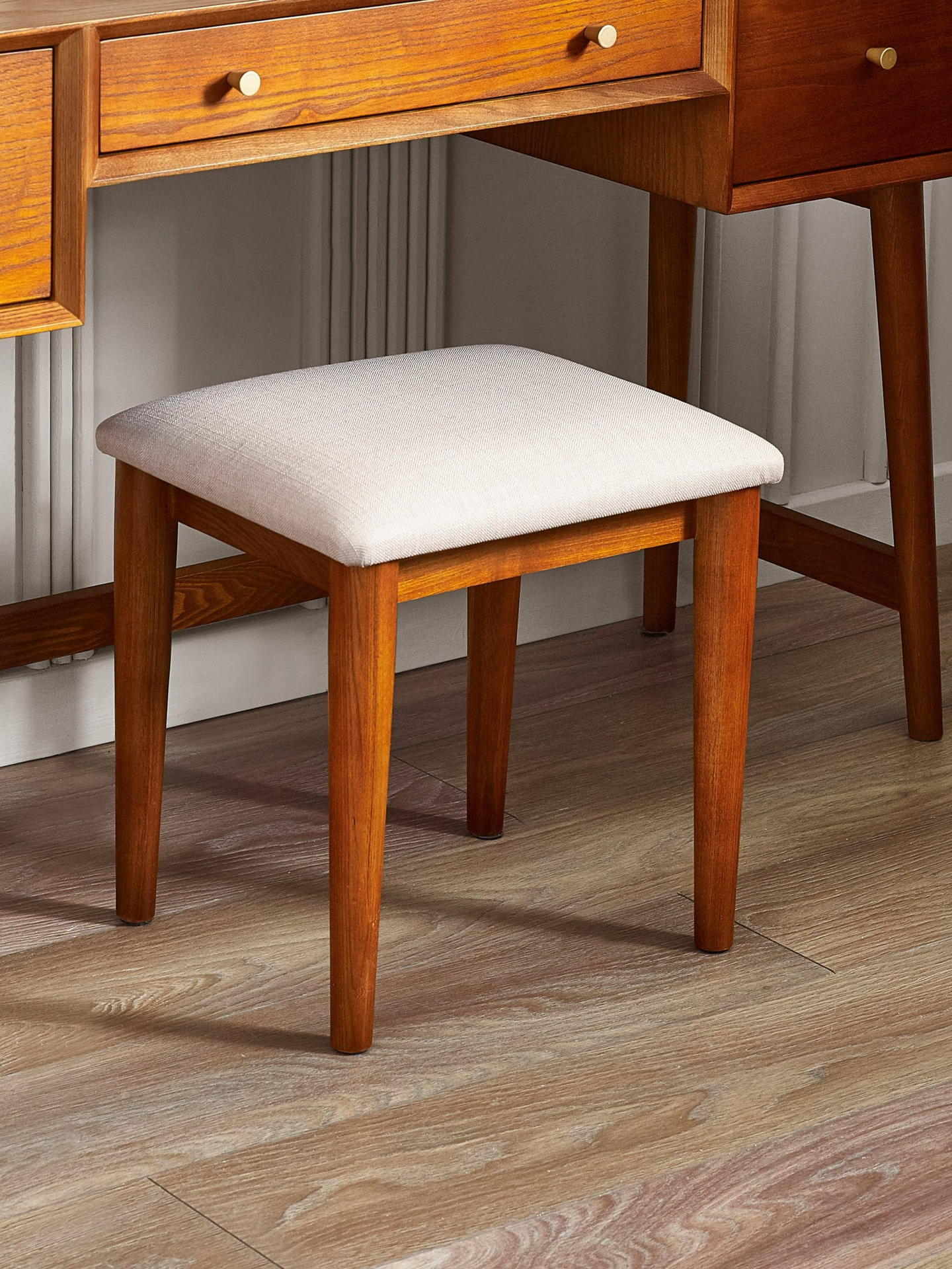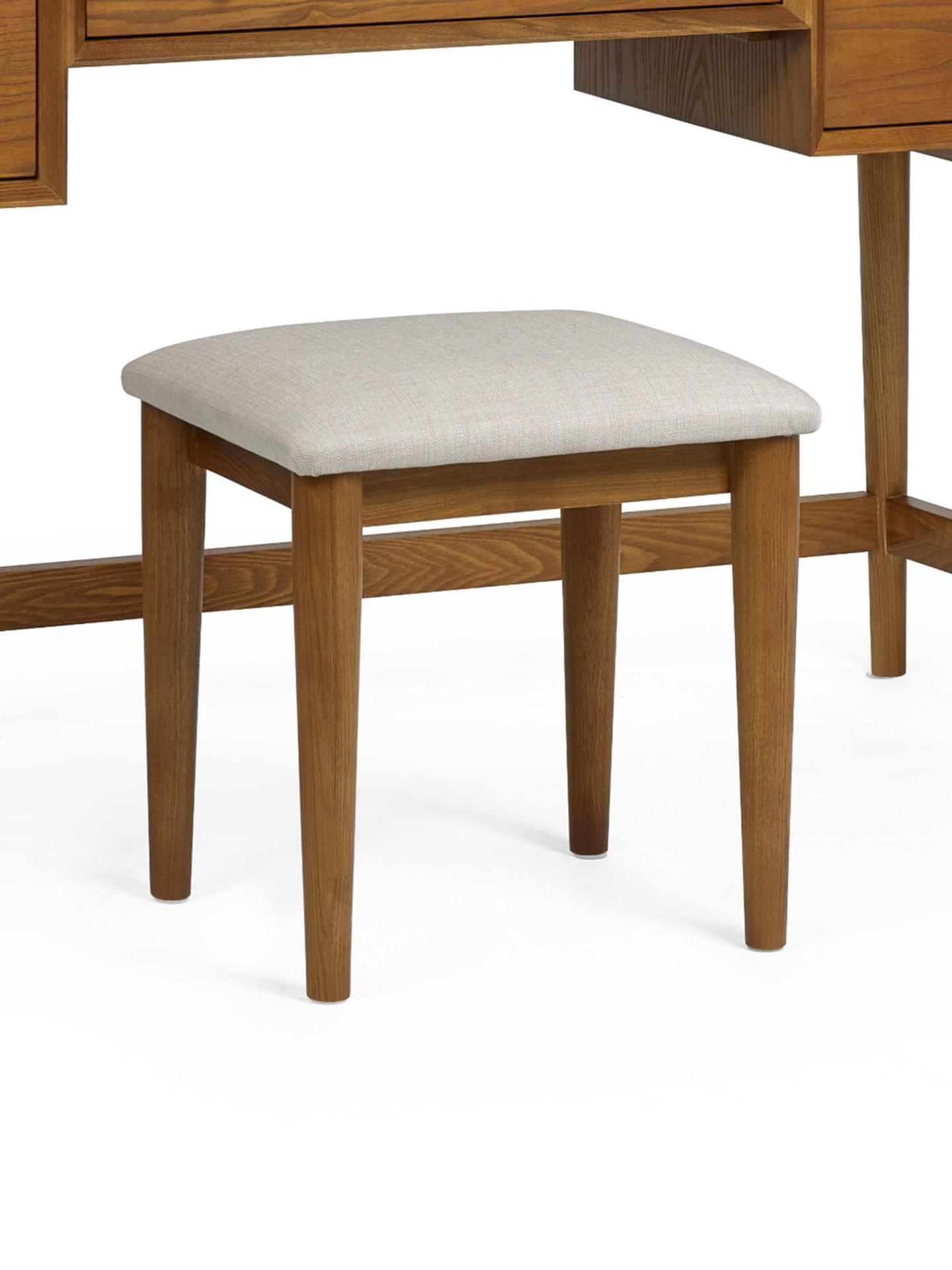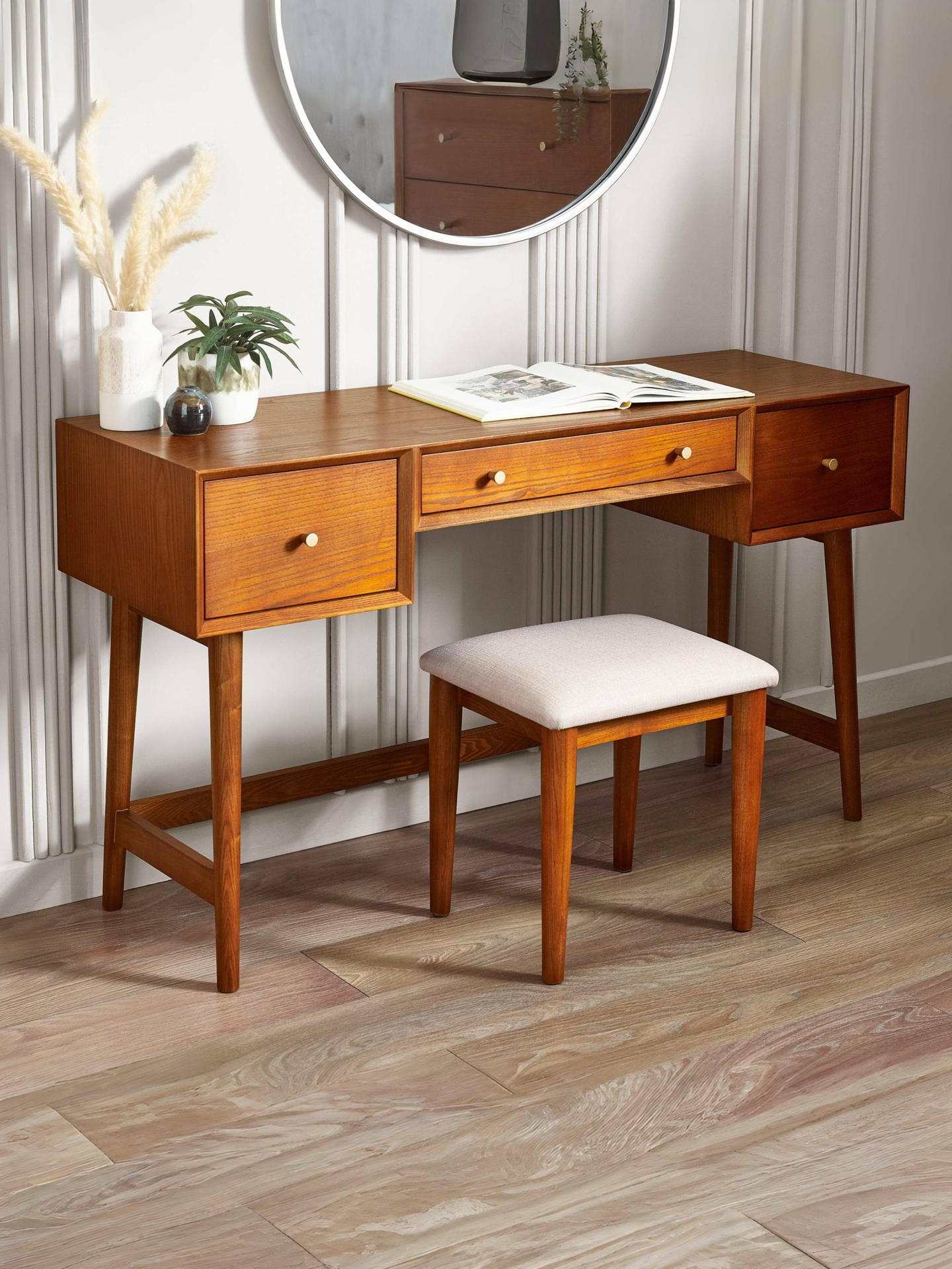 A retro-inspired style with a nostalgic feel, the Lowry Dressing Table and Stool Set adds the perfect timeless look to any bedroom space. Constructed from an exquisite cherry ash wood veneer with beautifully tapered legs. Featuring 2 wide drawers, one narrow drawer, and an upholstered padded stool. Complemented by golden frame knobs.