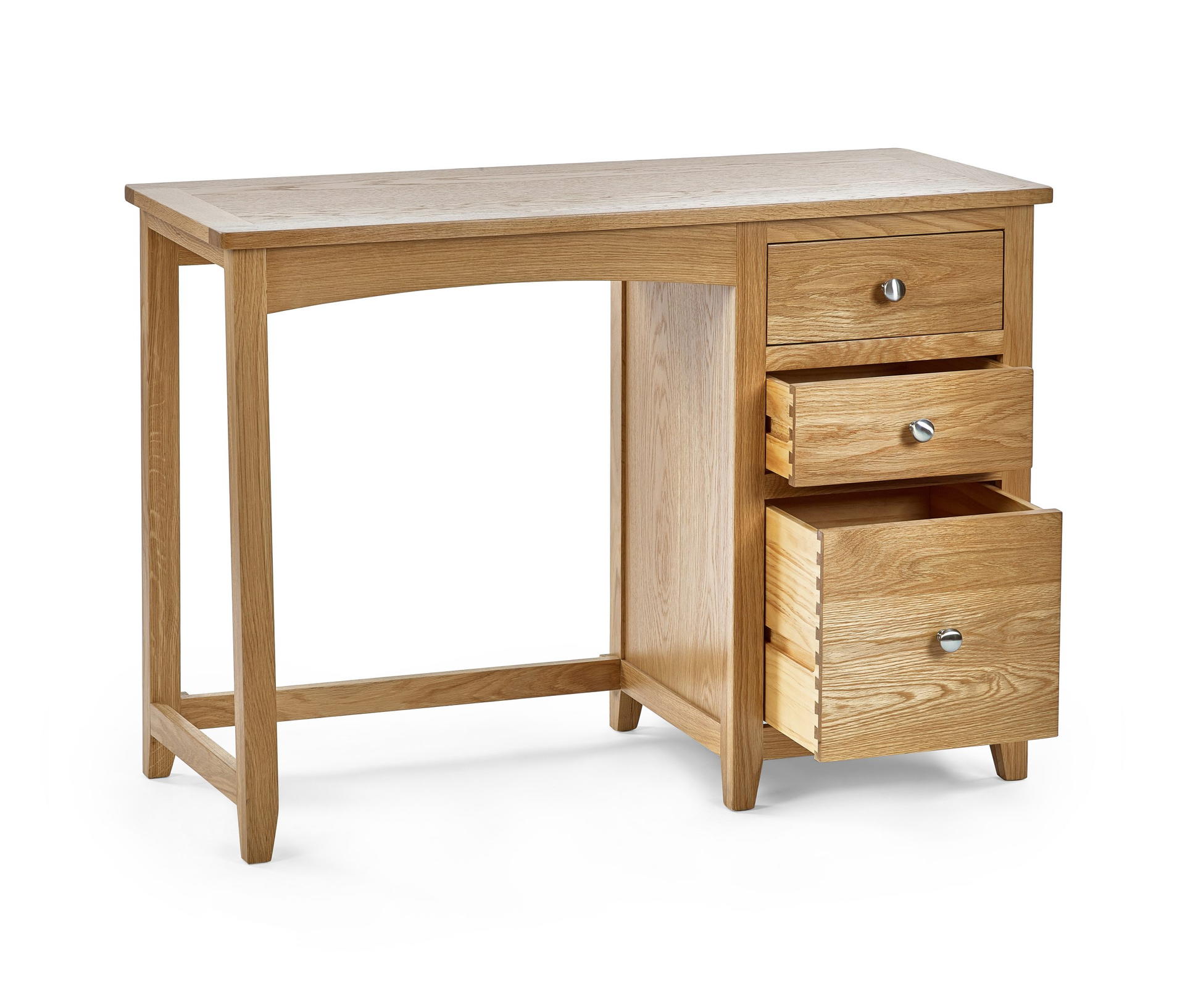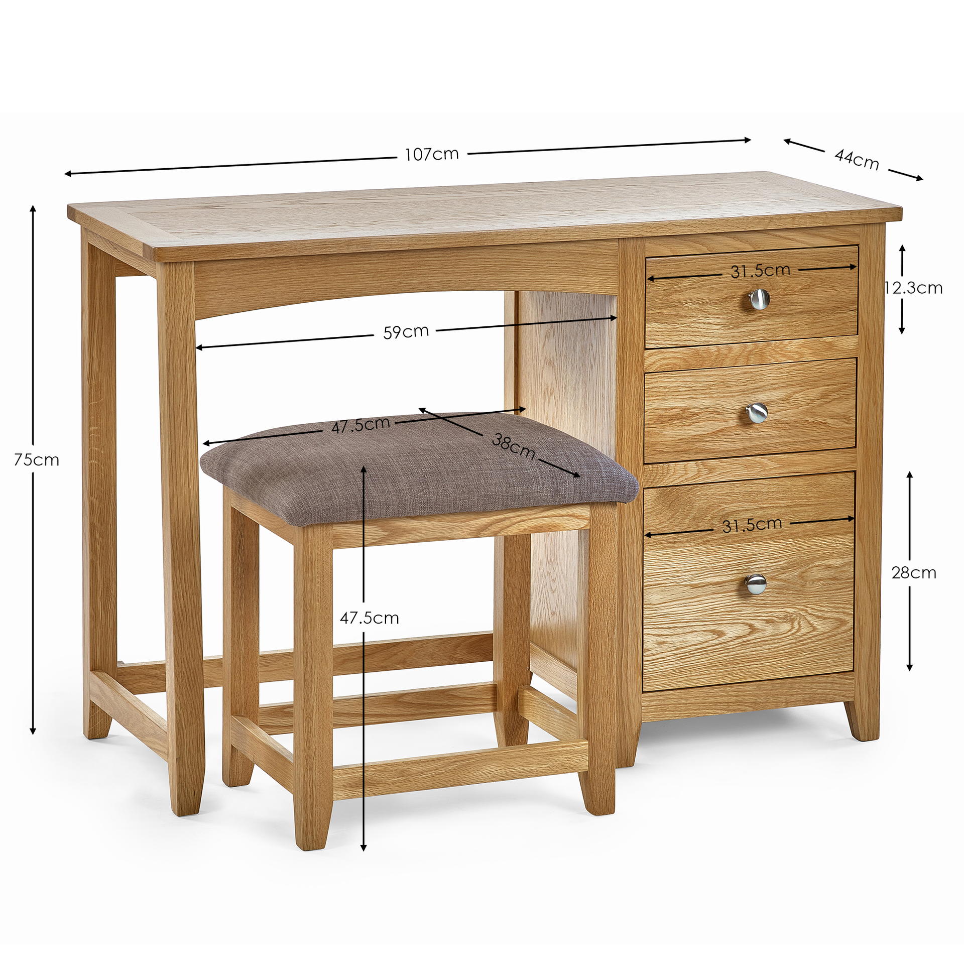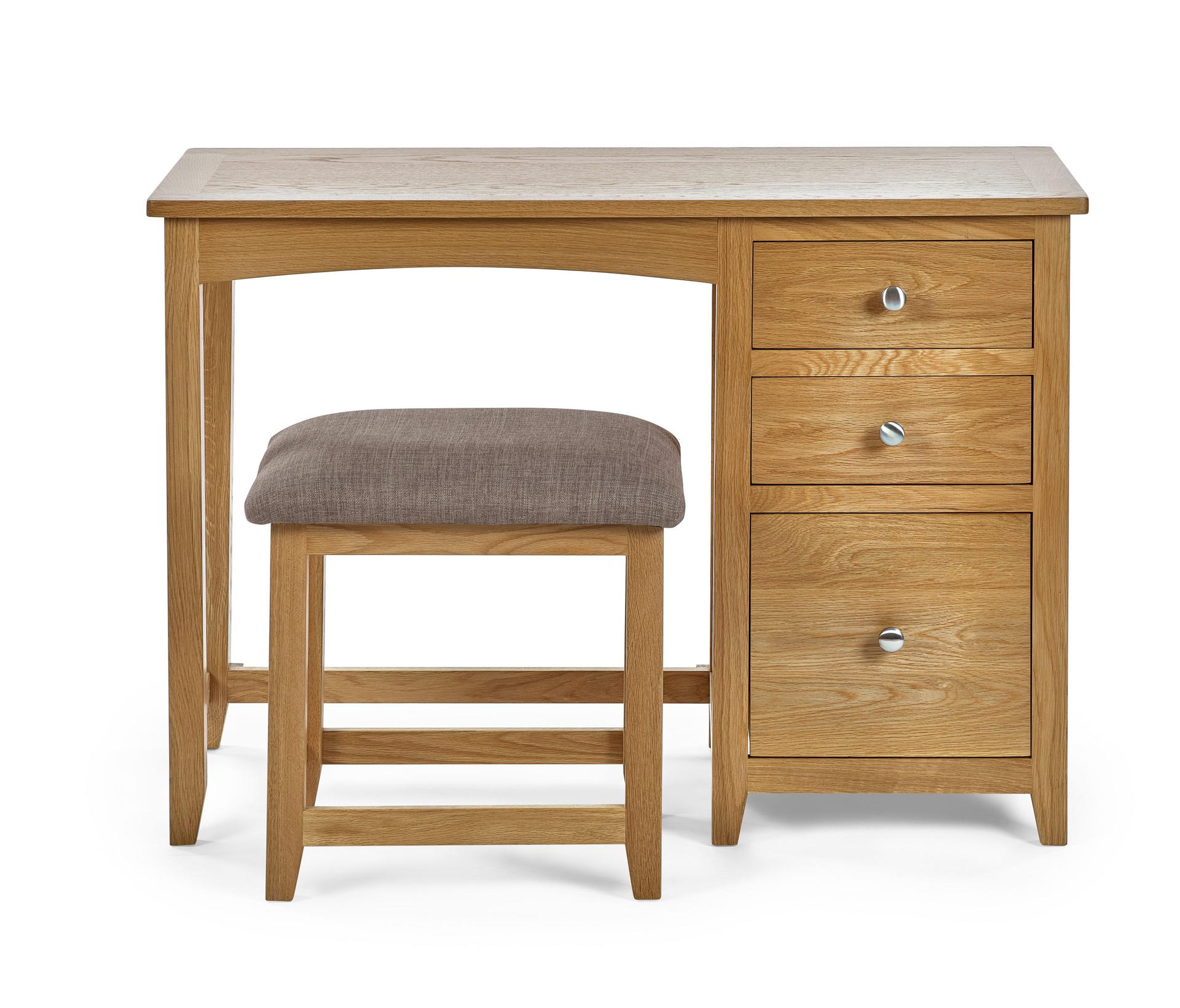 Crafted from solid oak and oak veneers this dressing table and stool set is the perfect addition to any bedroom space. Combining durability and style, with 3 generously sizes drawers providing copious amounts of storage space. Finished with round silver knobs and partnered with a comfortable and robust grey pad stool