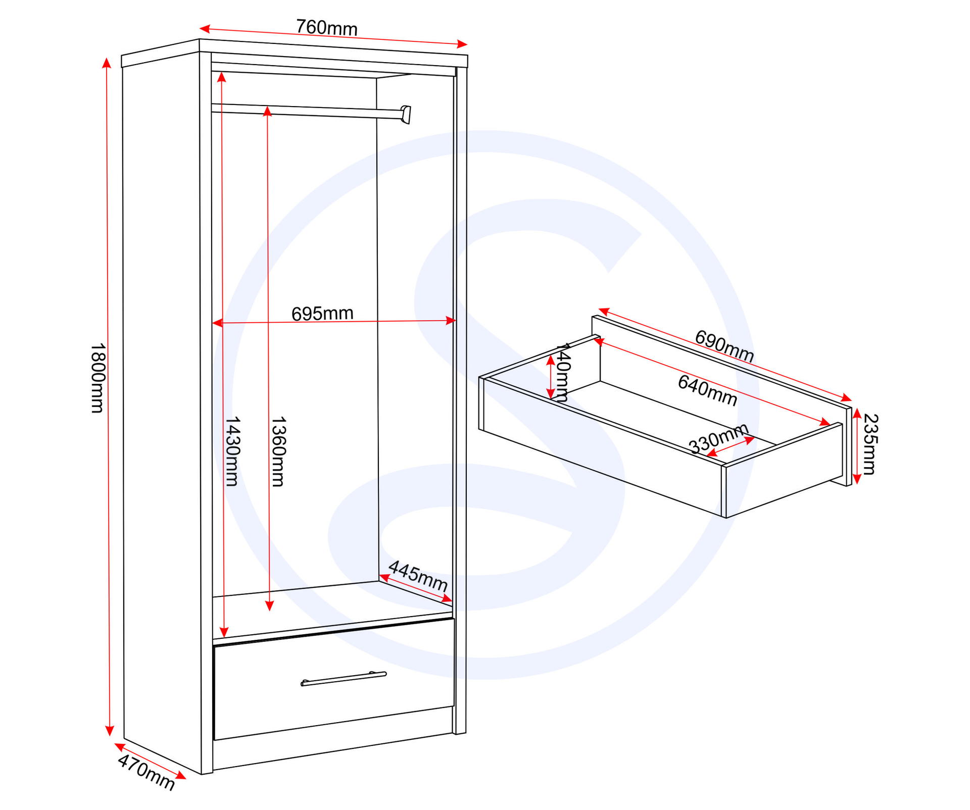 Dimensions 47010 × 76010 × 180010 cm