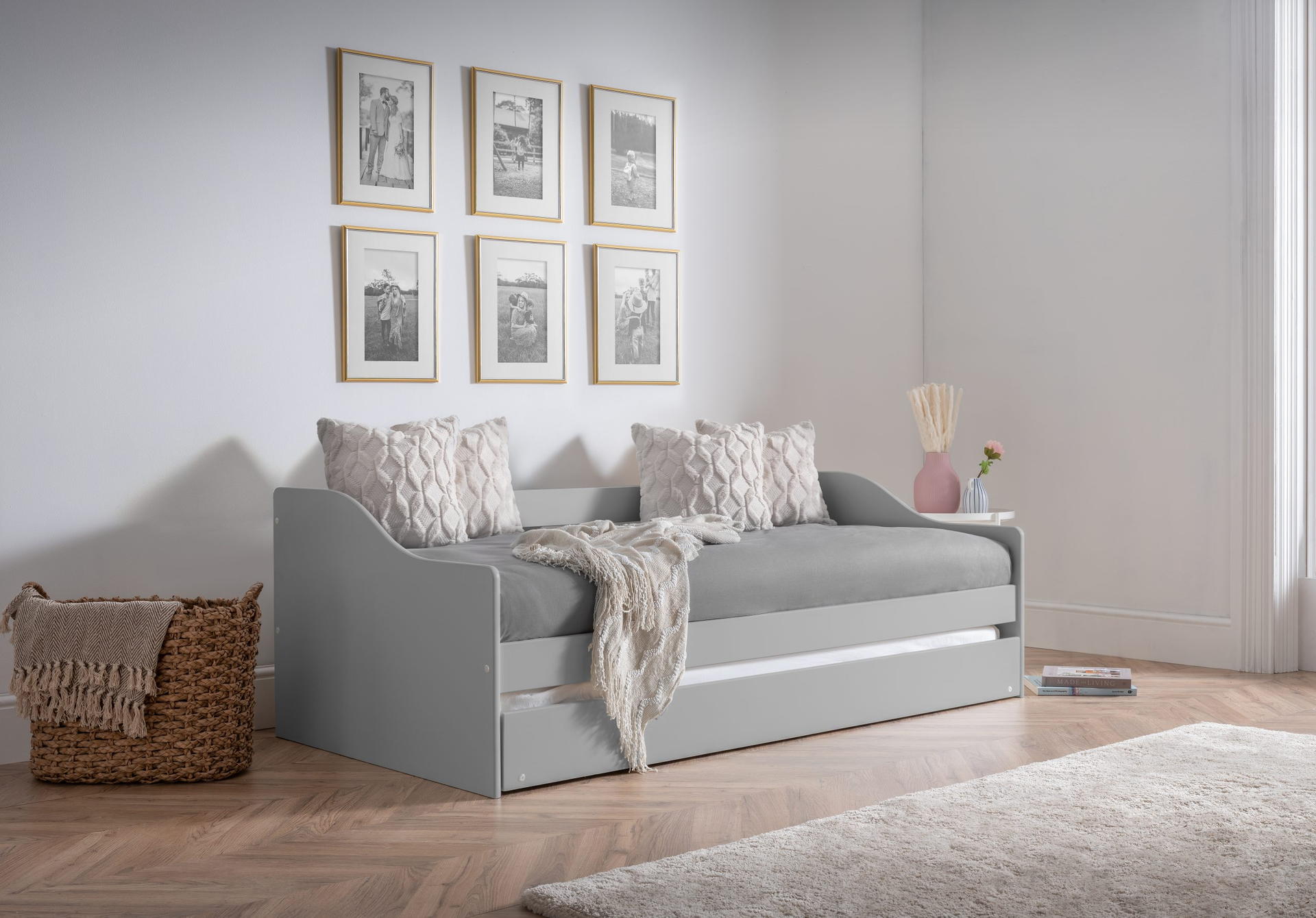 With a sleek curved design, the Elba daybed comes in three beautiful finish options of Surf White, Dove Grey, or Anthracite. Perfect for casual use, or as a guest bed with the classic pull out underbed.