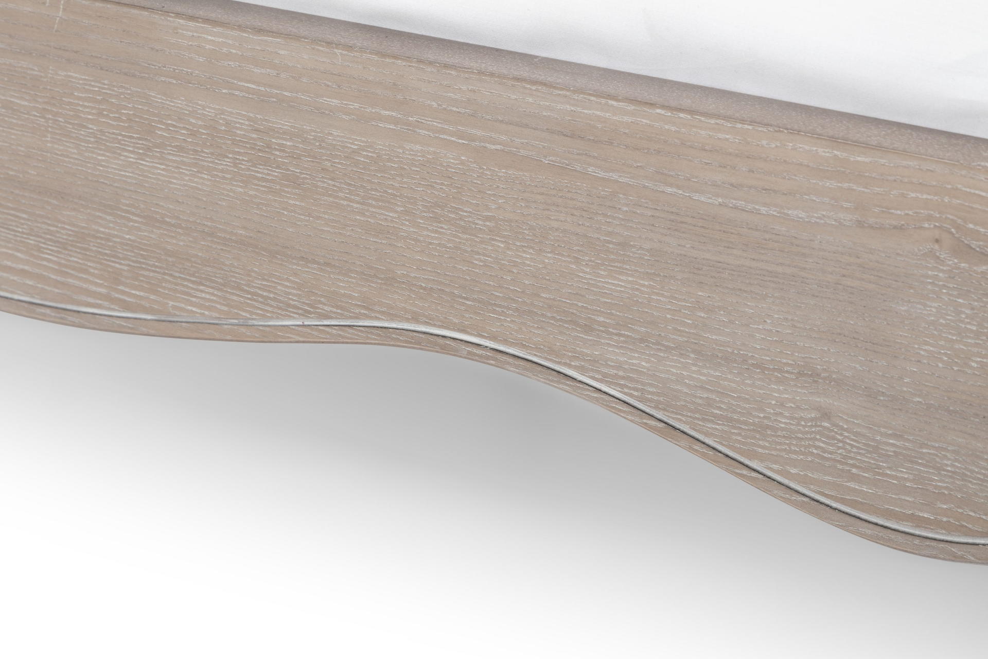 Limed oak frame with an upholstered linen headboard.
