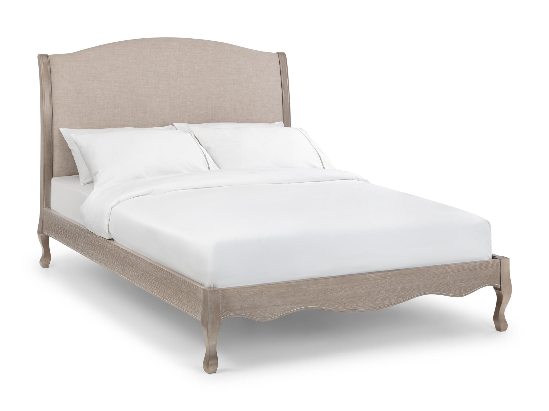 Inspired from a classic French design, the Camille bed excels in elegance. Featuring traditional ornate details, from the curved and arched headboard, to a scalloped footboard with cabriole legs, this bed is the definition of a timeless design. The frame is finished in a limed oak effect, with a soft upholstered headboard covered in an oatmeal linen fabric. The Camille Bed is available in 135cm Double, 150cm King, and 180cm super king sizes.