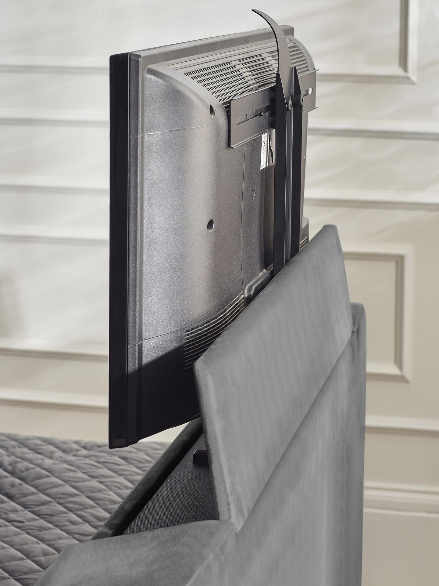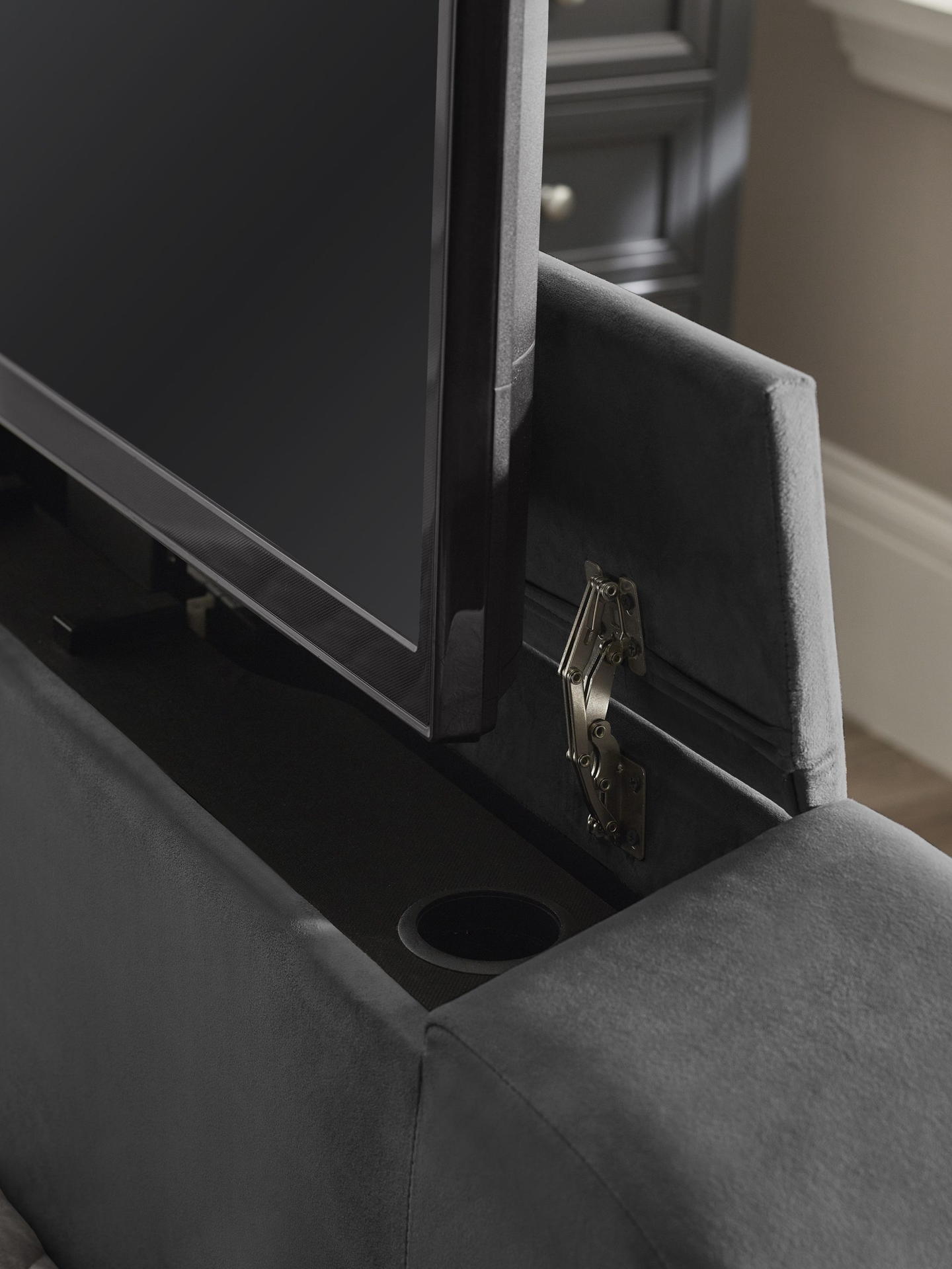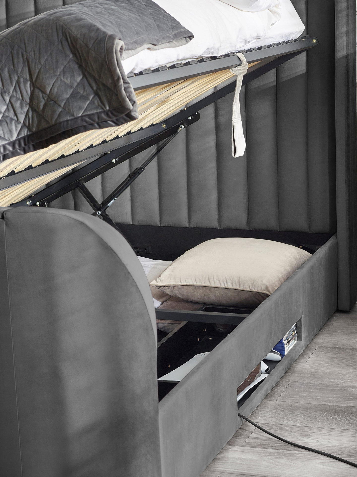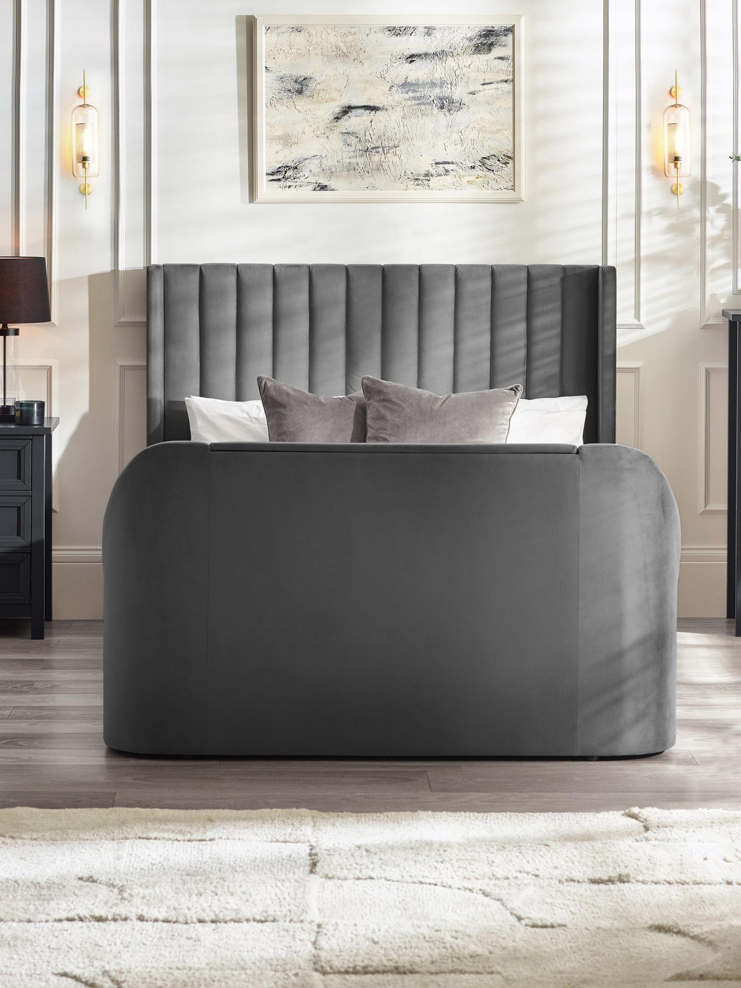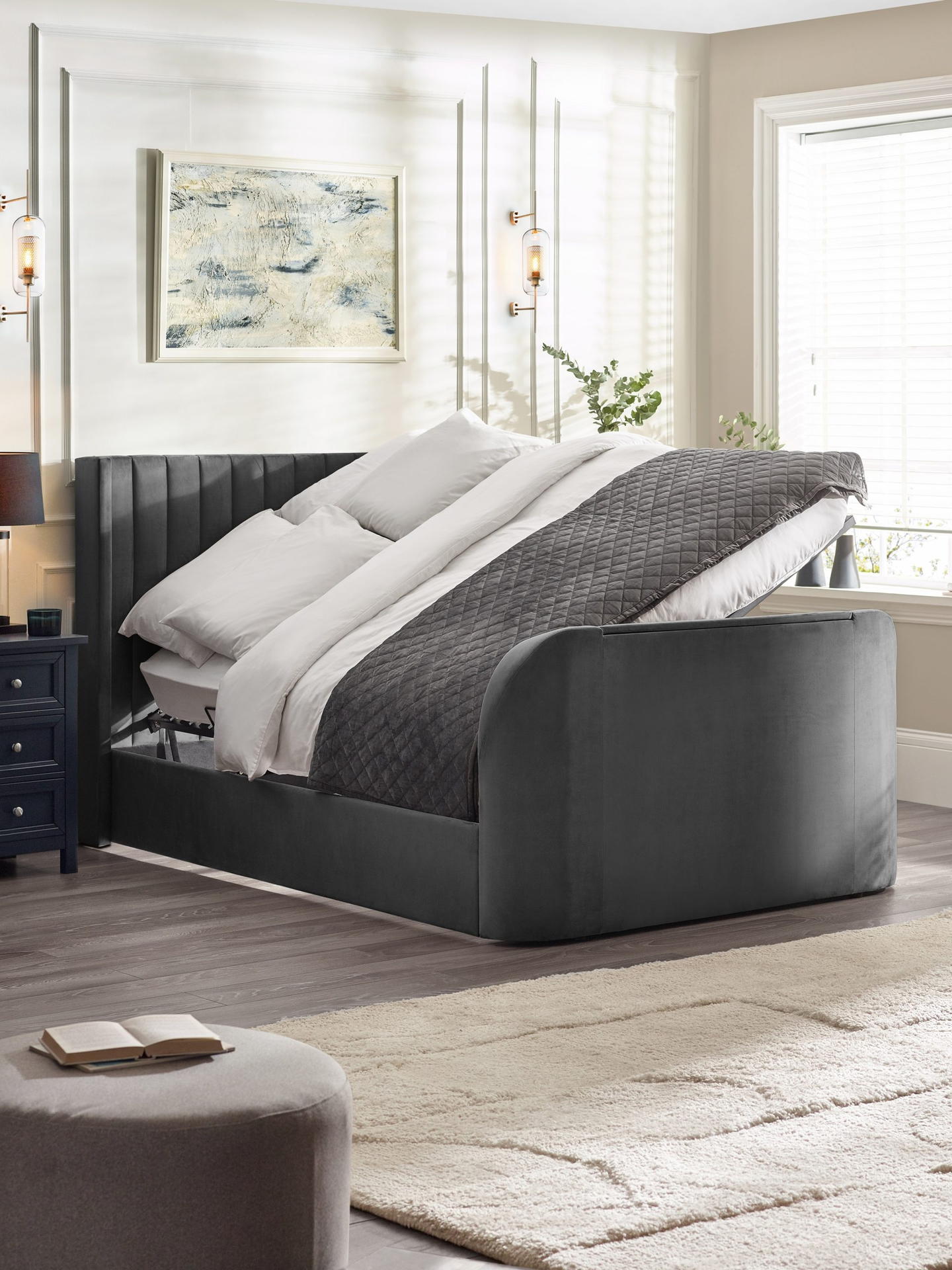 Indulge in luxury and functionality with the Clara Ottoman TV Bed in Dark Grey. This contemporary bed frame features a stylish paneled design, upholstered in a rich dark grey fabric that adds sophistication to any bedroom. The side-lift ottoman provides convenient storage space, including a drawer, and with the included remote control, you can effortlessly raise and lower the bed to accommodate a 43-inch TV. Minimal assembly ensures you’ll be enjoying your new entertainment space in no time.