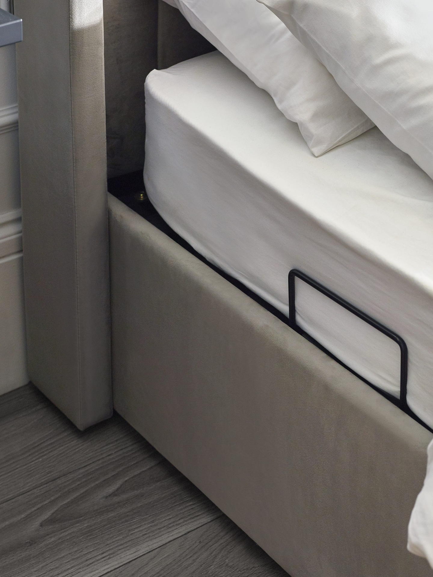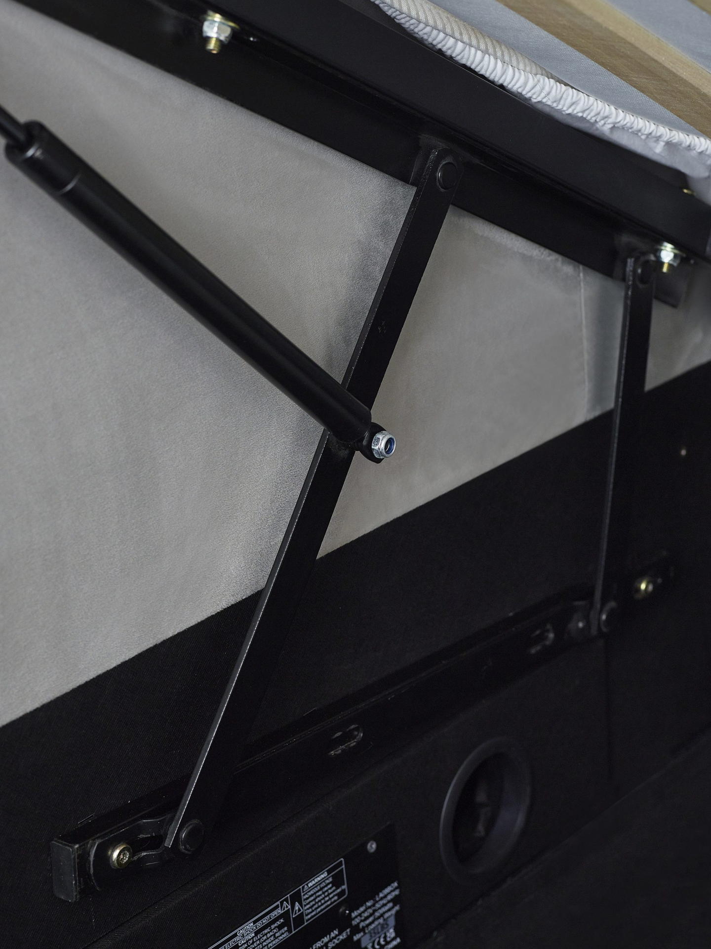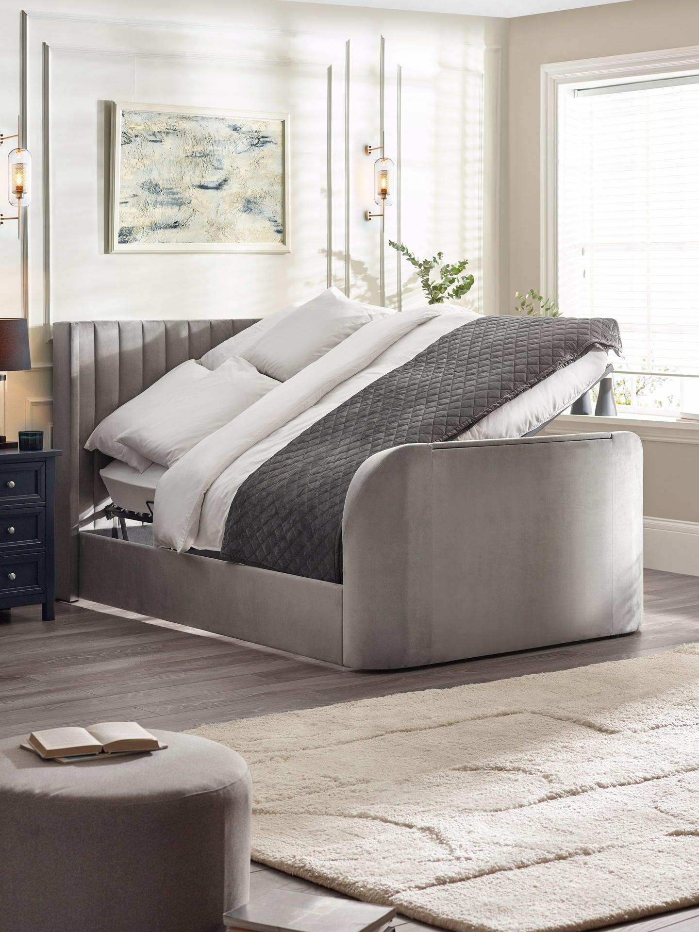 Upgrade your bedroom with the Clara Ottoman TV Bed, where comfort meets modern convenience. Upholstered in soft light grey fabric, this bed features a sleek, paneled design that complements any decor. The side-lift ottoman provides easy access to generous storage, and the included drawer offers even more space to store your essentials. With a convenient remote control, effortlessly raise and lower the bed to accommodate a 43-inch TV, transforming your space into an entertainment haven. Minimal assembly is required, allowing you to quickly enjoy both style and functionality.