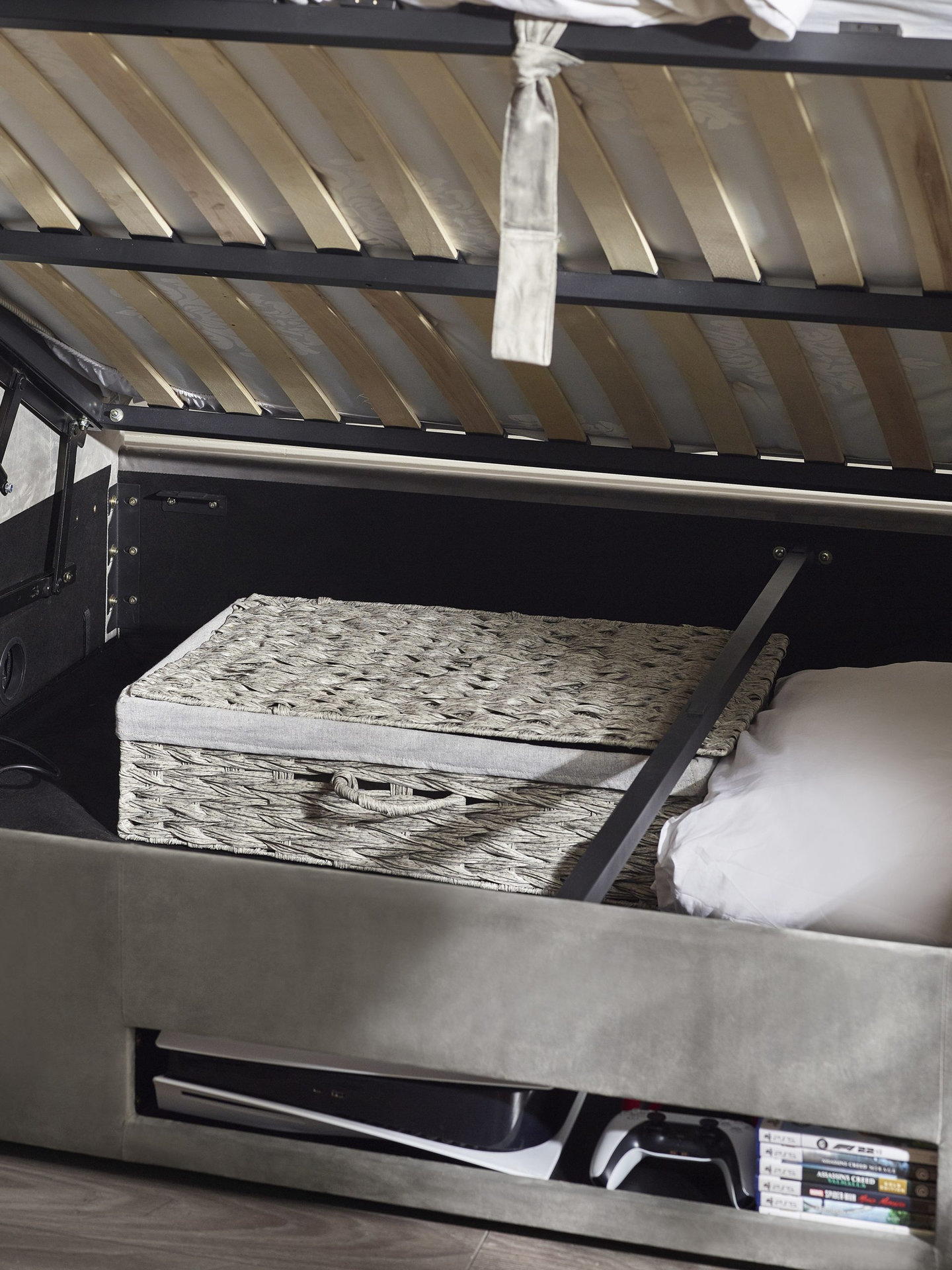 Practical side-lift ottoman for extra storage.