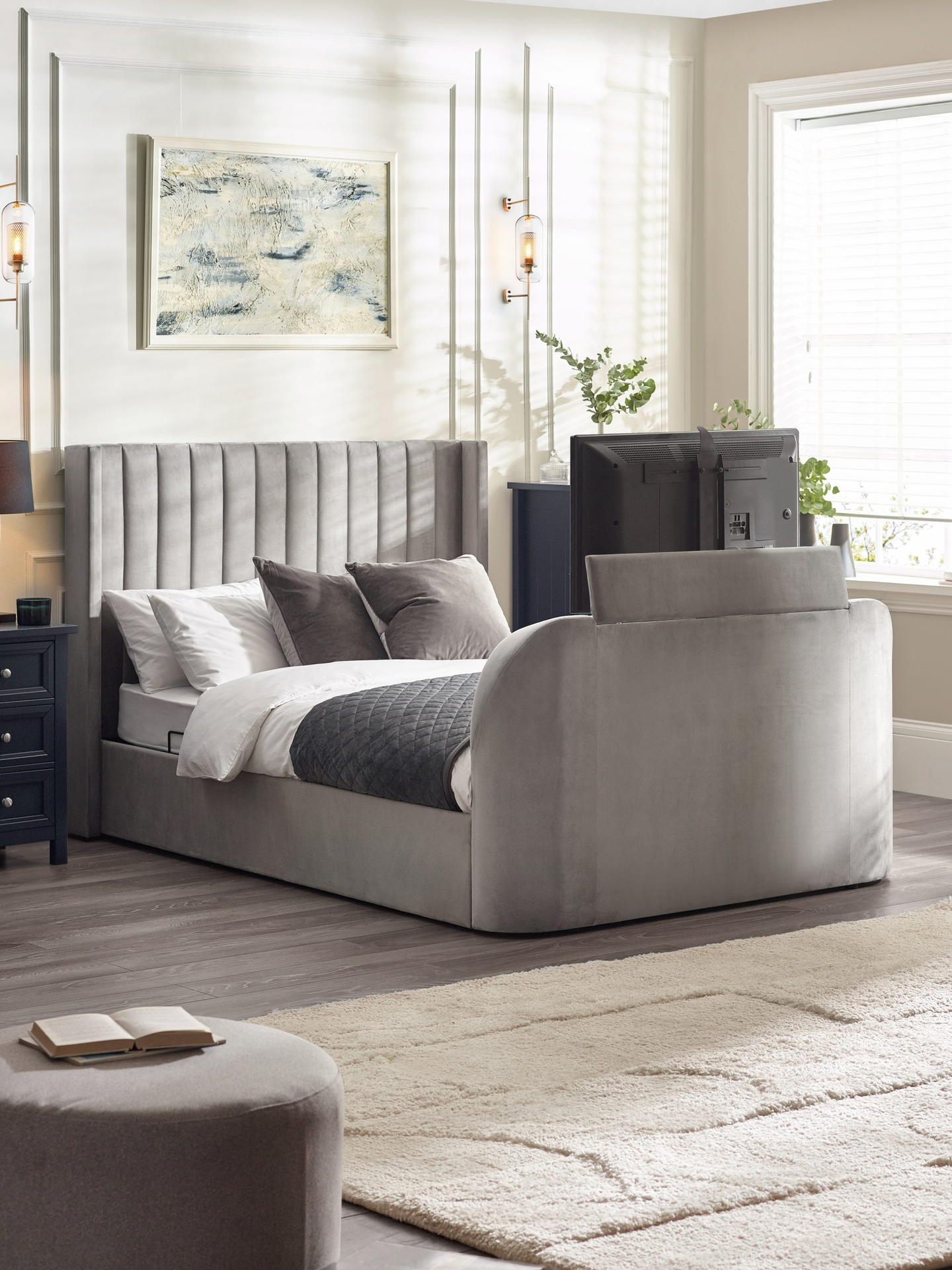 Elevate your bedroom with the Clara Ottoman TV Bed in Light Grey, designed to blend luxury and practicality. The modern upholstered frame with a sophisticated paneled design brings both style and practicality. The side-lift ottoman features ample storage space, along with a convenient drawer for added storage. The remote control allows you to easily raise and lower the bed to fit up to a 43-inch TV. With simple assembly, you can quickly enjoy the perfect combination of comfort, organisation, and entertainment in your home.